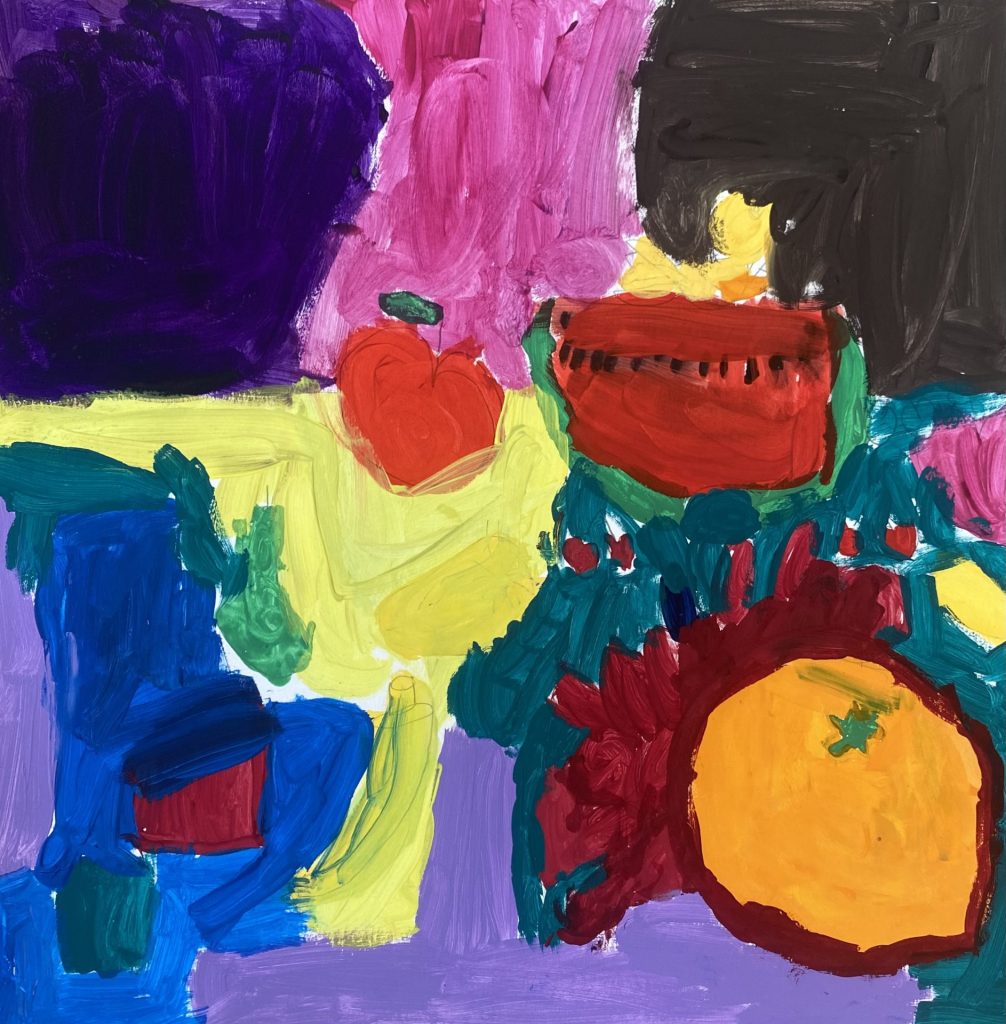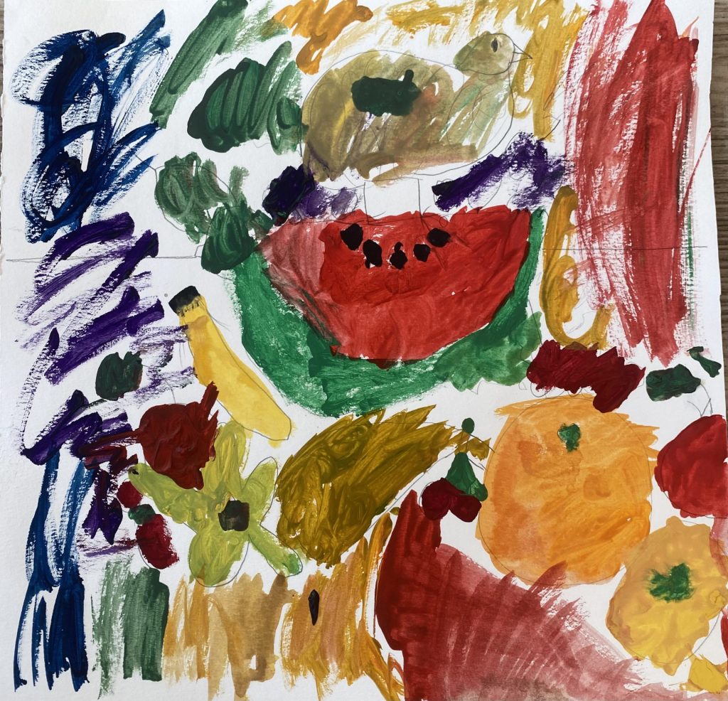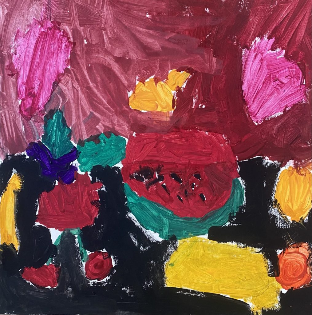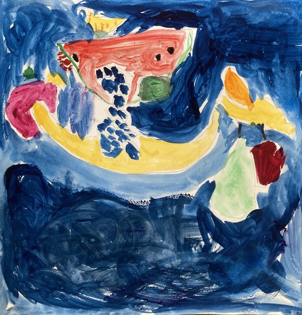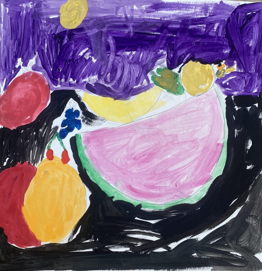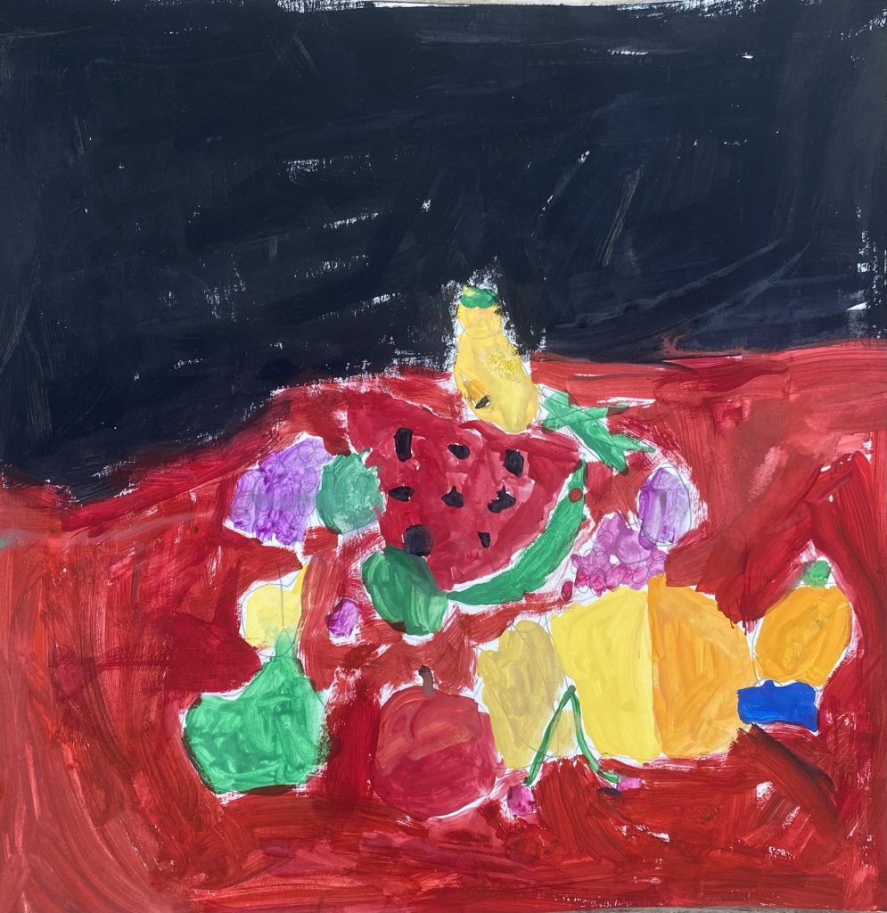 The lower elementary students made their own Frida Kahlo inspired still life paintings. We talked about what a still life is, and how artists used different objects in their work to symbolize the feelings of their art. An assortment of fruit was laid out in the middle of the table. Everyone had to draw the fruit exactly how they saw it from their point of view. Then, the students then used gouache paint to add the color to their paintings, and they were finished!