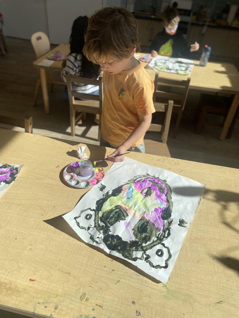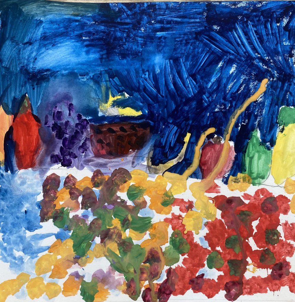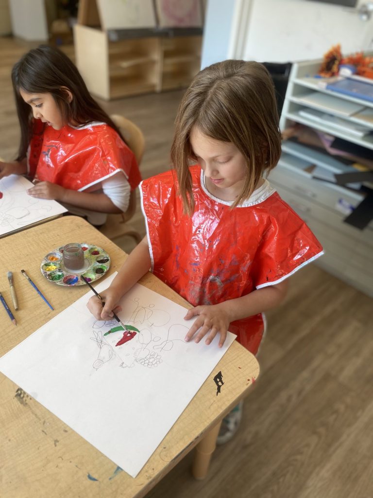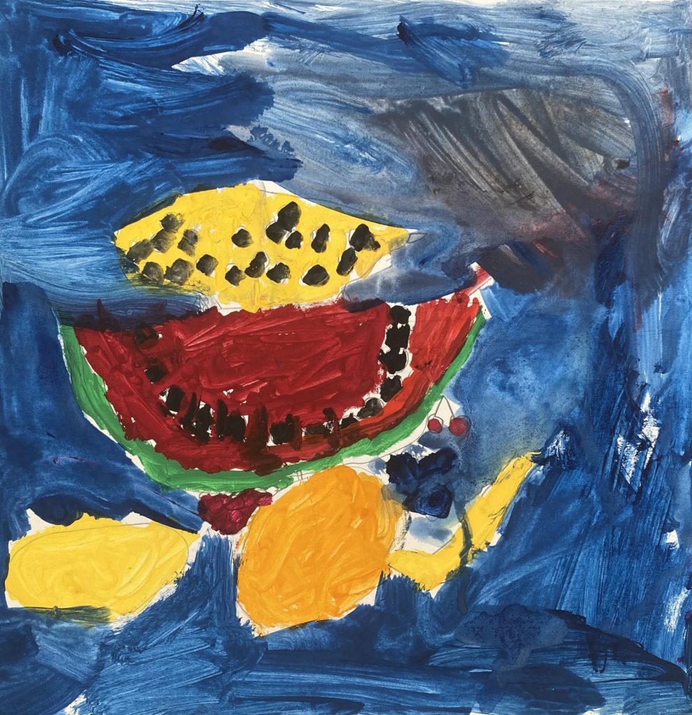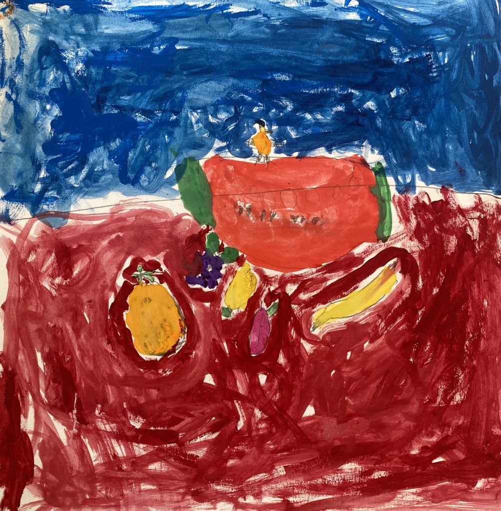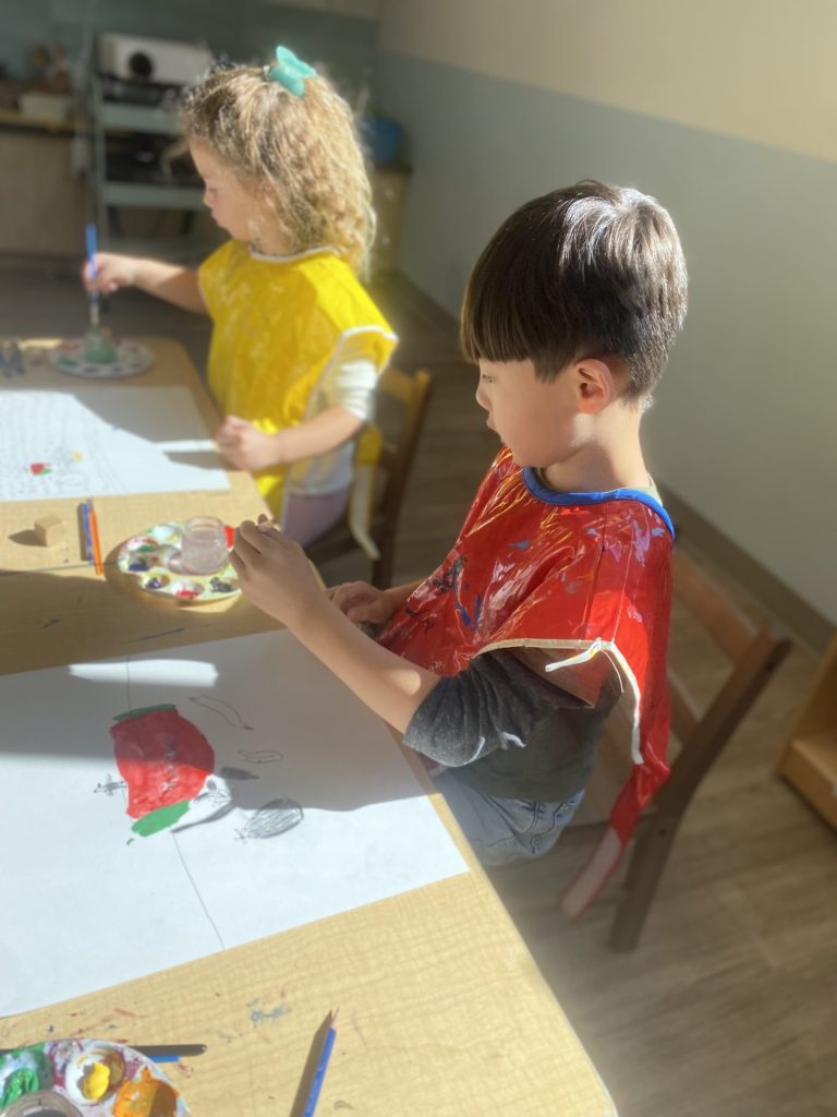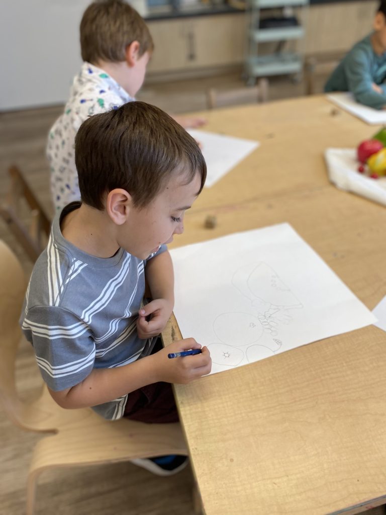 The lower elementary students made their own Frida Kahlo inspired still life paintings. We talked about what a still life is, and how artists used different objects in their work to symbolize the feelings of their art. An assortment of fruit was laid out in the middle of the table. Everyone had to draw the fruit exactly how they saw it from their point of view. Then, the students then used gouache paint to add the color to their paintings, and they were finished!