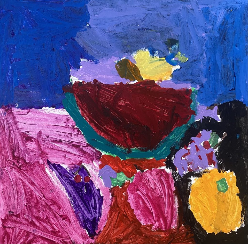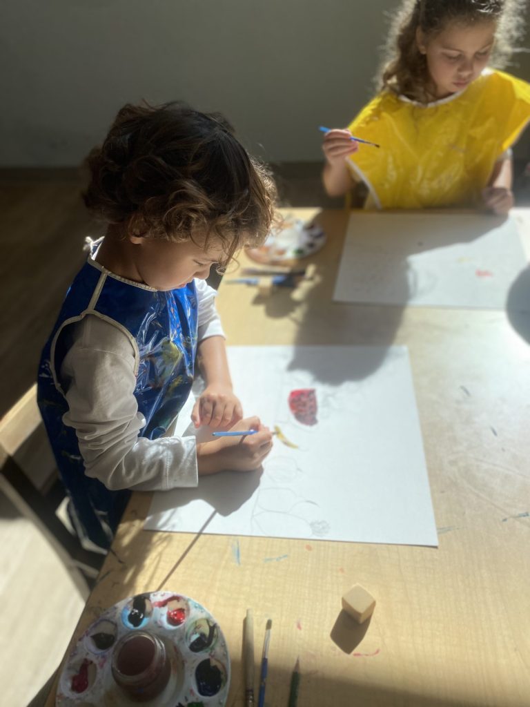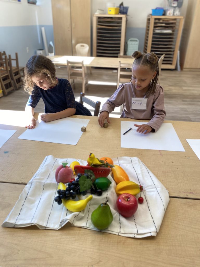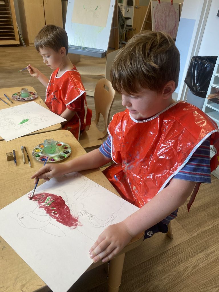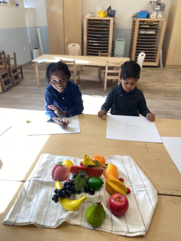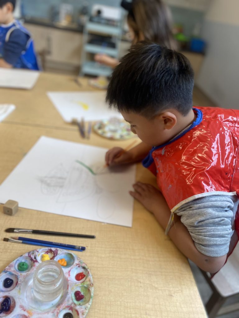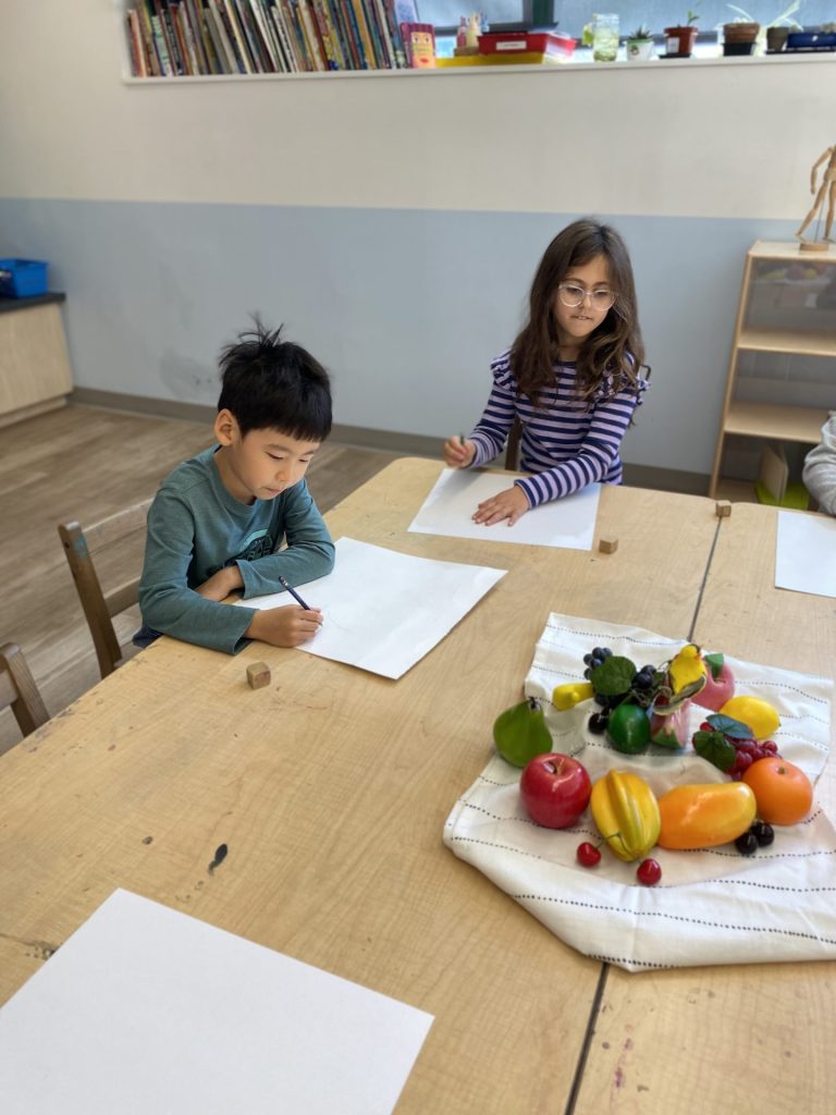 The lower elementary students made their own Frida Kahlo inspired still life paintings. We talked about what a still life is, and how artists used different objects in their work to symbolize the feelings of their art. An assortment of fruit was laid out in the middle of the table. Everyone had to draw the fruit exactly how they saw it from their point of view. Then, the students then used gouache paint to add the color to their paintings, and they were finished!
