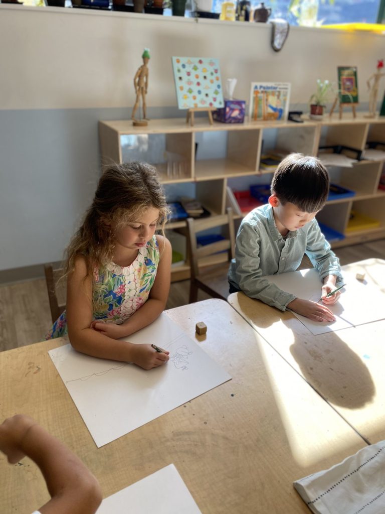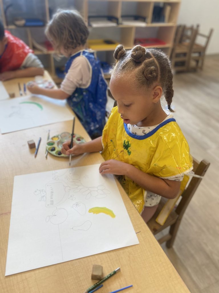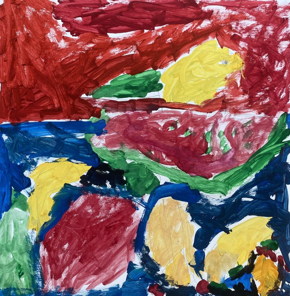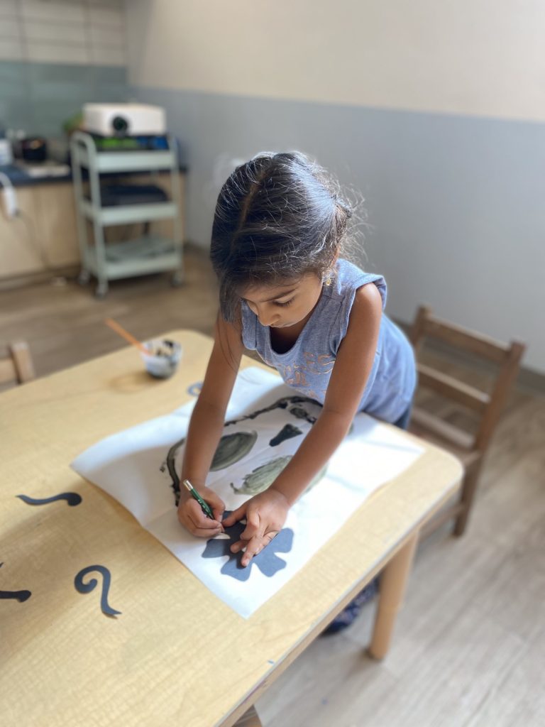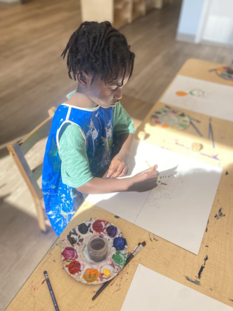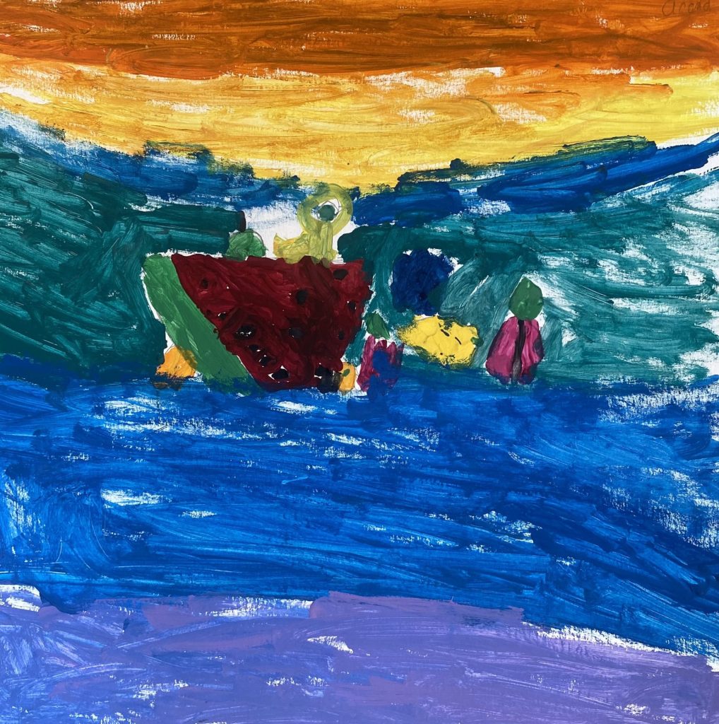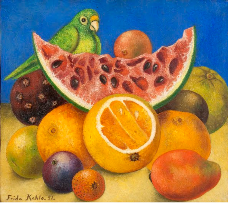 The lower elementary students made their own Frida Kahlo inspired still life paintings. We talked about what a still life is, and how artists used different objects in their work to symbolize the feelings of their art. An assortment of fruit was laid out in the middle of the table. Everyone had to draw the fruit exactly how they saw it from their point of view. Then, the students then used gouache paint to add the color to their paintings, and they were finished!