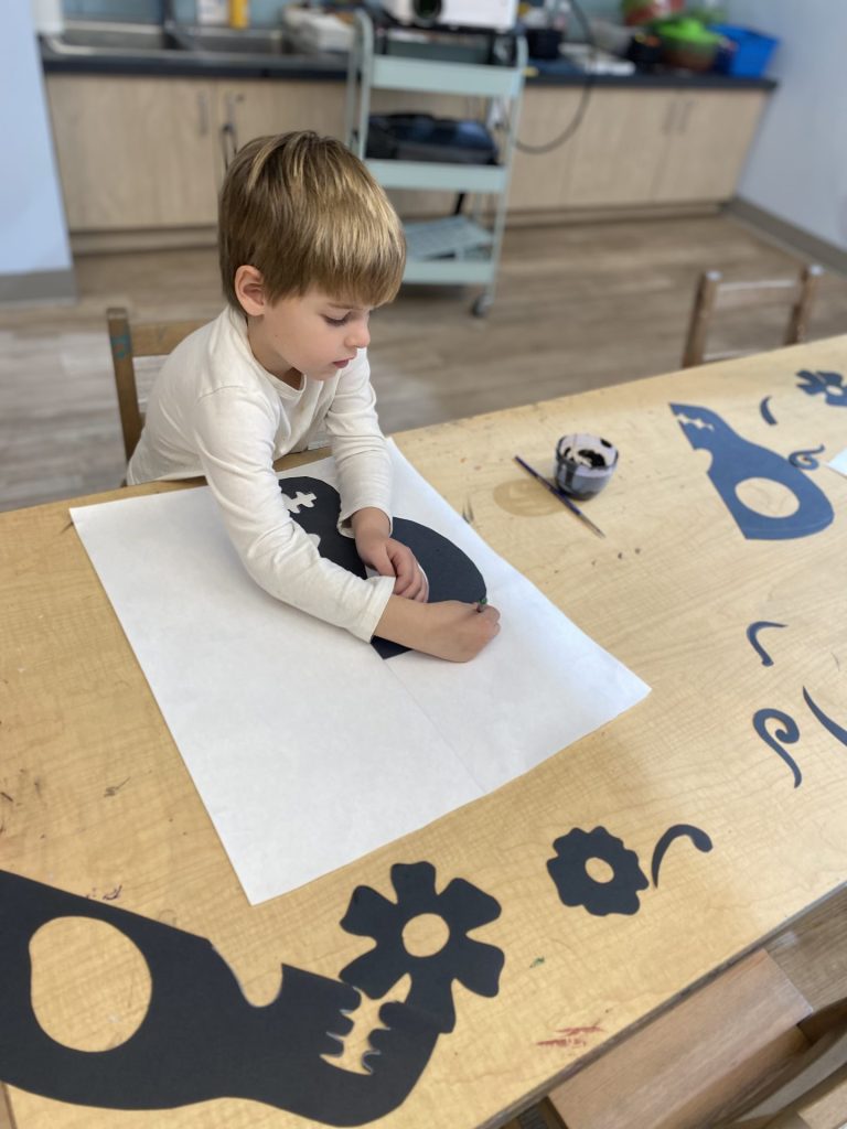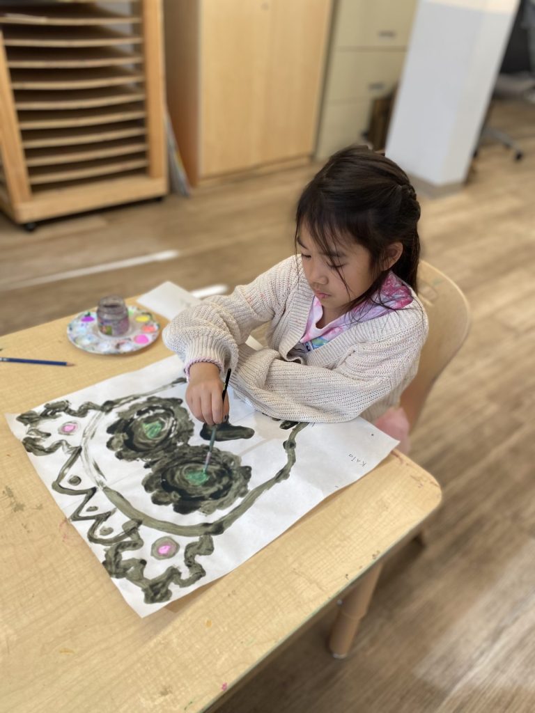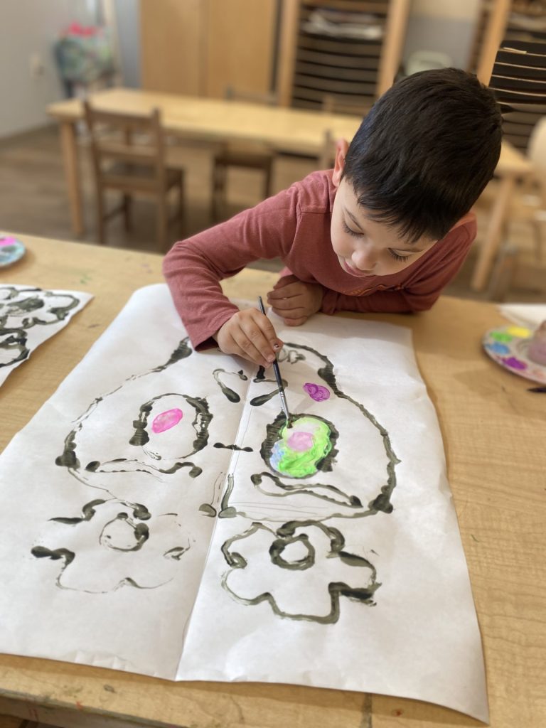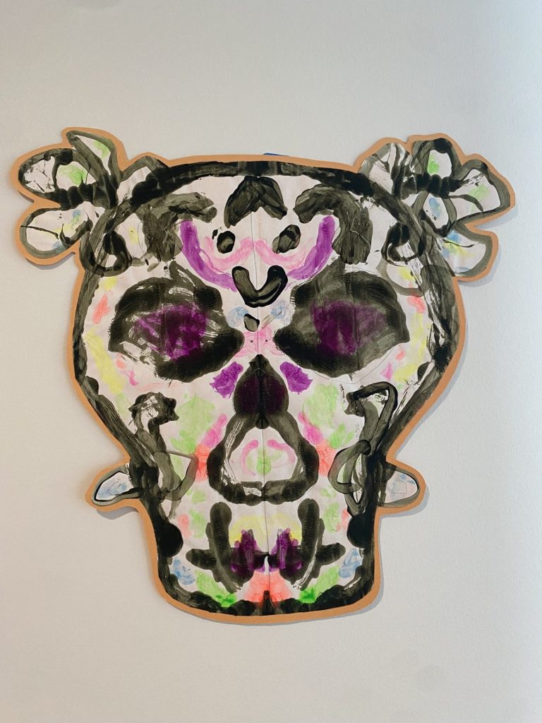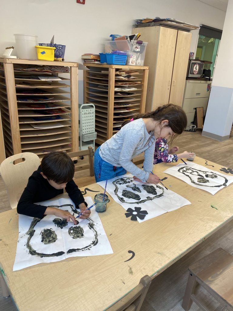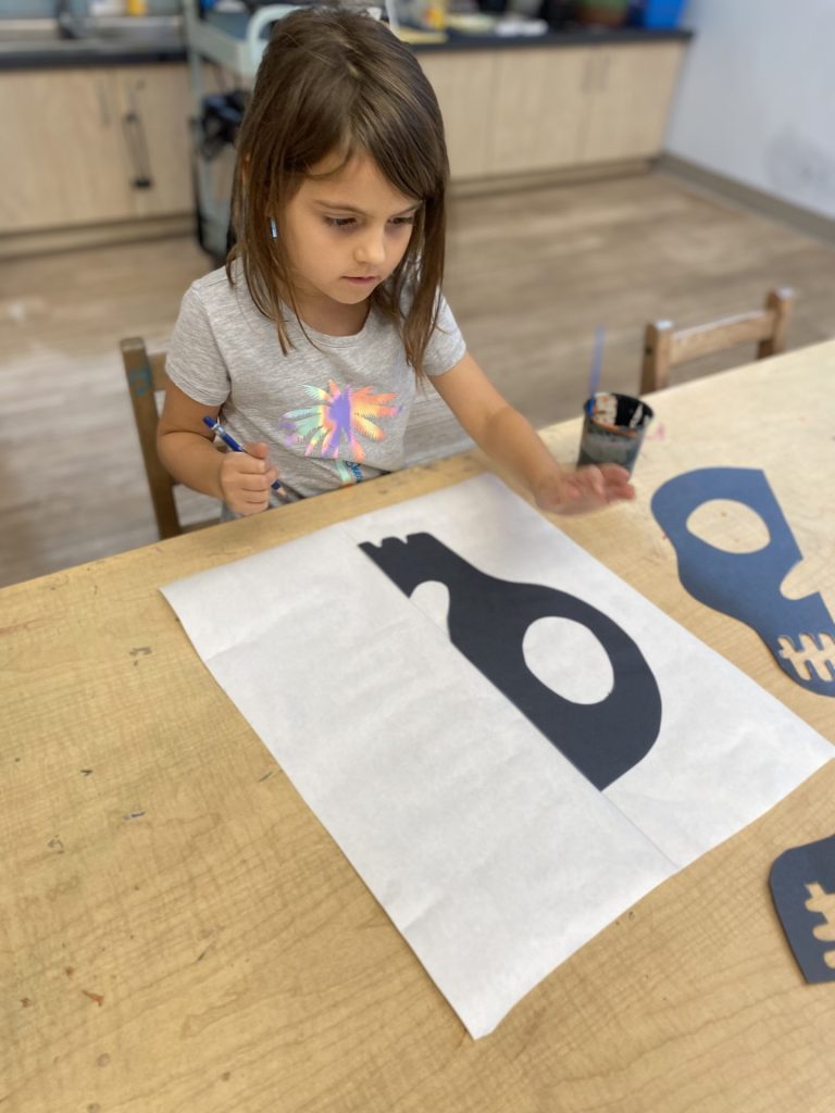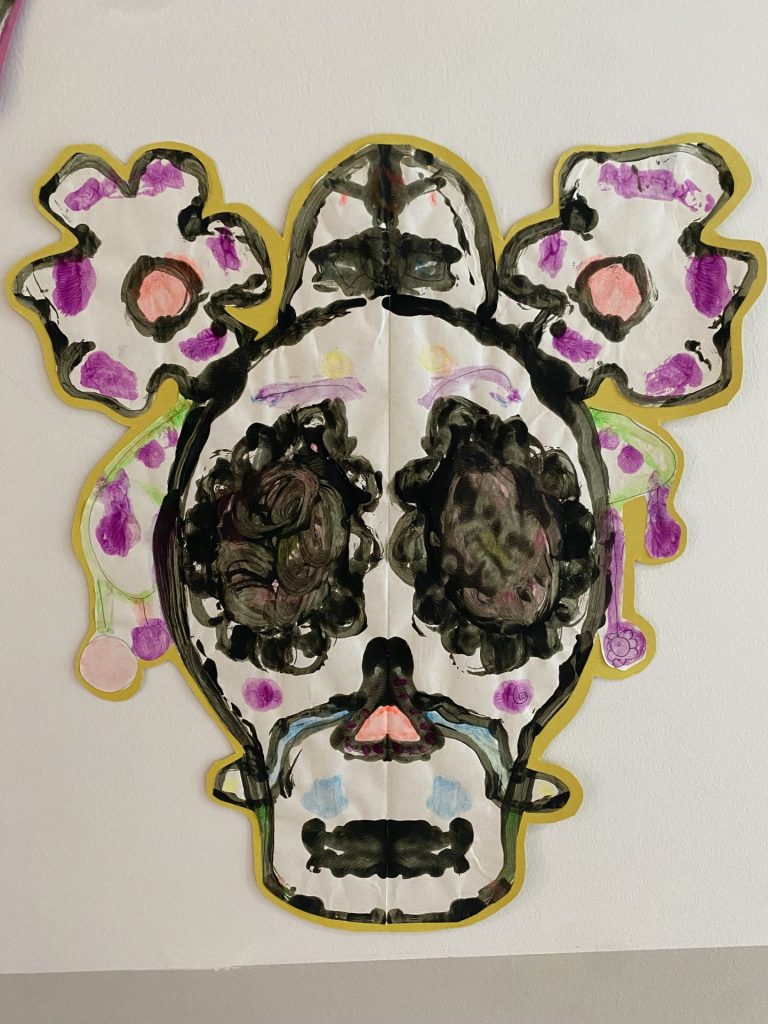 October was all about symmetry, still lifes, and glow in the dark calaveras! Frida Kahlo was the artist of the month for October, and we had a great time exploring her surrealist style. Frida is a great artist to discuss in October because not only is her work famous for its spooky imagery, but October is also Hispanic Heritage Month. Both lower elementary and kindergarten students learned all about her life and her art and created two different projects to honor her life and work.