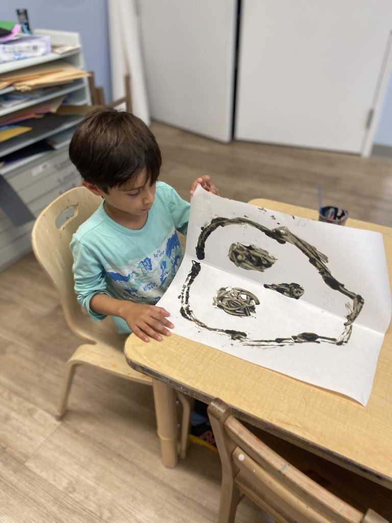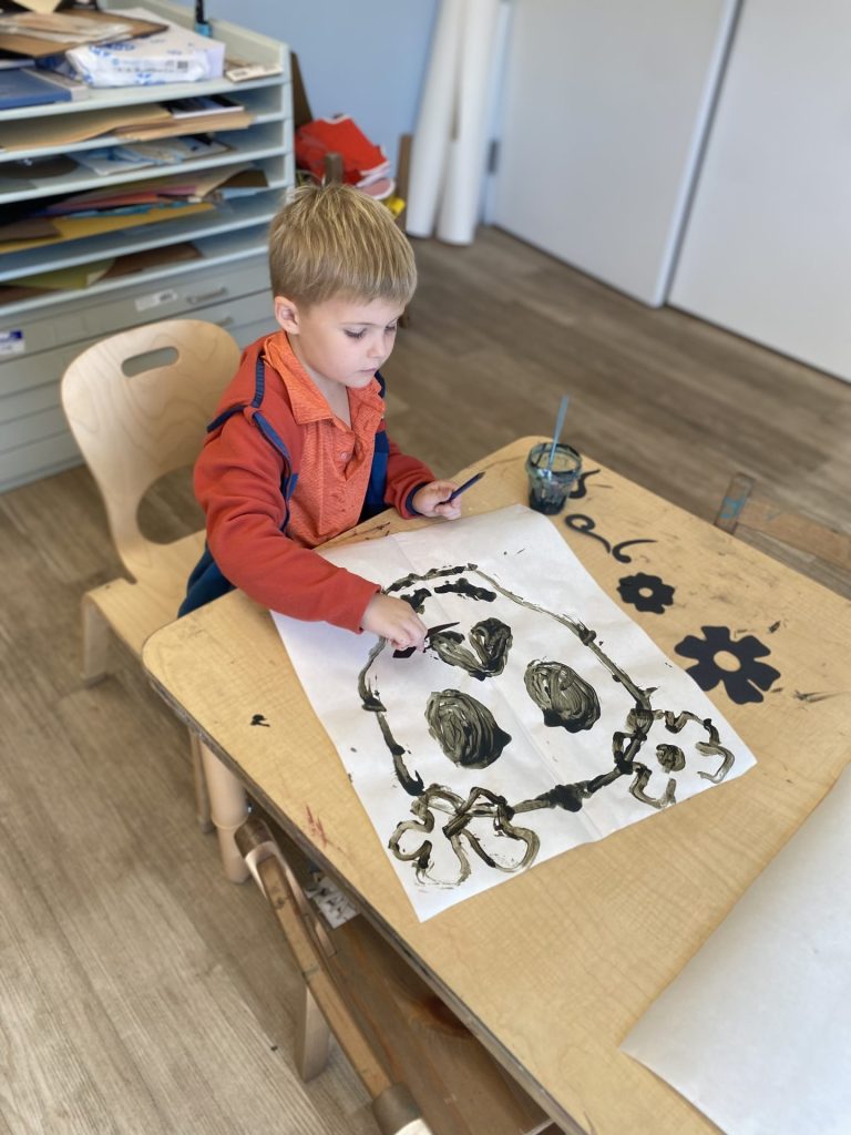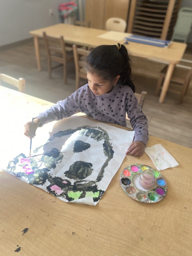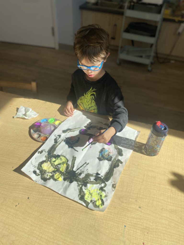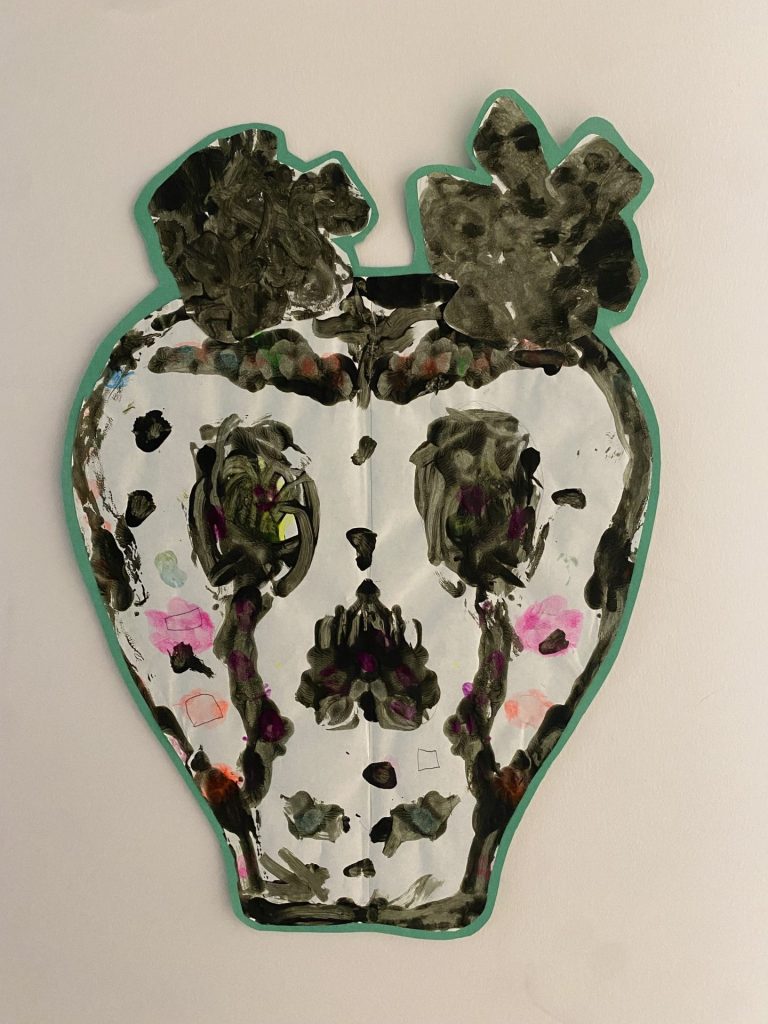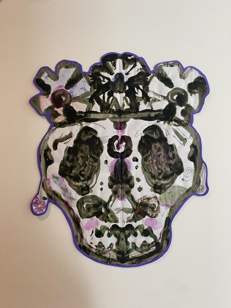 October was all about symmetry, still lifes, and glow in the dark calaveras! Frida Kahlo was the artist of the month for October, and we had a great time exploring her surrealist style. Frida is a great artist to discuss in October because not only is her work famous for its spooky imagery, but October is also Hispanic Heritage Month. Both lower elementary and kindergarten students learned all about her life and her art and created two different projects to honor her life and work.