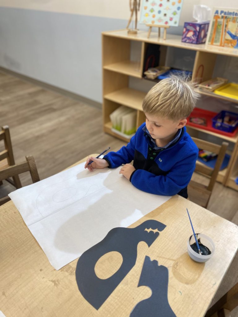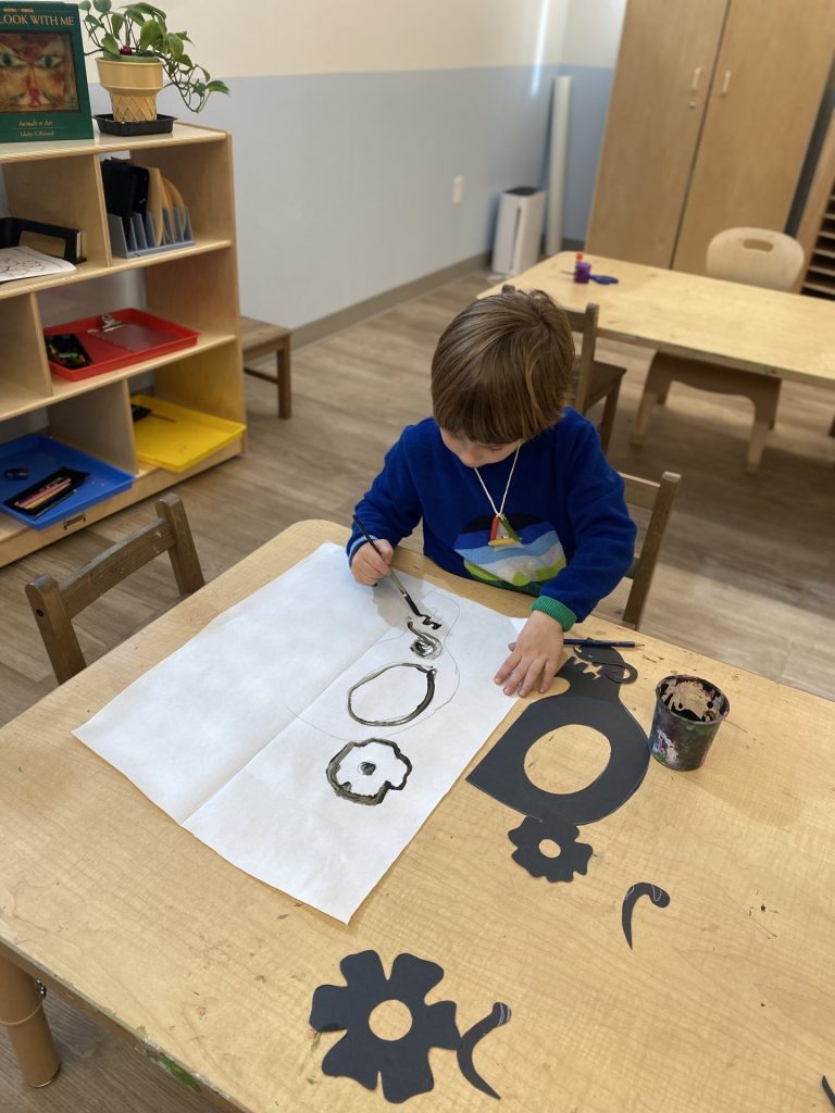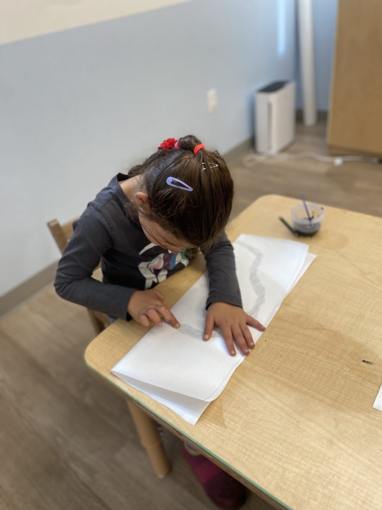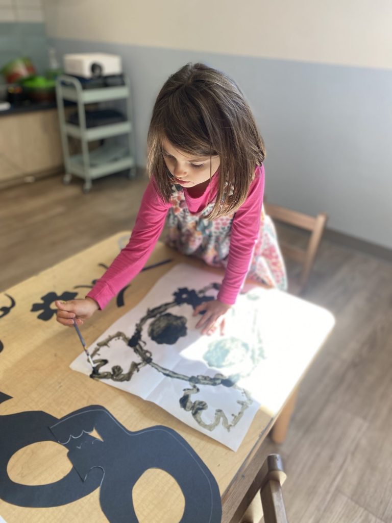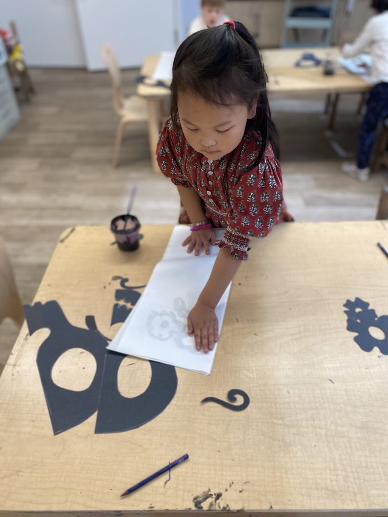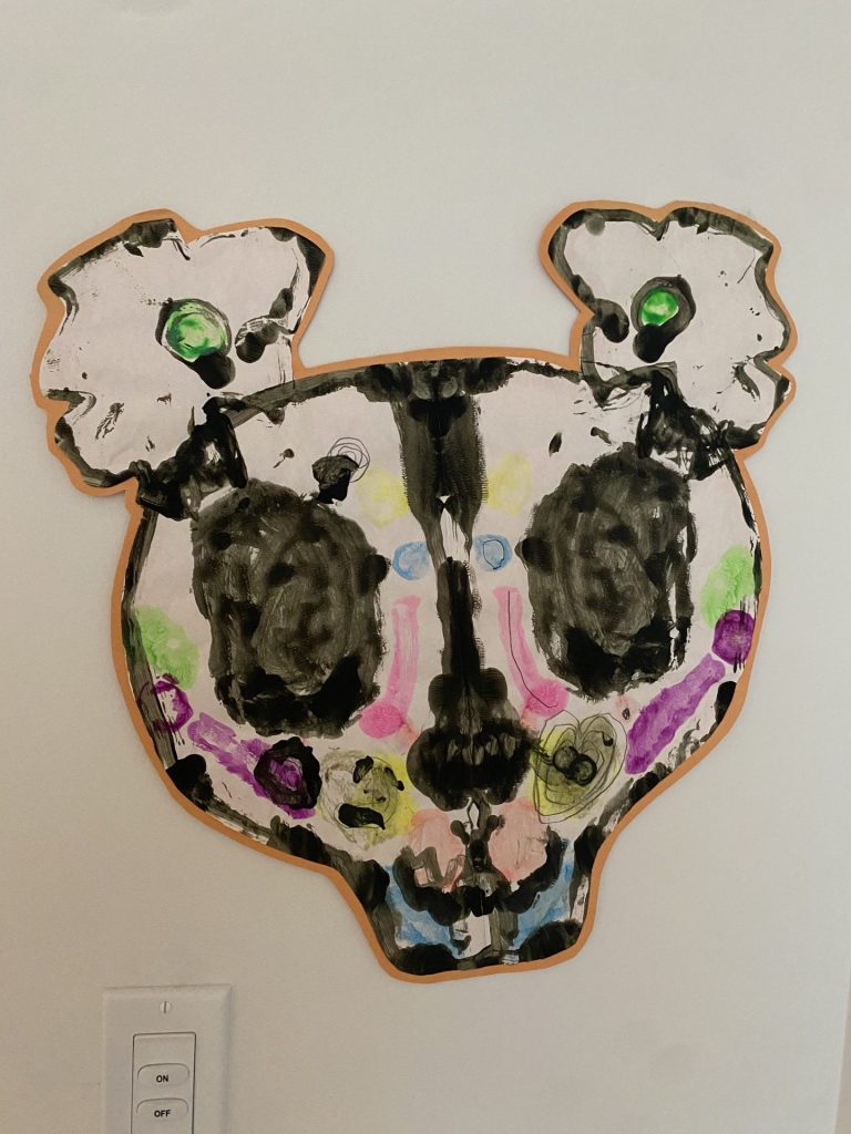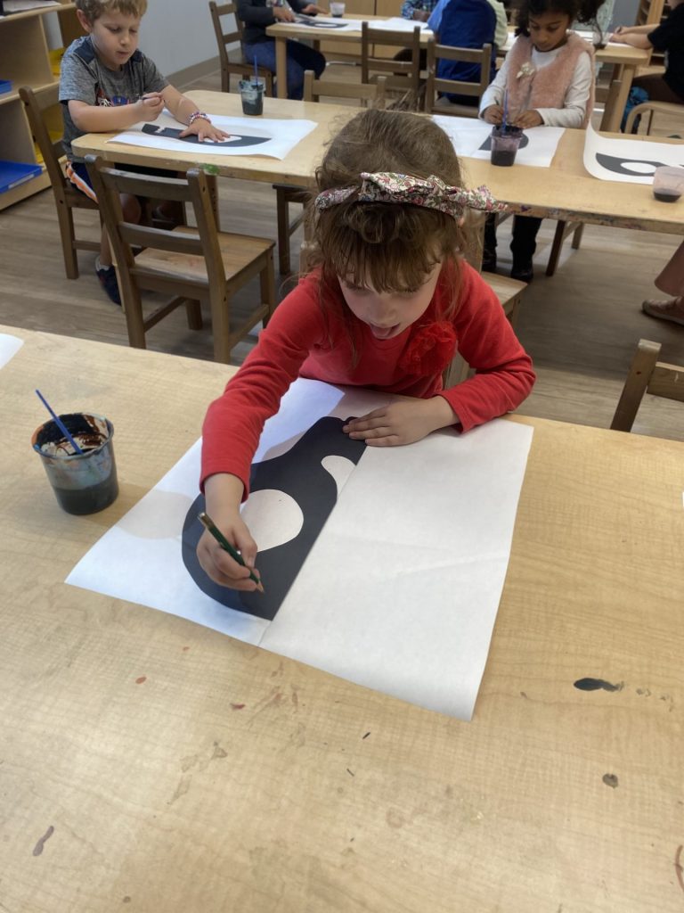 October was all about symmetry, still lifes, and glow in the dark calaveras! Frida Kahlo was the artist of the month for October, and we had a great time exploring her surrealist style. Frida is a great artist to discuss in October because not only is her work famous for its spooky imagery, but October is also Hispanic Heritage Month. Both lower elementary and kindergarten students learned all about her life and her art and created two different projects to honor her life and work.