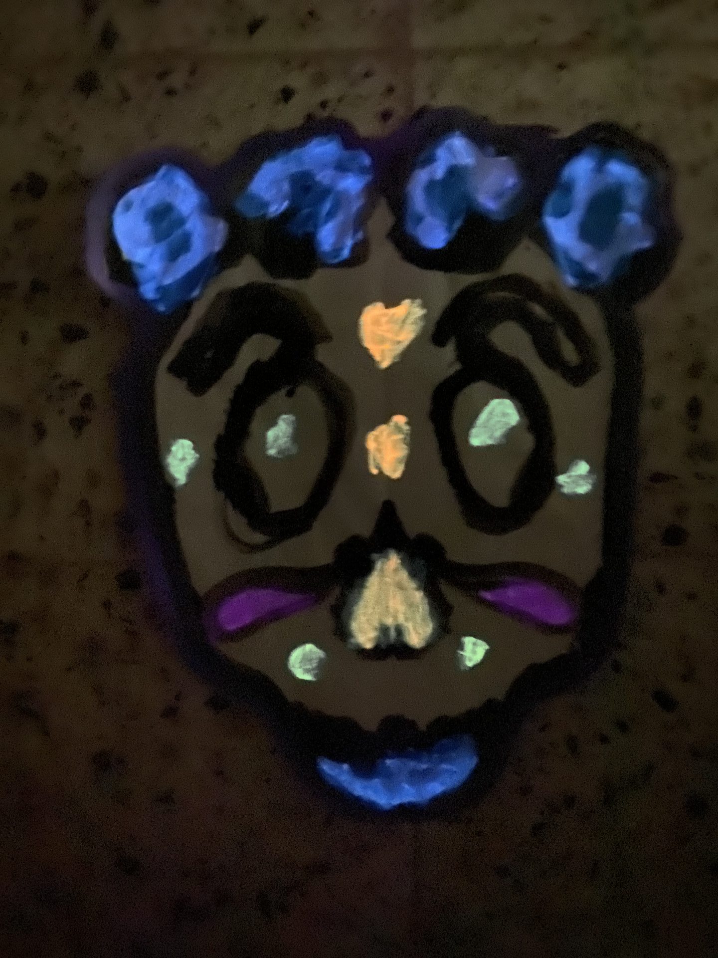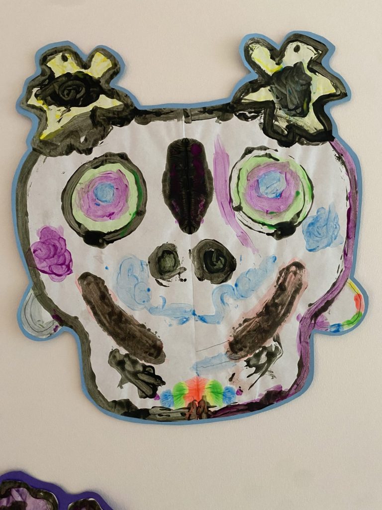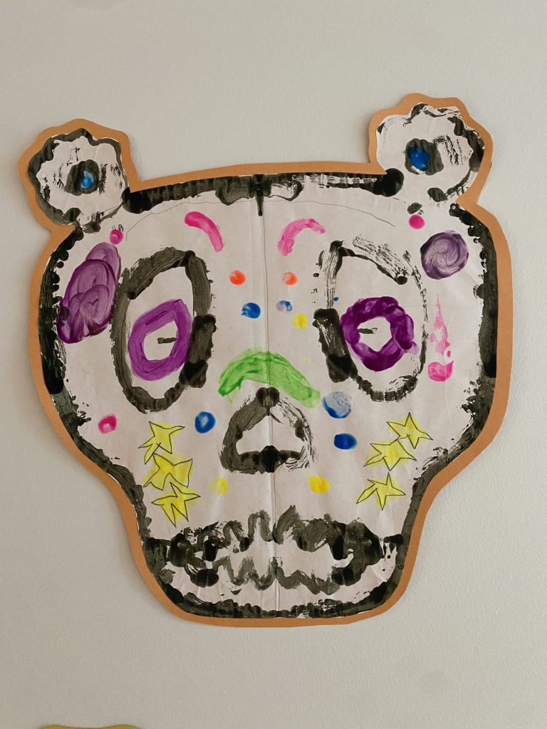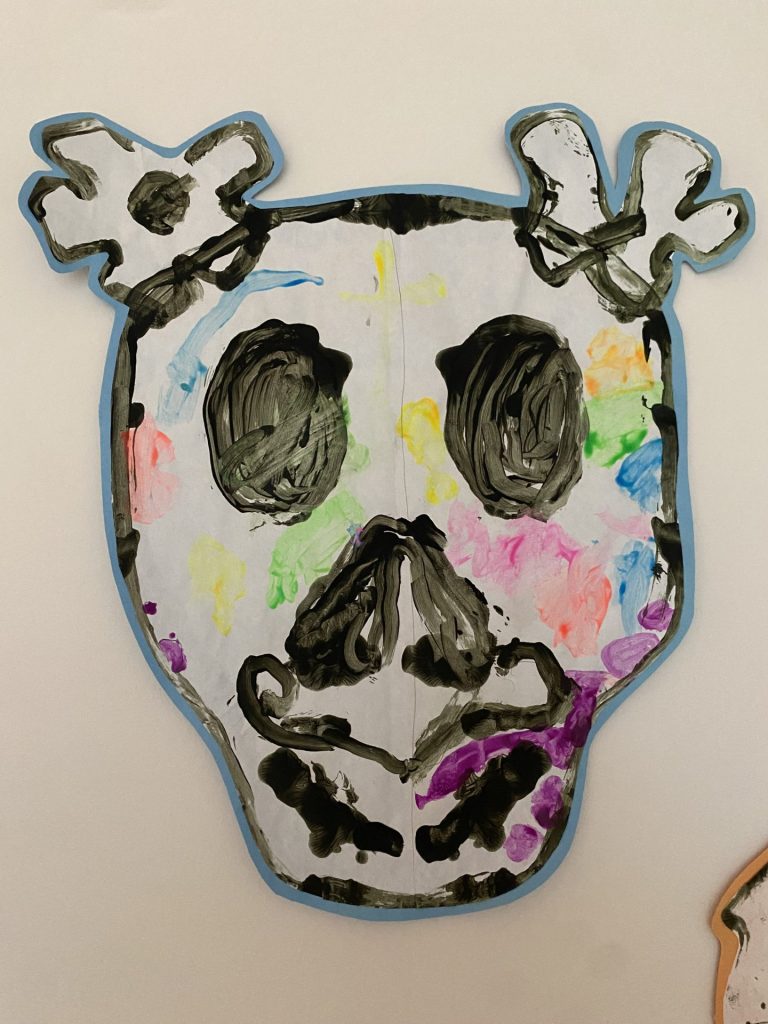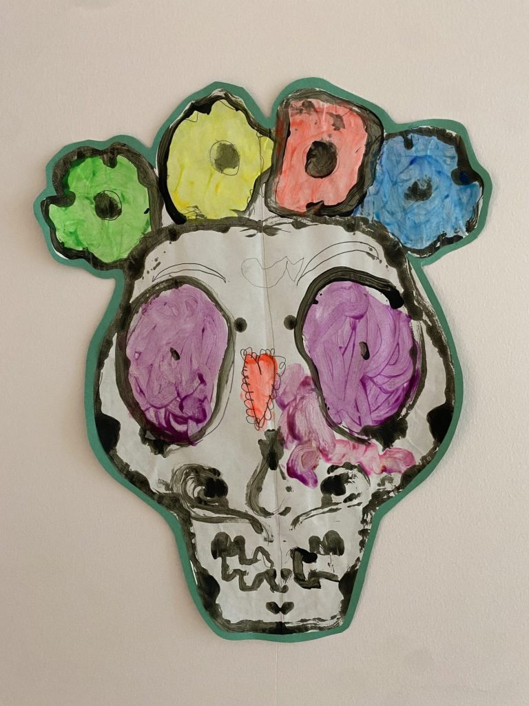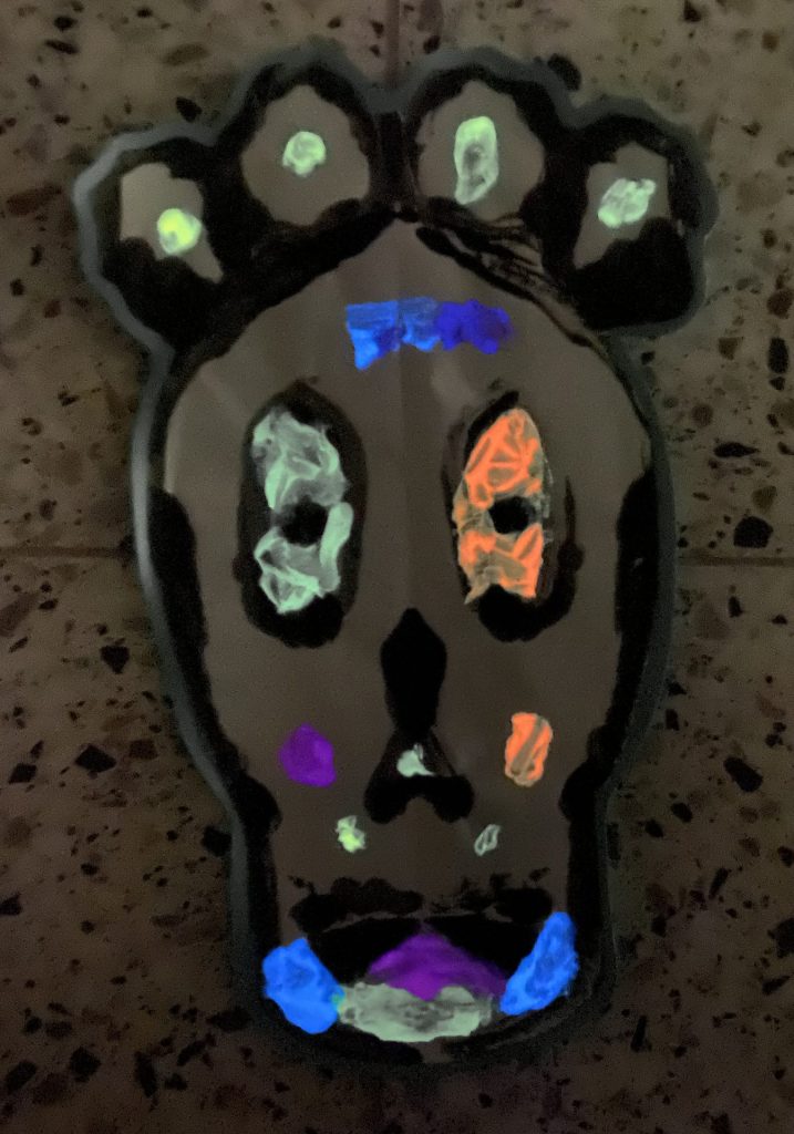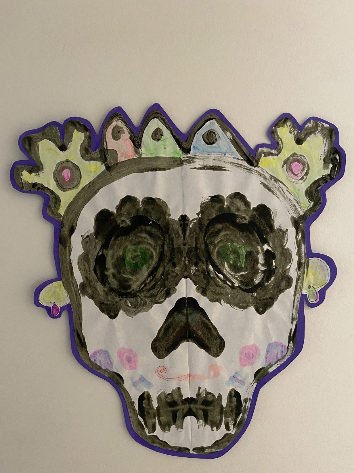 In addition to learning about Frida herself, kindergarteners also learned about symmetry. They used symmetry to create calaveras- calaveras are colorful, decorative skulls used as a symbol of remembrance for family and friends who have passed away during Dia De Los Muertos, or Day of the Dead. Each student chose a stencil to trace half of a skull, and added flowers at the top just like Frida Kahlo did in her self portraits. Then, they painted over what they drew, and while the paint was still wet, they folded their paper so the image would transfer to the other side to make their skull symmetrical. Once they created their whole image, they used glow in the dark paint to complete their calaveras!
