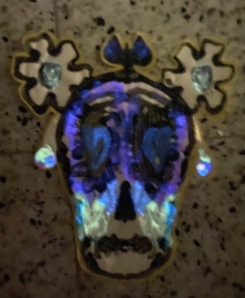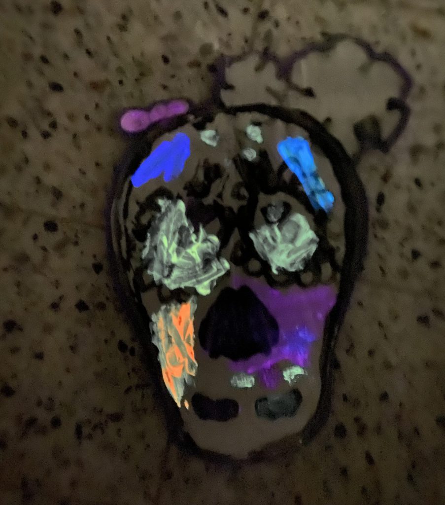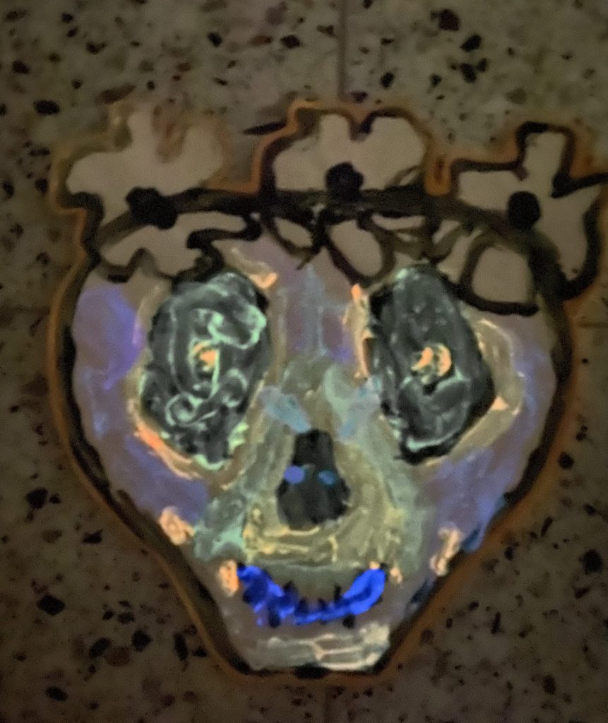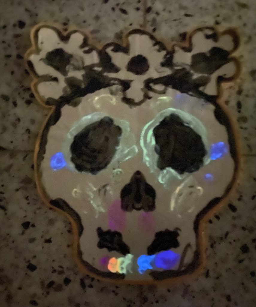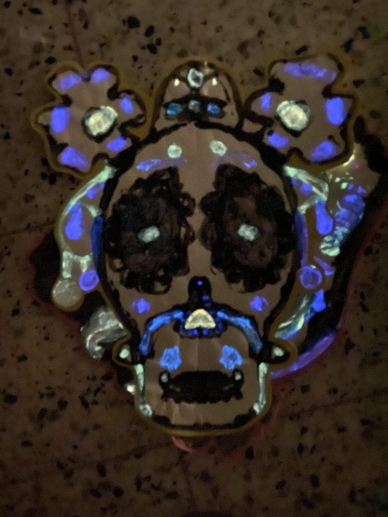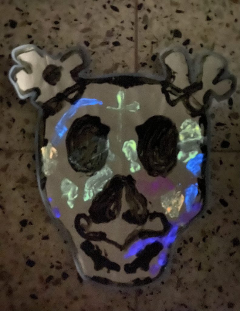 In addition to learning about Frida herself, kindergarteners also learned about symmetry. They used symmetry to create calaveras- calaveras are colorful, decorative skulls used as a symbol of remembrance for family and friends who have passed away during Dia De Los Muertos, or Day of the Dead. Each student chose a stencil to trace half of a skull, and added flowers at the top just like Frida Kahlo did in her self portraits. Then, they painted over what they drew, and while the paint was still wet, they folded their paper so the image would transfer to the other side to make their skull symmetrical. Once they created their whole image, they used glow in the dark paint to complete their calaveras!