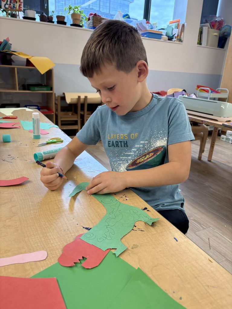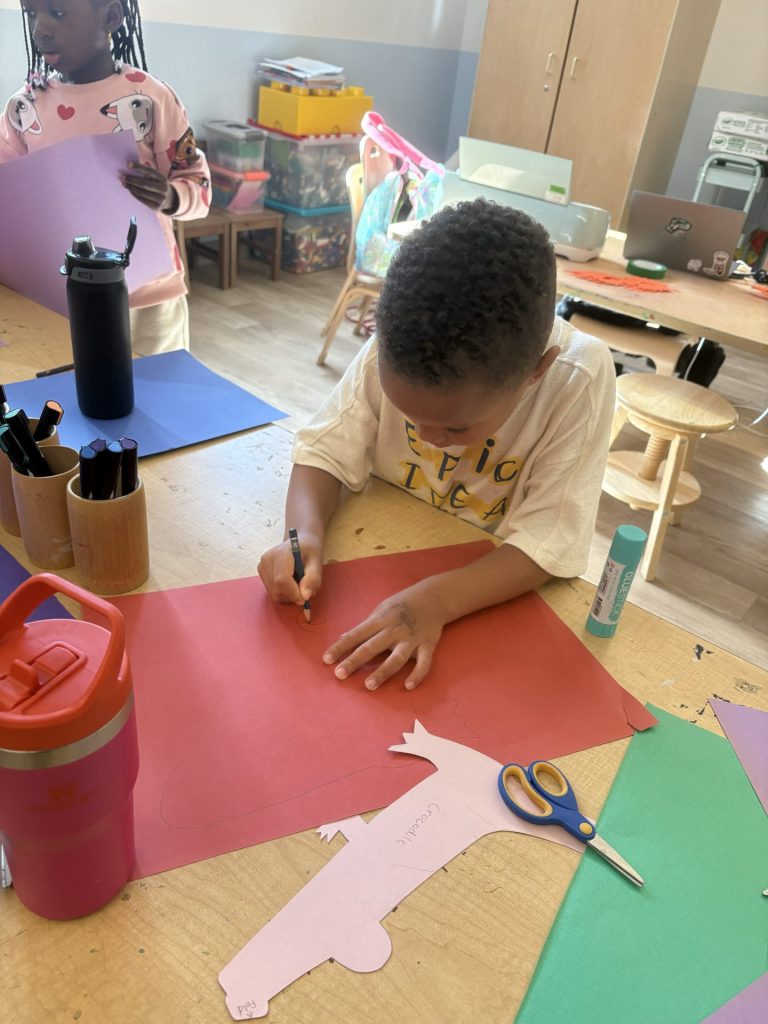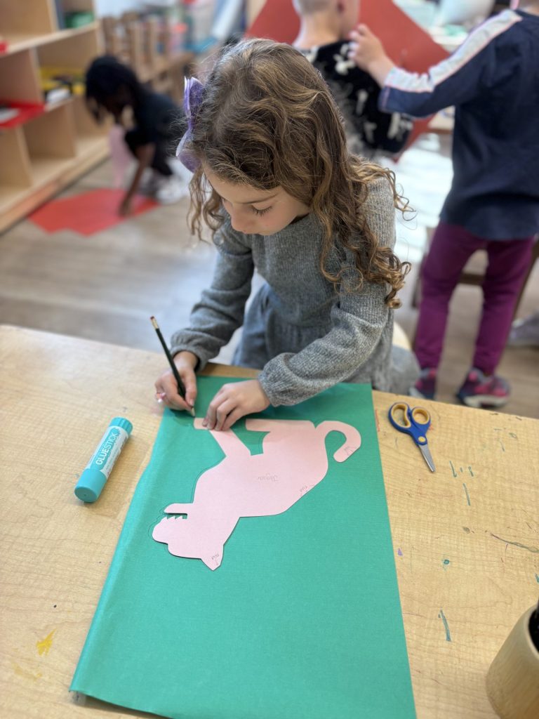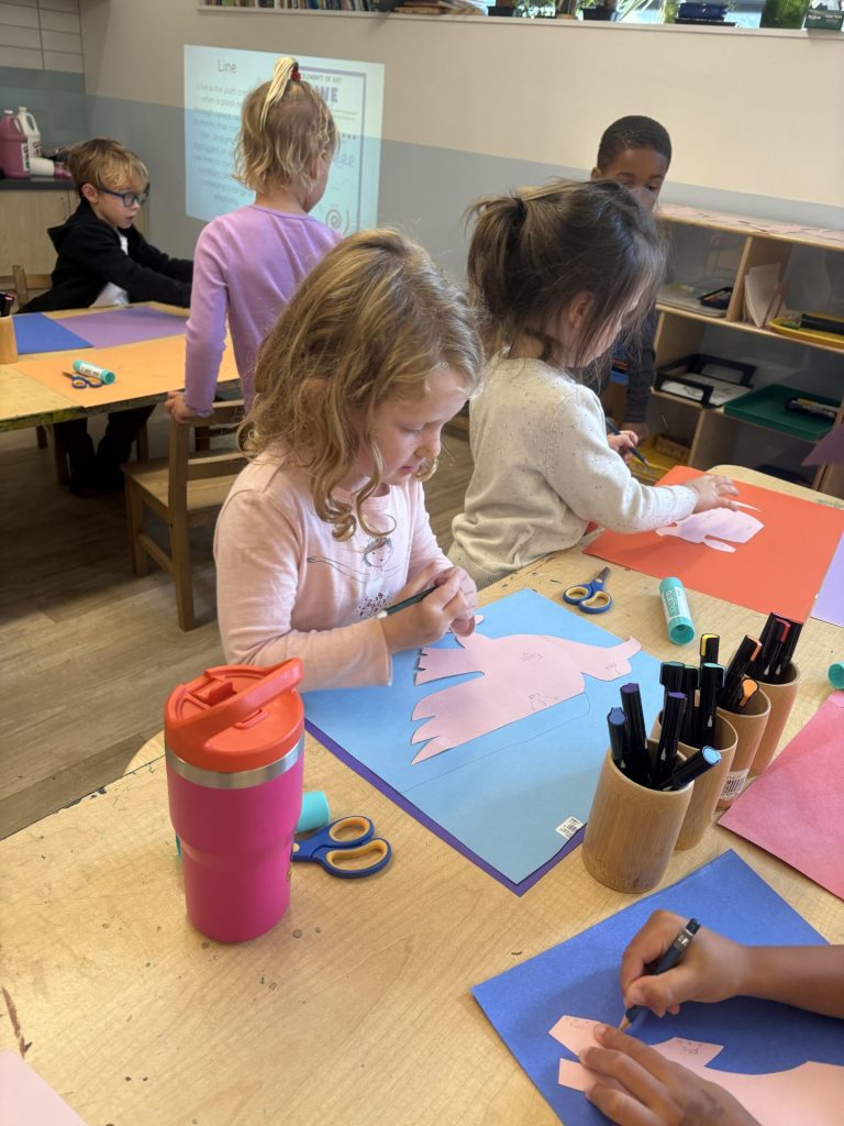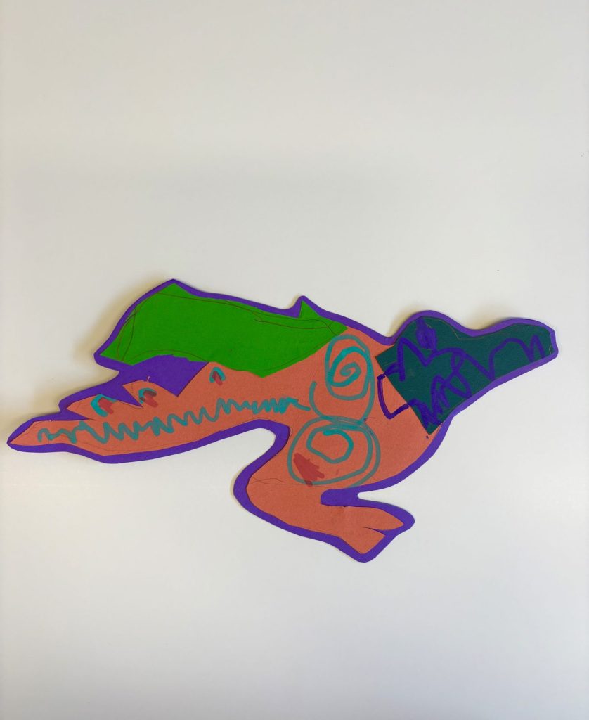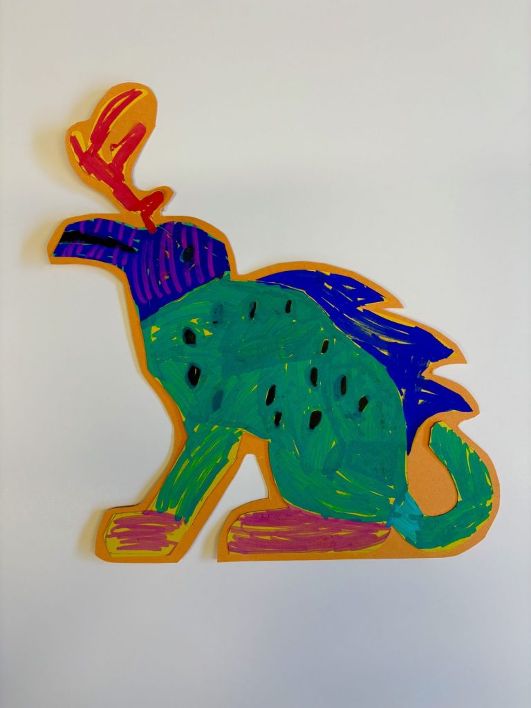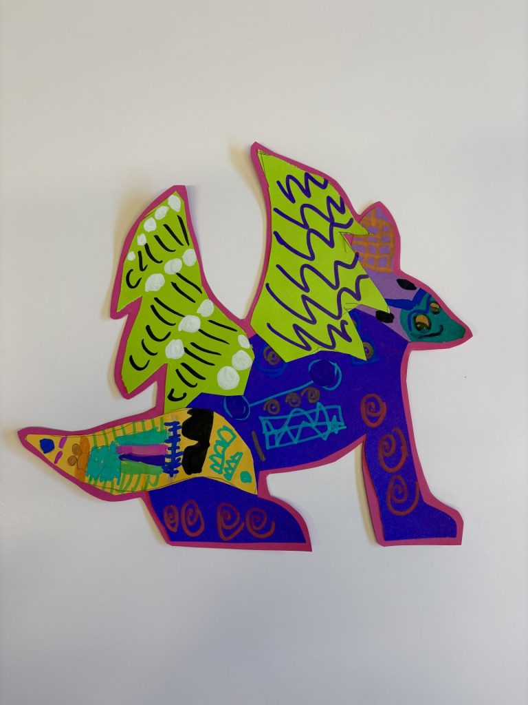 The kindergarteners started off by learning about our second element of art this year- lines! We practiced making many different kinds of lines, such as wavy, curly, and zigzags. We also discussed how lines are so important in art because they create shapes, movement, and other details in works of art. The first step was to trace two animals onto a colored piece of paper. The animals were an armadillo, a mexican wolf, a golden eagle, a crocodile, or a jaguar, all of which are native to Mexico. They cut out their animals, and then switched their heads. The students also added horns, wings, antlers, and tails to add even more details to their alebrijes. Once everything was glued together, they decorated their alebrijes with all sorts of line work to give their alebrijes the signature colorful look.