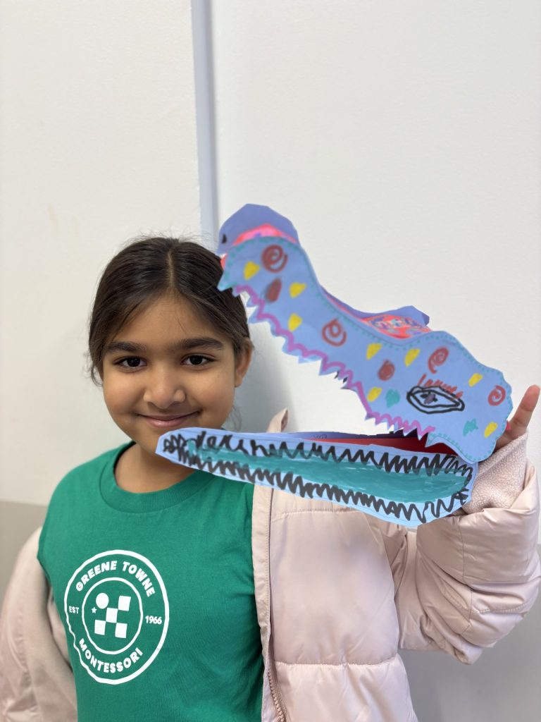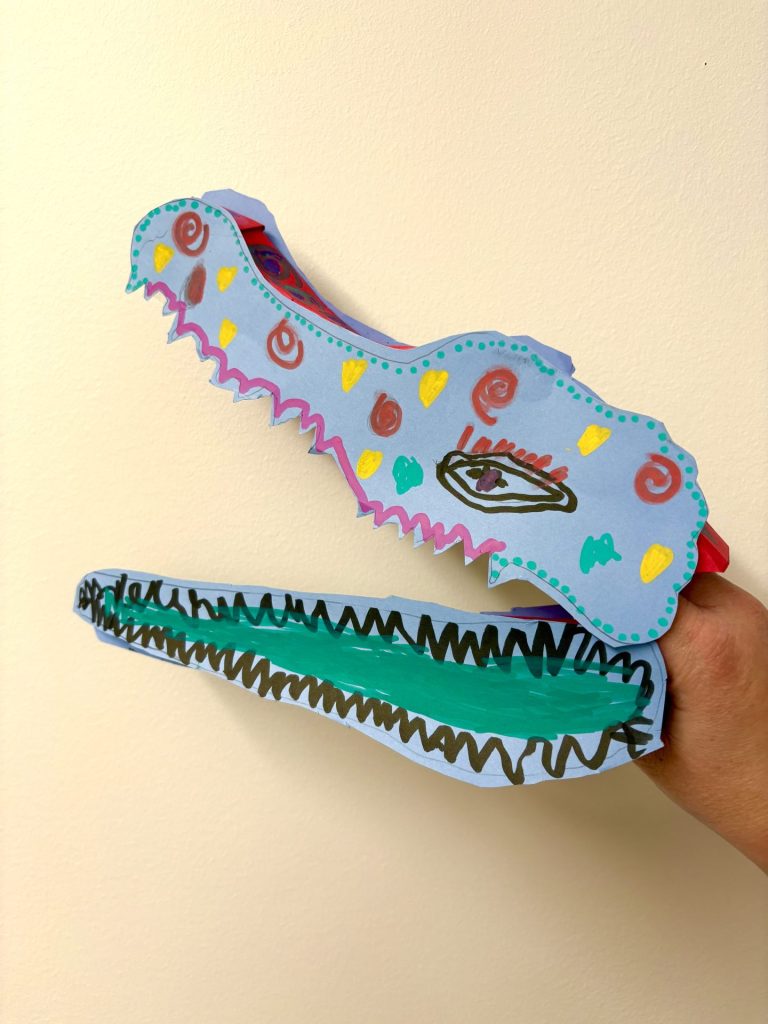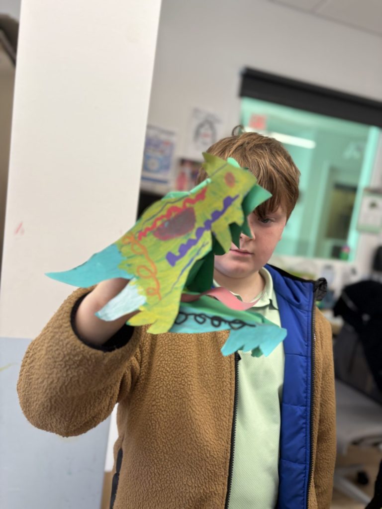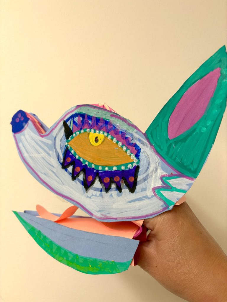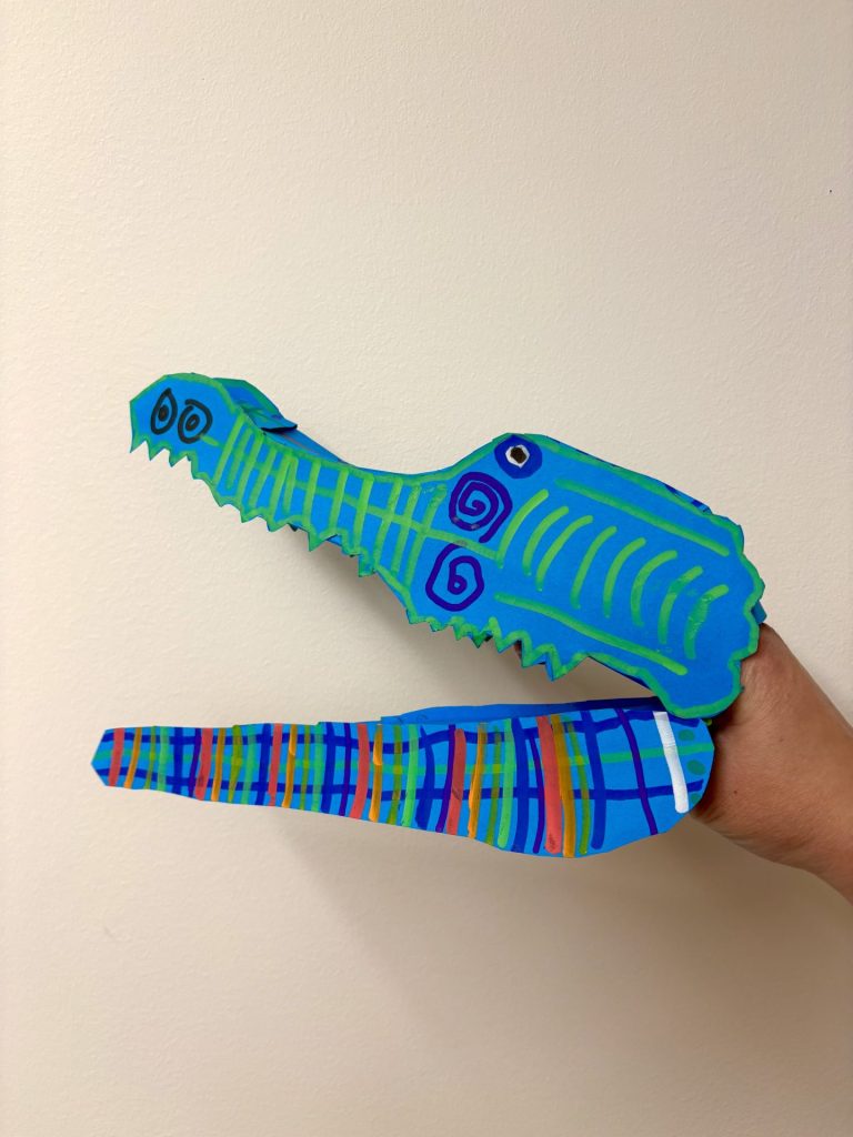 In addition to learning about line, the elm class learned how to use lines to make patterns. We defined the word ‘motif’, just a repeating element of either lines, shapes, or colors. The elm students used what they learned to make alebrije puppets! The could choose from a jaguar, crocodile, rooster, chihuahua, or dragon. They cut out all the parts of their puppets, added lots of colors, lines, and patterns with paint pens, and glued it all together. Even though most students used the same templates, each puppet was so unique! It was a fun project to celebrate Pedro’s legacy.