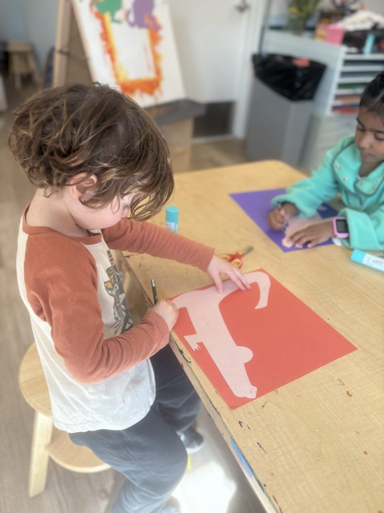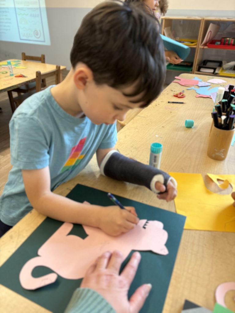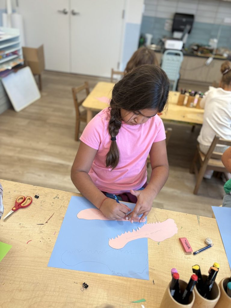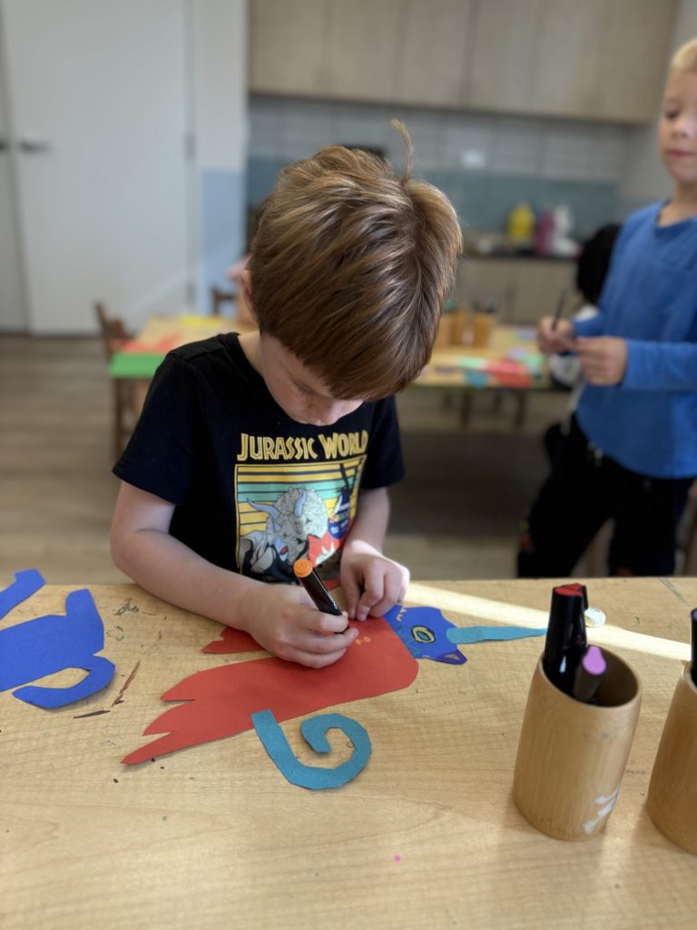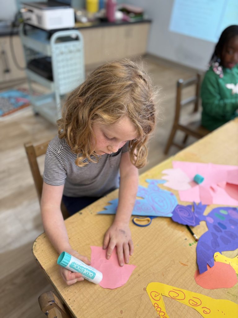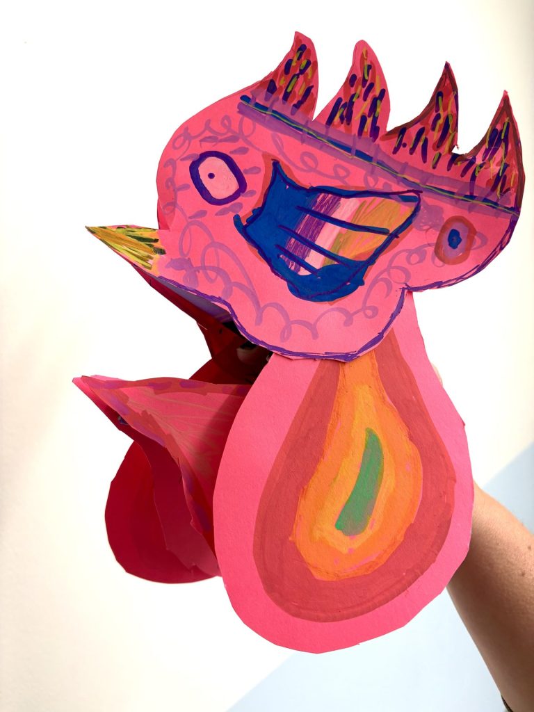 In addition to learning about line, the elm class learned how to use lines to make patterns. We defined the word ‘motif’, just a repeating element of either lines, shapes, or colors. The elm students used what they learned to make alebrije puppets! The could choose from a jaguar, crocodile, rooster, chihuahua, or dragon. They cut out all the parts of their puppets, added lots of colors, lines, and patterns with paint pens, and glued it all together. Even though most students used the same templates, each puppet was so unique! It was a fun project to celebrate Pedro’s legacy.