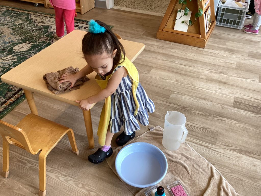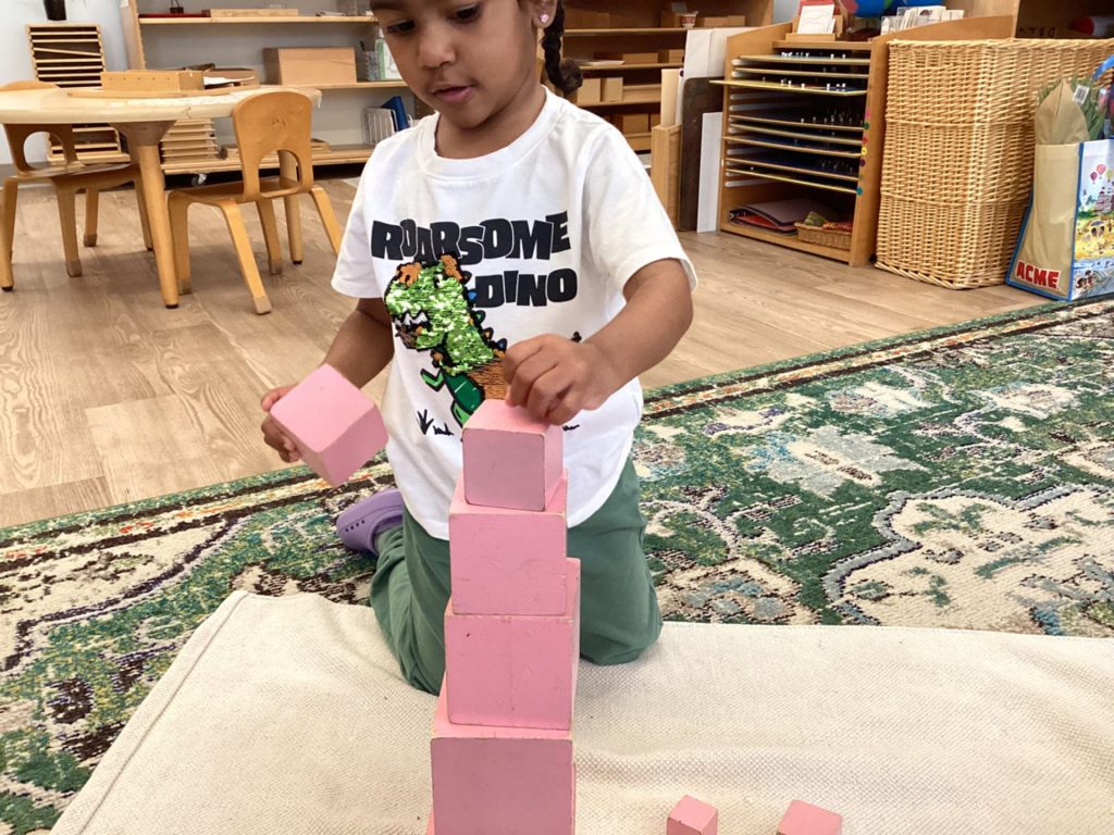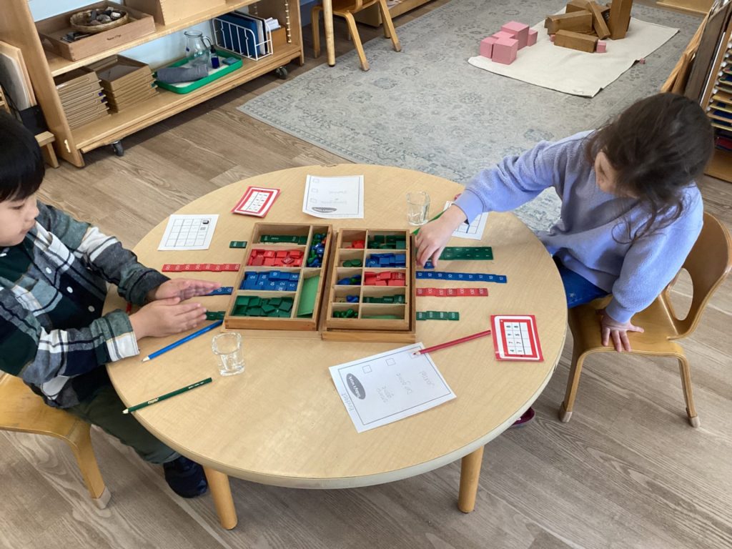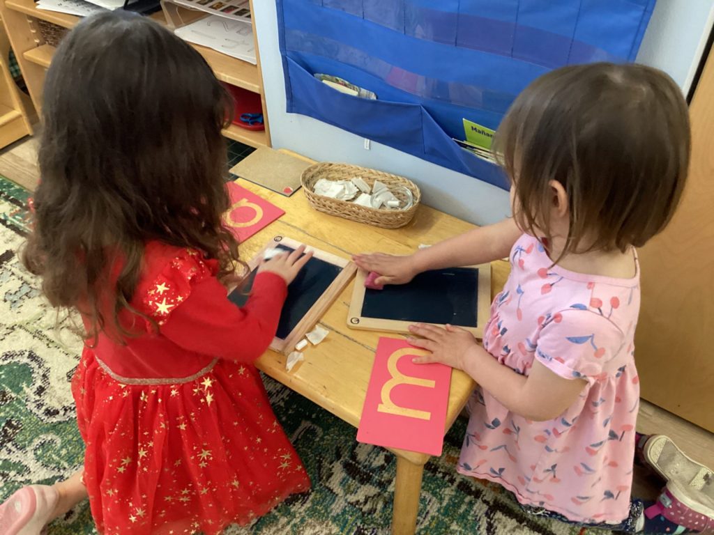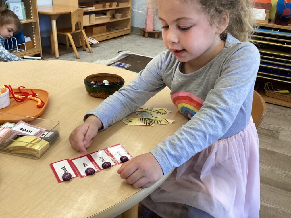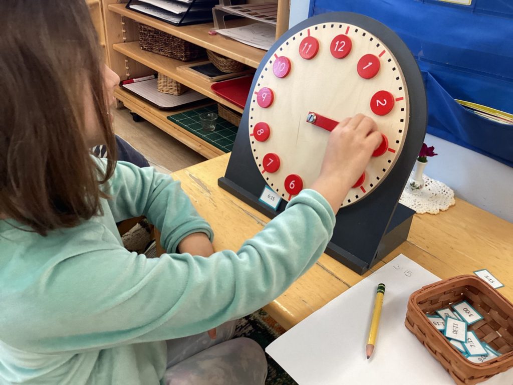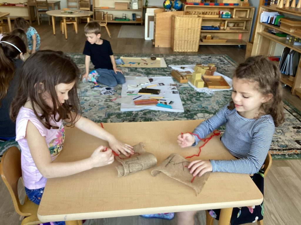 Our first years are working on increasing their range of numbers, practicing letters, further exploring the Sensorial materials, and beginning to prepare their hand for writing. The second years are actively “writing” which includes making books, tracing, coloring, and the excitement of being able to start putting pencil to paper, while working on their beginning reading skills. The Kindergartners are delving into math operations, parts of speech/language, journaling, telling time, and coming up with their own creative projects like sewing!