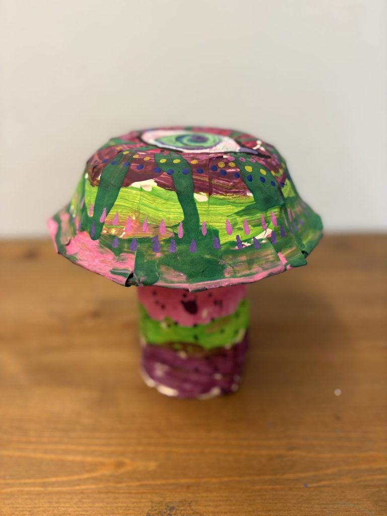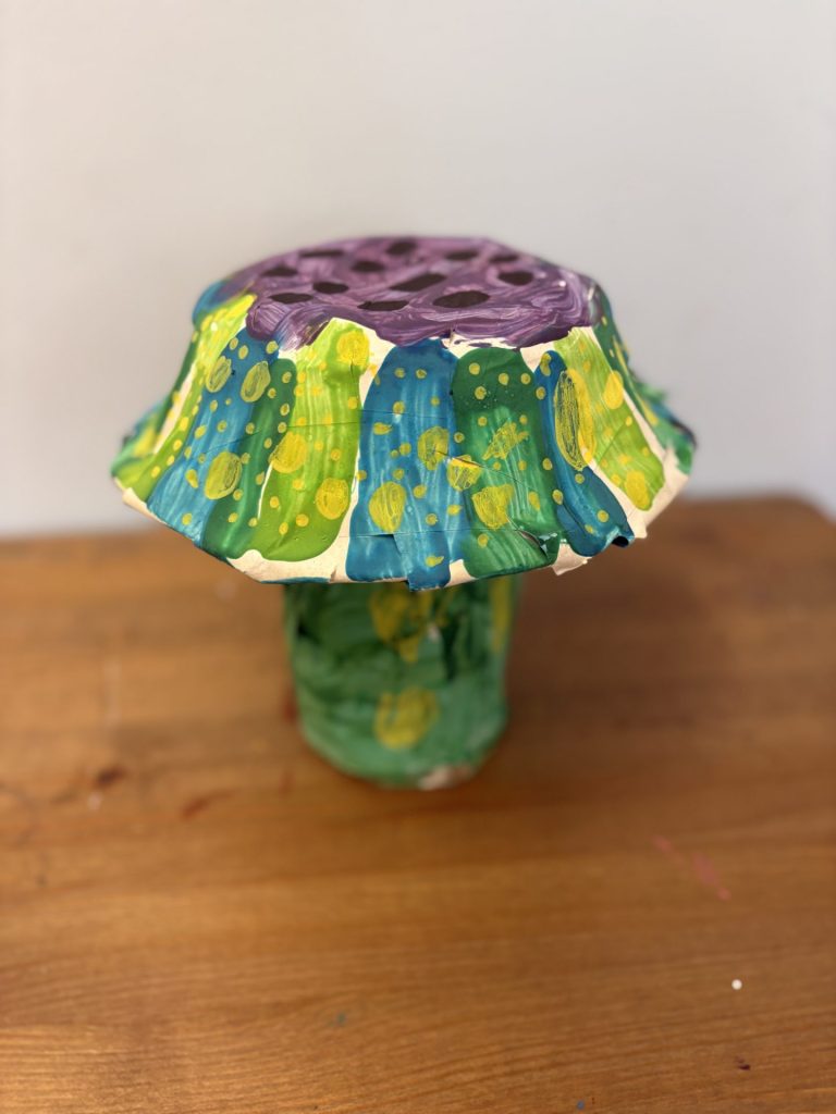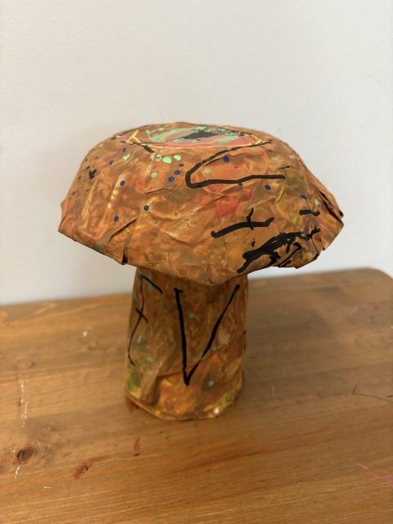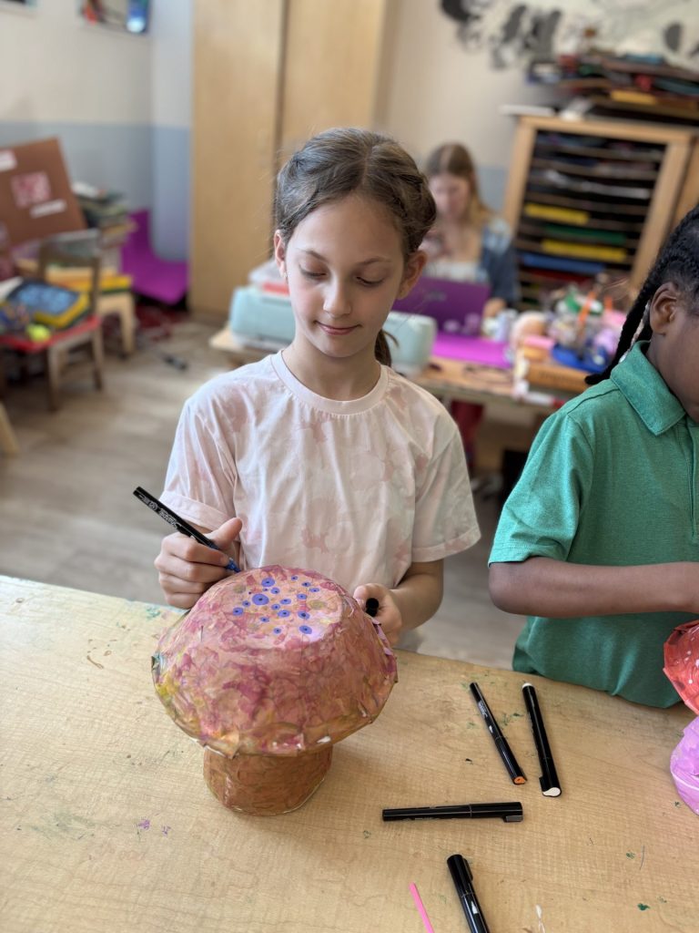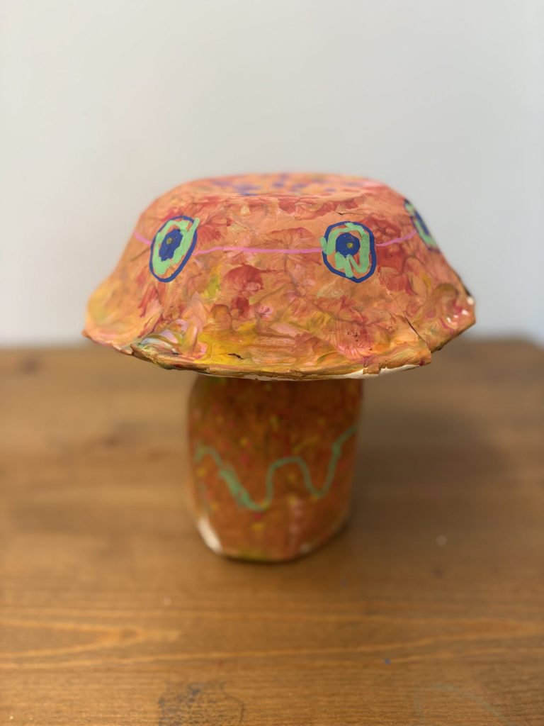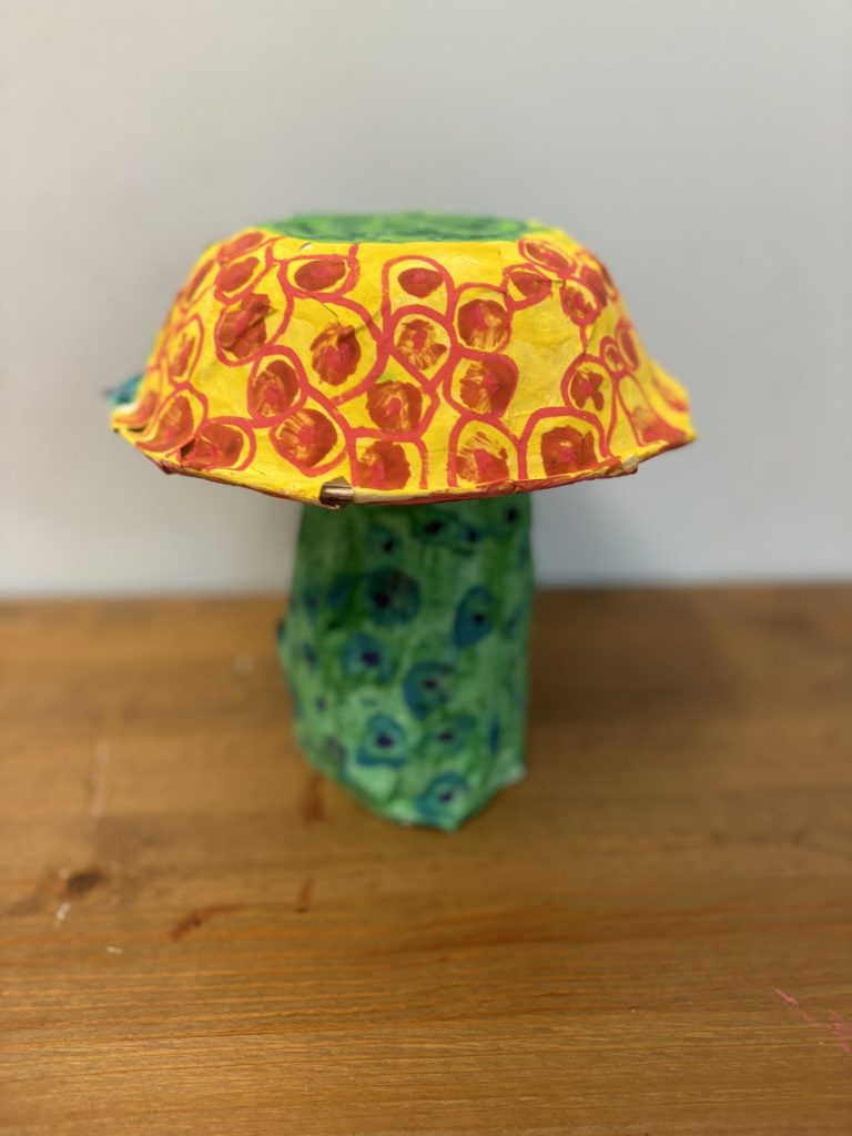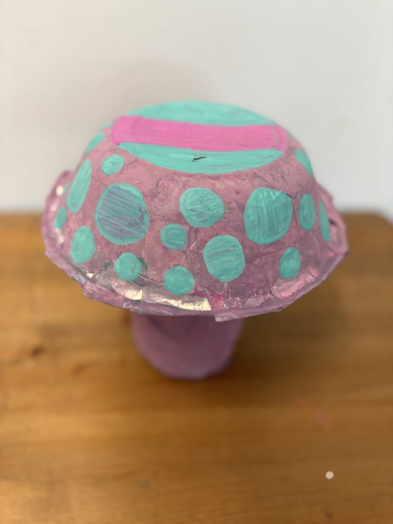 The lower elementary students drew inspiration from Yayoi’s series of mushroom paintings. They constructed their mushrooms using paper cups or water bottles, packaging paper and paper bowls. They covered everything in paper mache and painted their mushrooms in their favorite colors. We looked at all the different kinds of patterns that Yayoi created for her work, and the students used paint pens to recreate some of those patterns on their mushrooms. These bright, whimsical mushrooms are as unique as the child that made them!