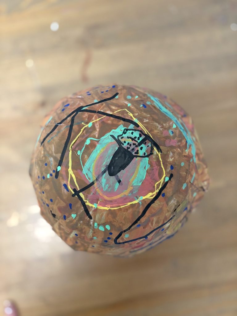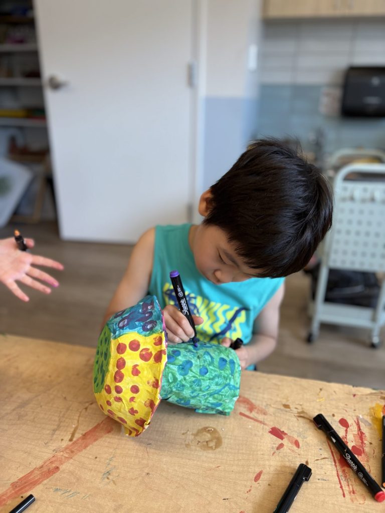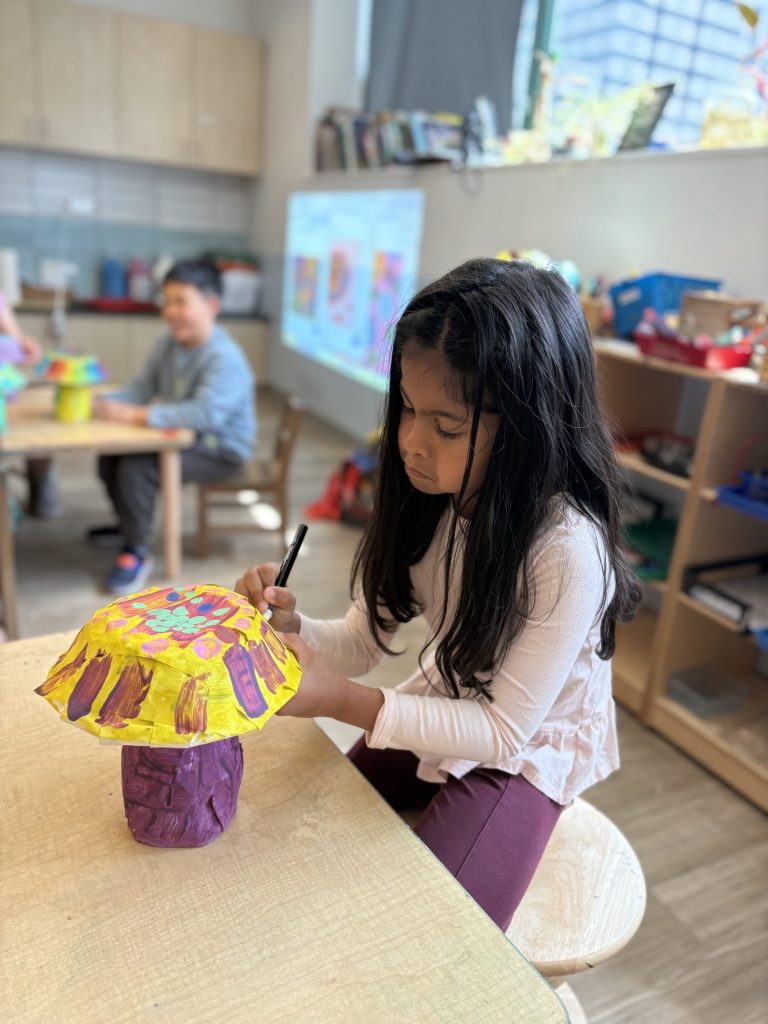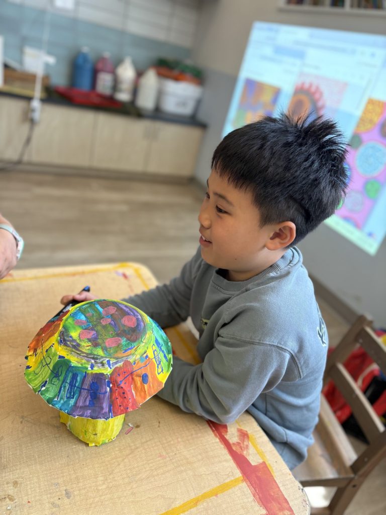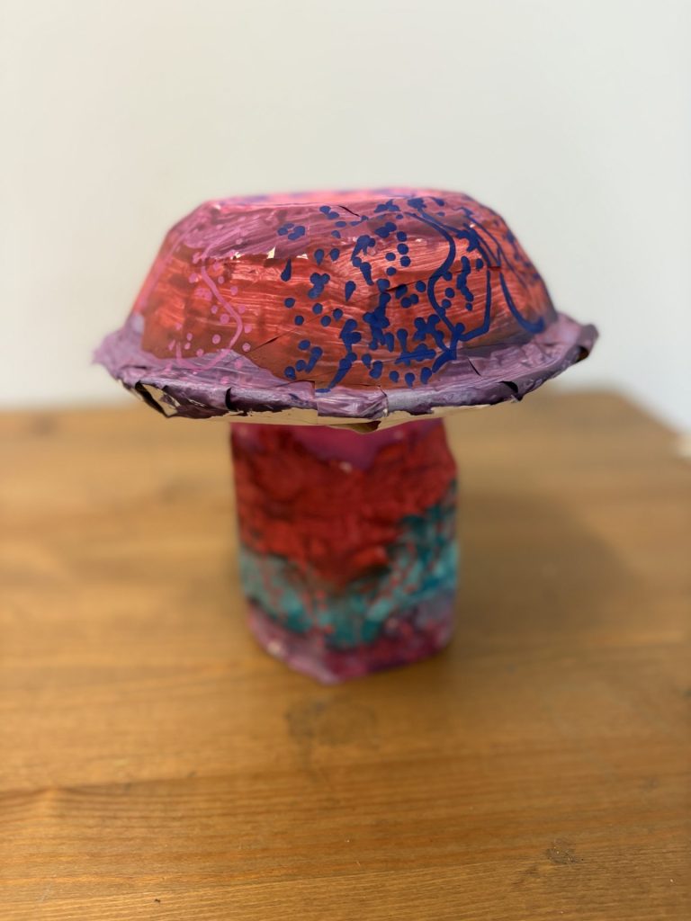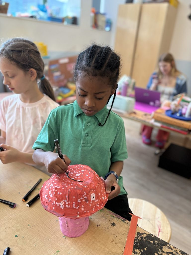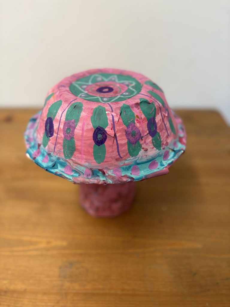 The lower elementary students drew inspiration from Yayoi’s series of mushroom paintings. They constructed their mushrooms using paper cups or water bottles, packaging paper and paper bowls. They covered everything in paper mache and painted their mushrooms in their favorite colors. We looked at all the different kinds of patterns that Yayoi created for her work, and the students used paint pens to recreate some of those patterns on their mushrooms. These bright, whimsical mushrooms are as unique as the child that made them!
