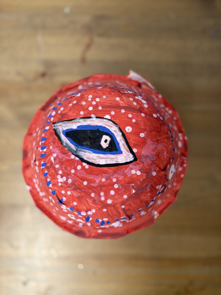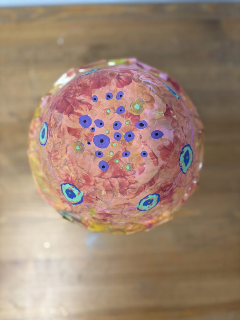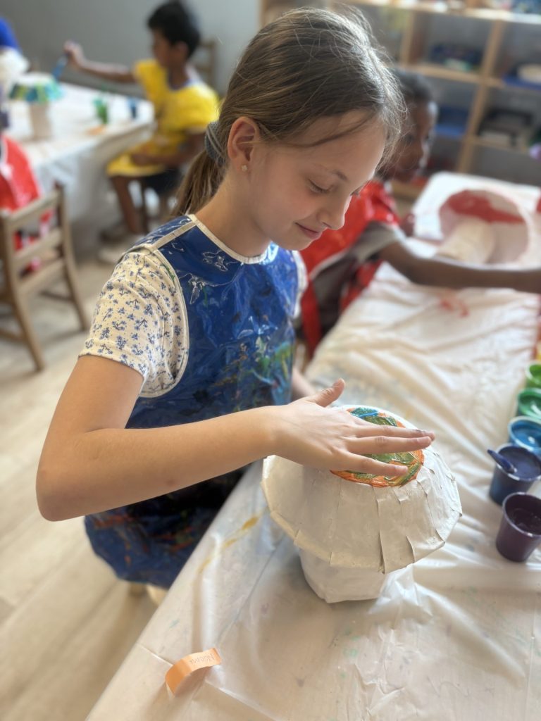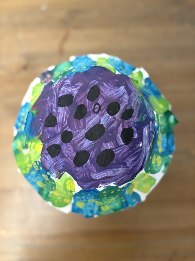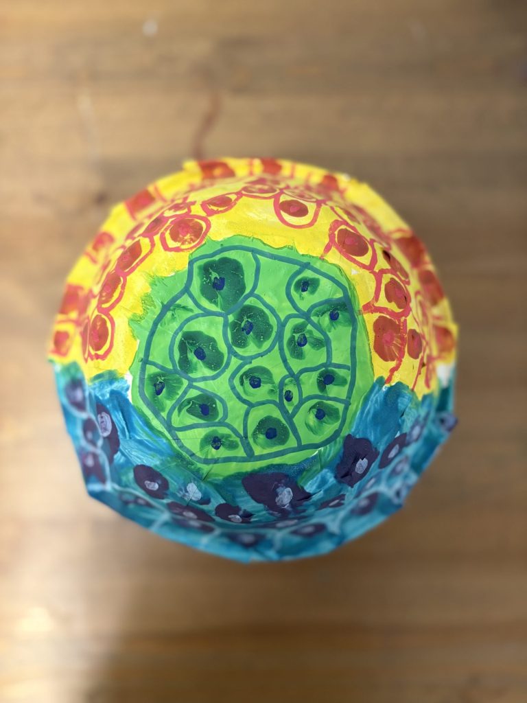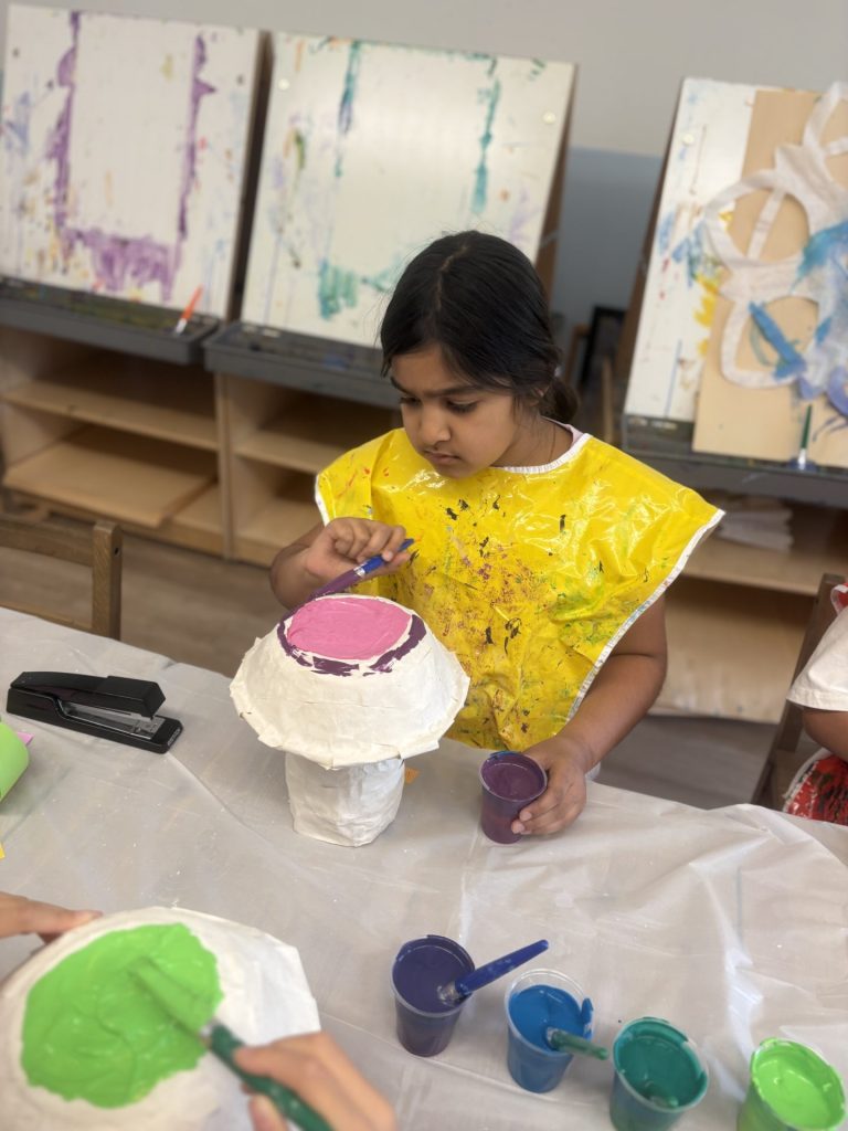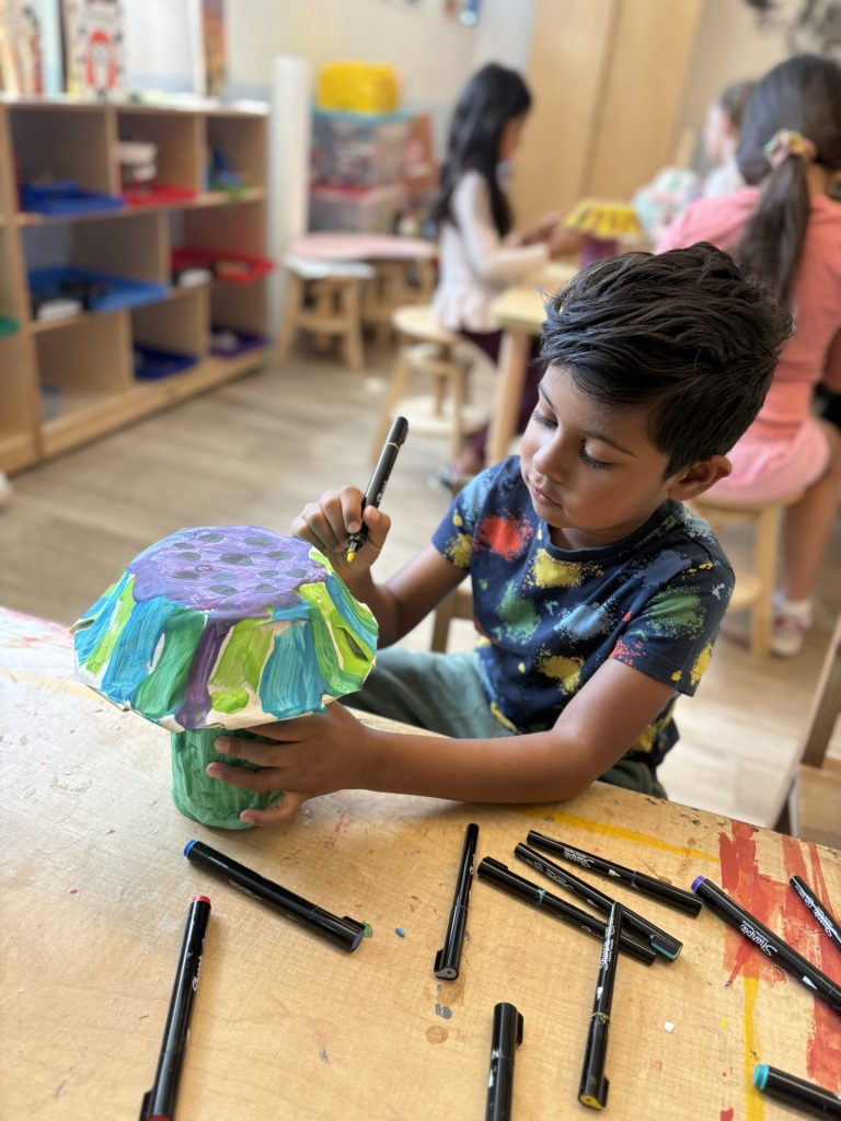 The lower elementary students drew inspiration from Yayoi’s series of mushroom paintings. They constructed their mushrooms using paper cups or water bottles, packaging paper and paper bowls. They covered everything in paper mache and painted their mushrooms in their favorite colors. We looked at all the different kinds of patterns that Yayoi created for her work, and the students used paint pens to recreate some of those patterns on their mushrooms. These bright, whimsical mushrooms are as unique as the child that made them!