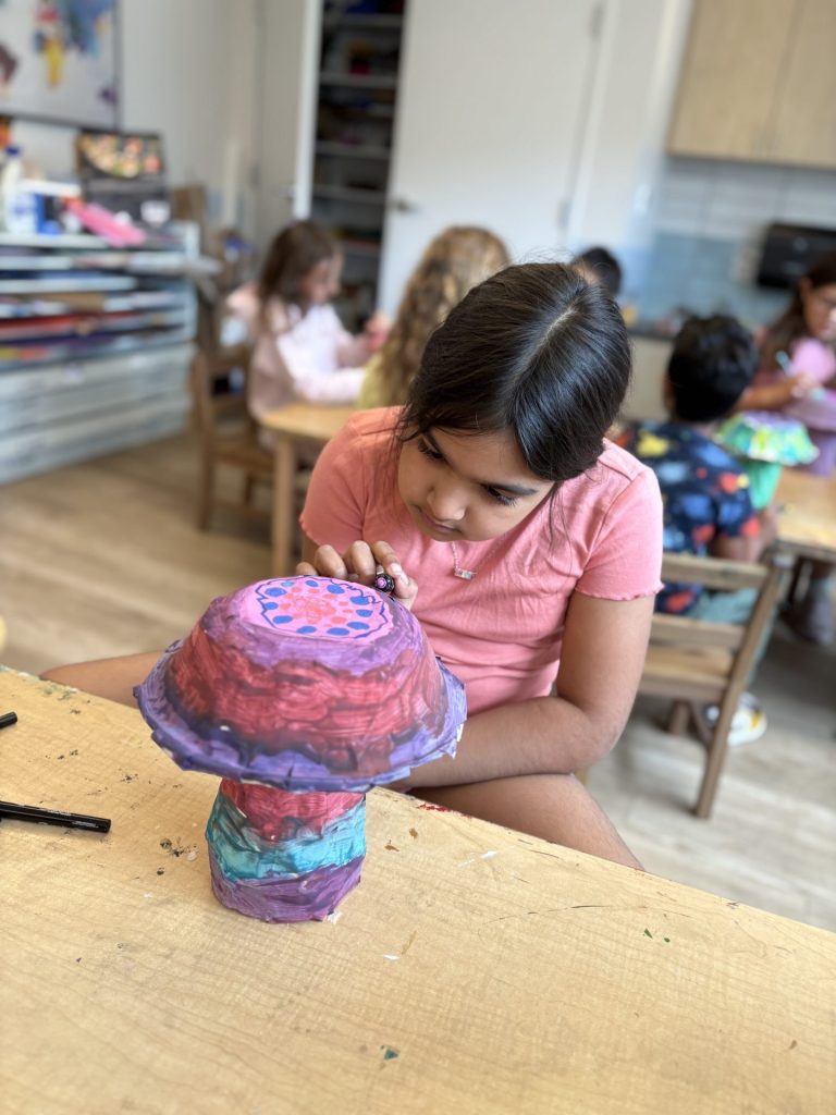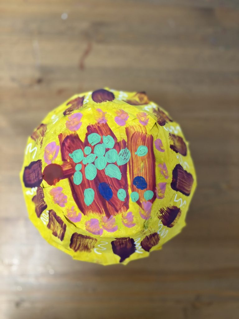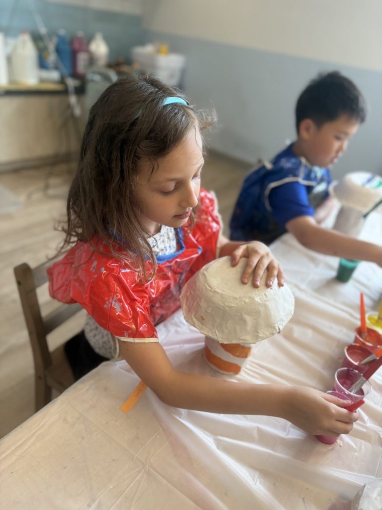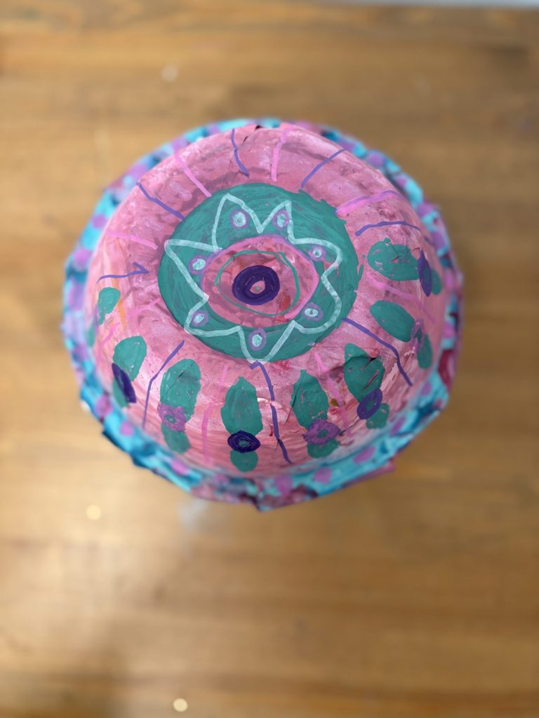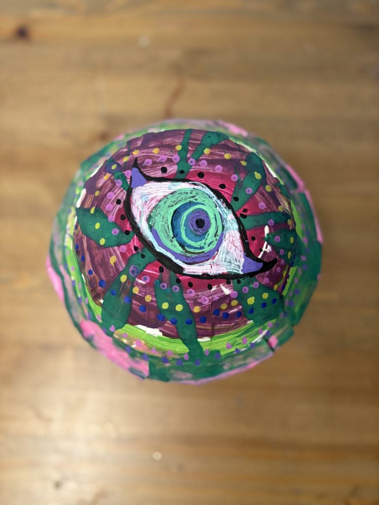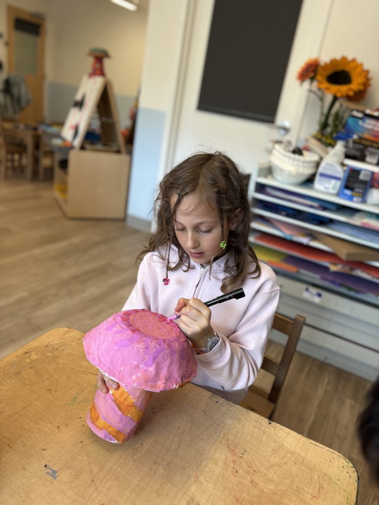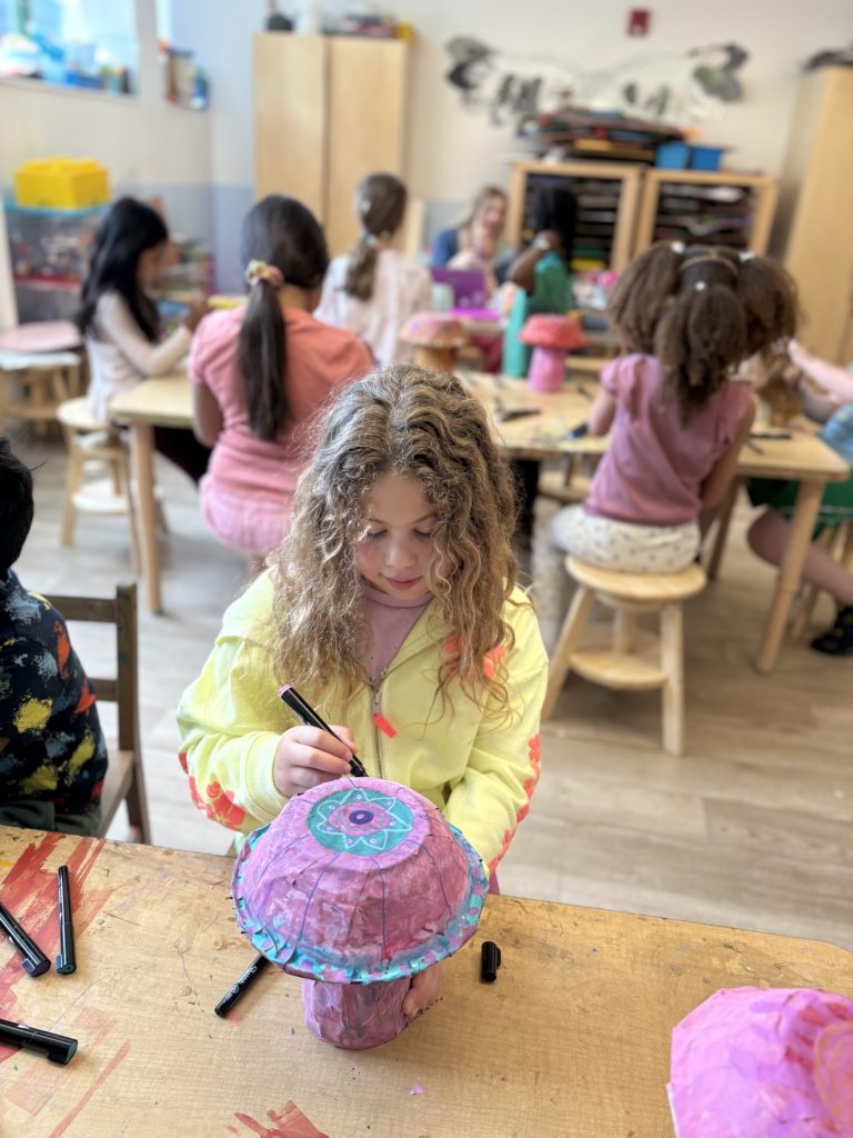 The lower elementary students drew inspiration from Yayoi’s series of mushroom paintings. They constructed their mushrooms using paper cups or water bottles, packaging paper and paper bowls. They covered everything in paper mache and painted their mushrooms in their favorite colors. We looked at all the different kinds of patterns that Yayoi created for her work, and the students used paint pens to recreate some of those patterns on their mushrooms. These bright, whimsical mushrooms are as unique as the child that made them!