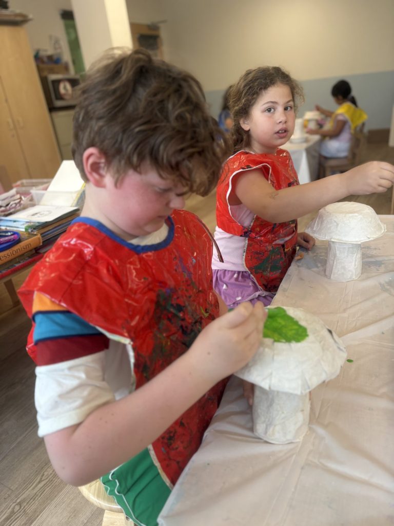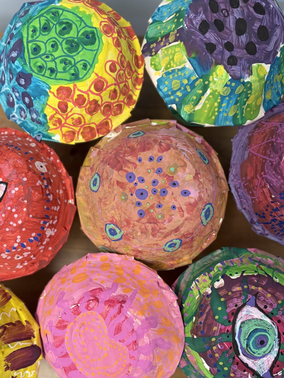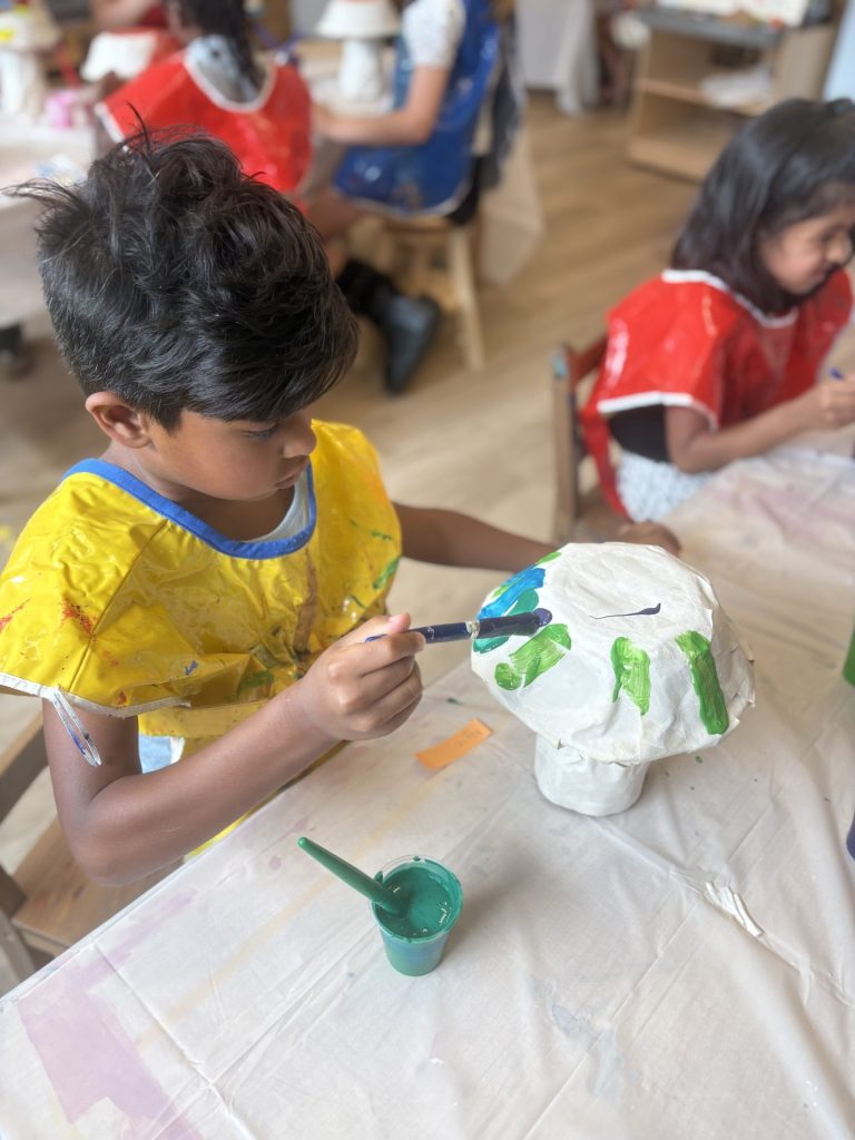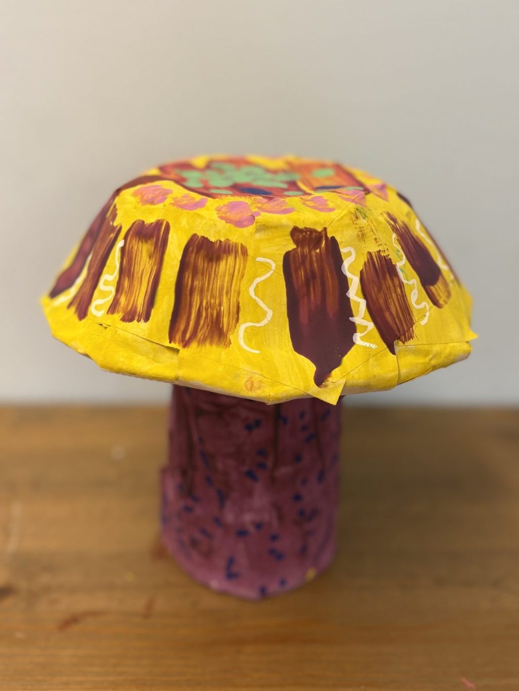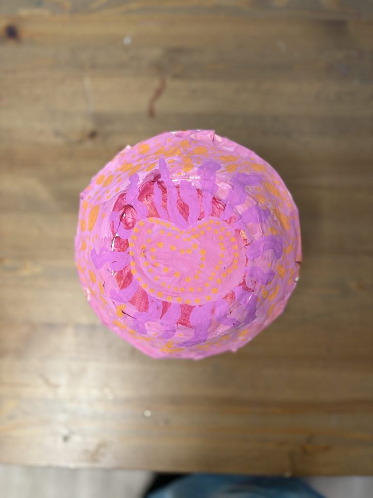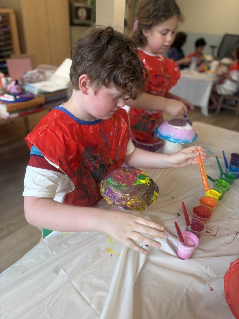 The lower elementary students drew inspiration from Yayoi’s series of mushroom paintings. They constructed their mushrooms using paper cups or water bottles, packaging paper and paper bowls. They covered everything in paper mache and painted their mushrooms in their favorite colors. We looked at all the different kinds of patterns that Yayoi created for her work, and the students used paint pens to recreate some of those patterns on their mushrooms. These bright, whimsical mushrooms are as unique as the child that made them!
