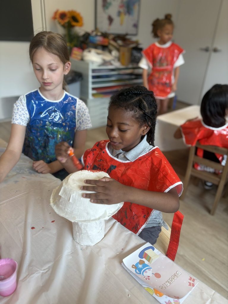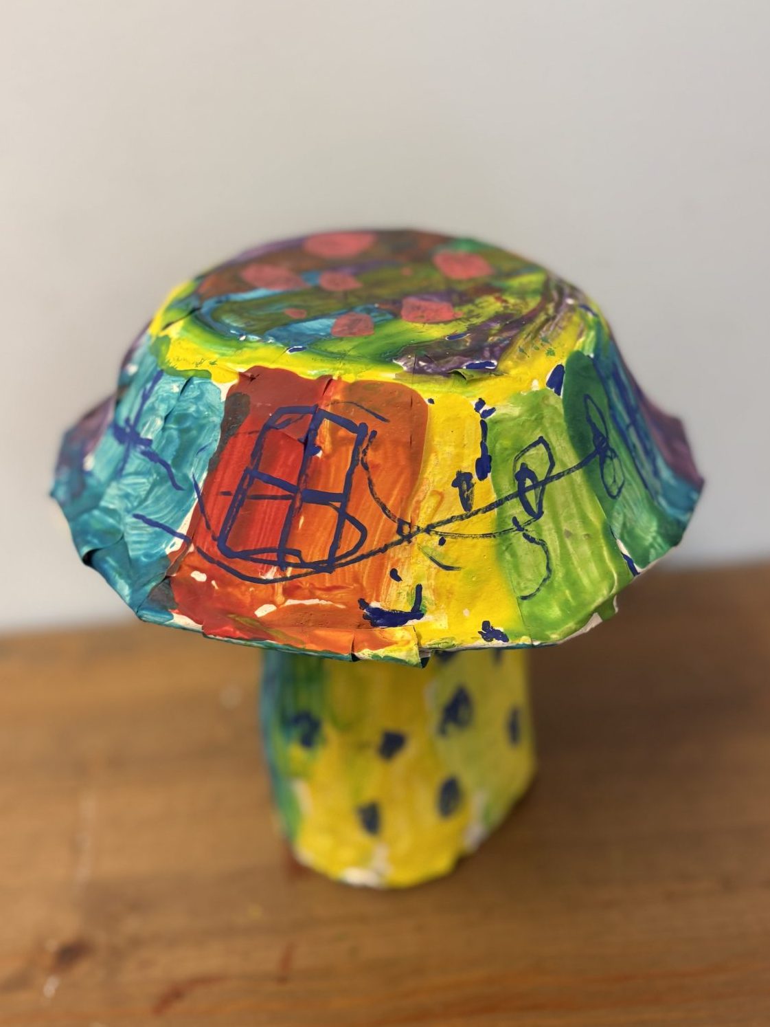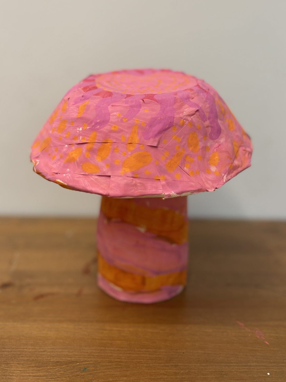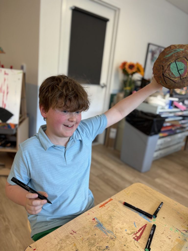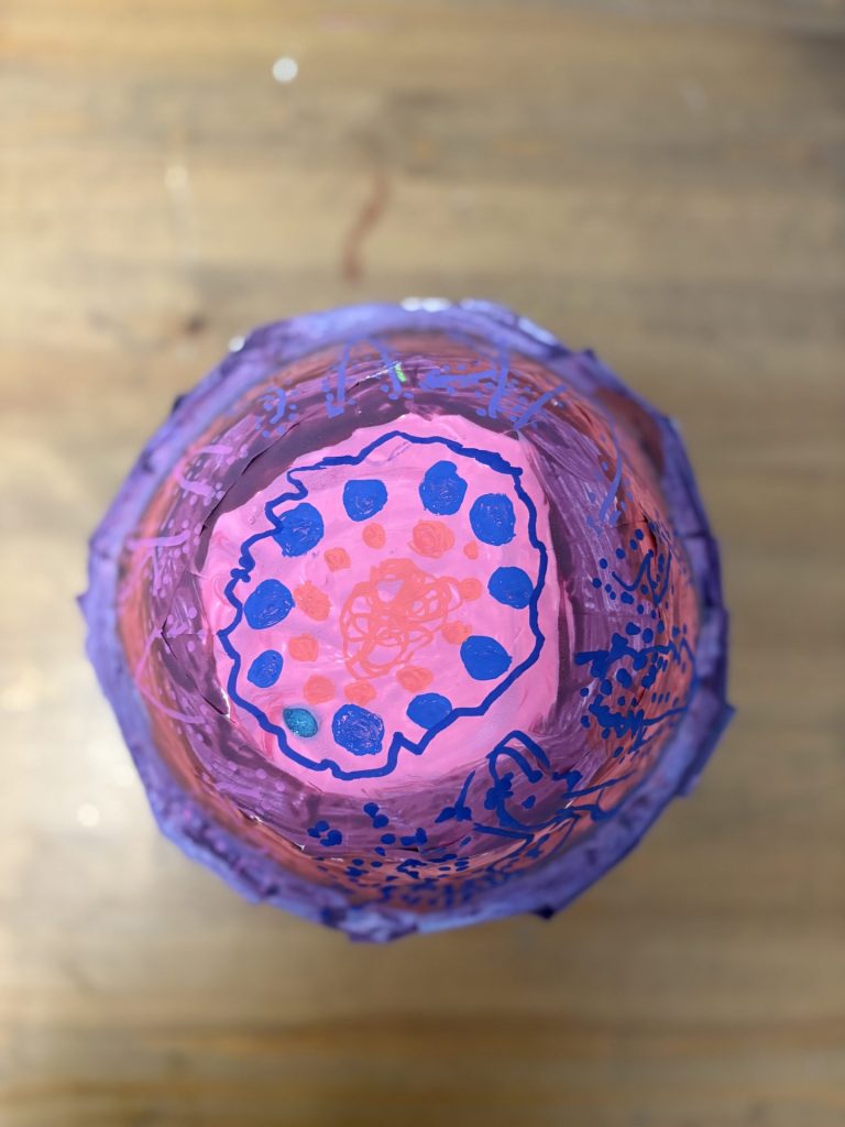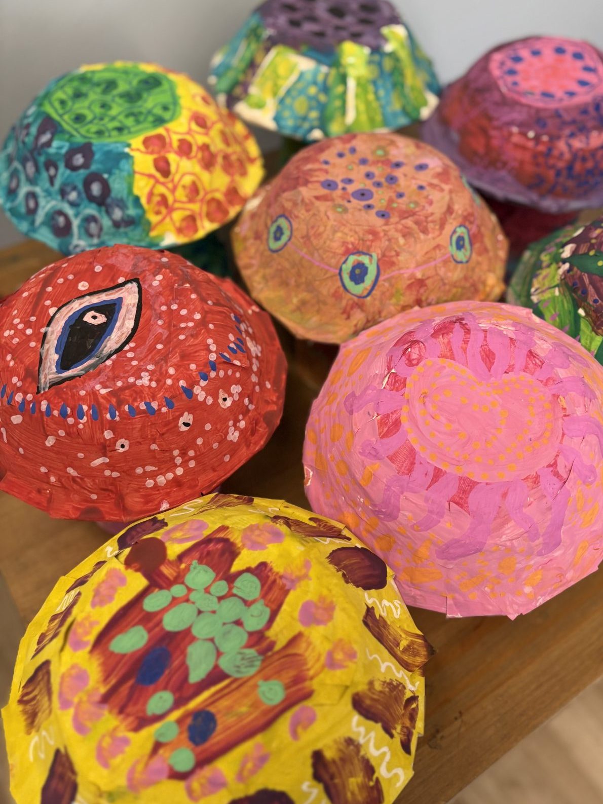 The lower elementary students drew inspiration from Yayoi’s series of mushroom paintings. They constructed their mushrooms using paper cups or water bottles, packaging paper and paper bowls. They covered everything in paper mache and painted their mushrooms in their favorite colors. We looked at all the different kinds of patterns that Yayoi created for her work, and the students used paint pens to recreate some of those patterns on their mushrooms. These bright, whimsical mushrooms are as unique as the child that made them!