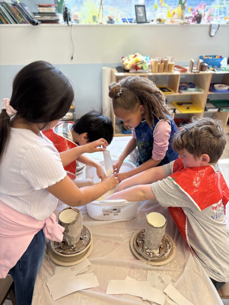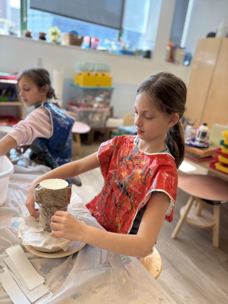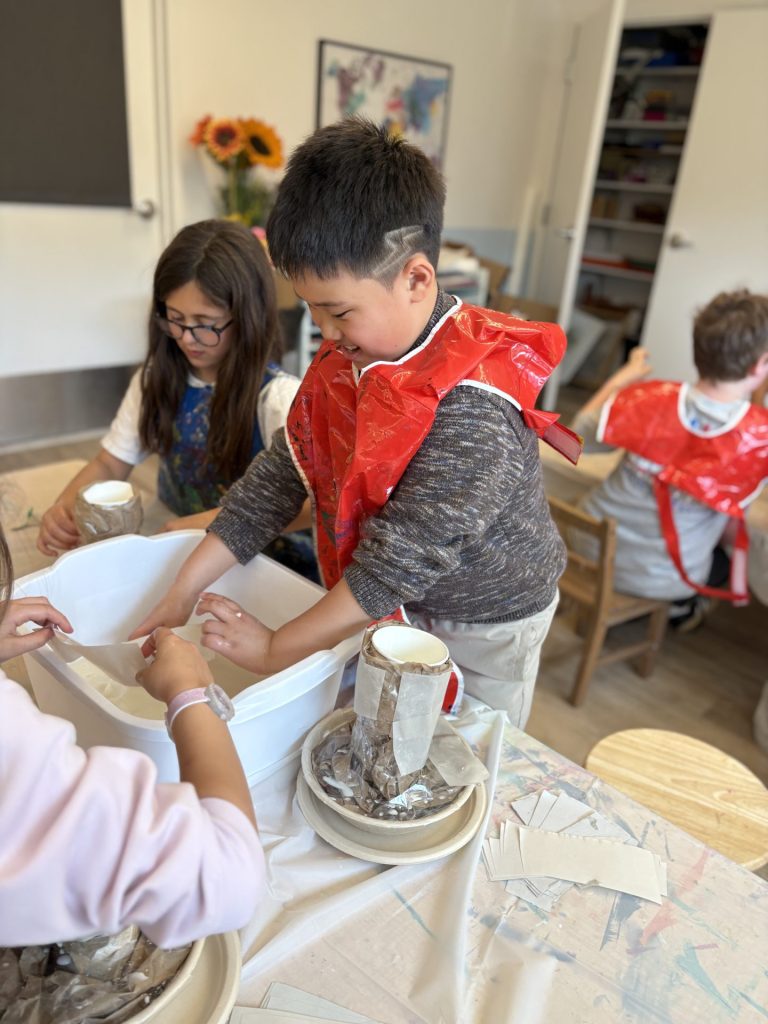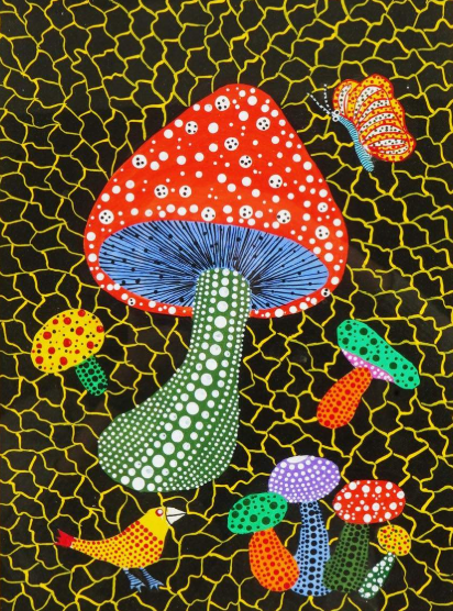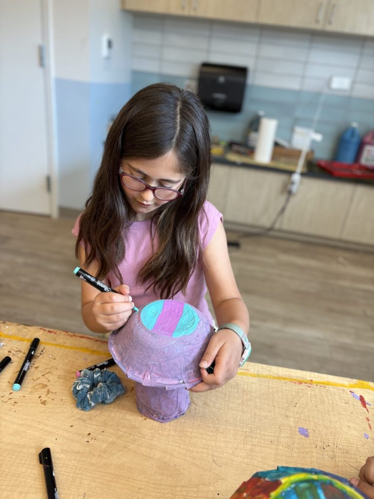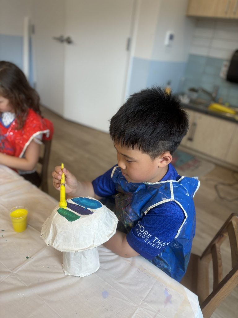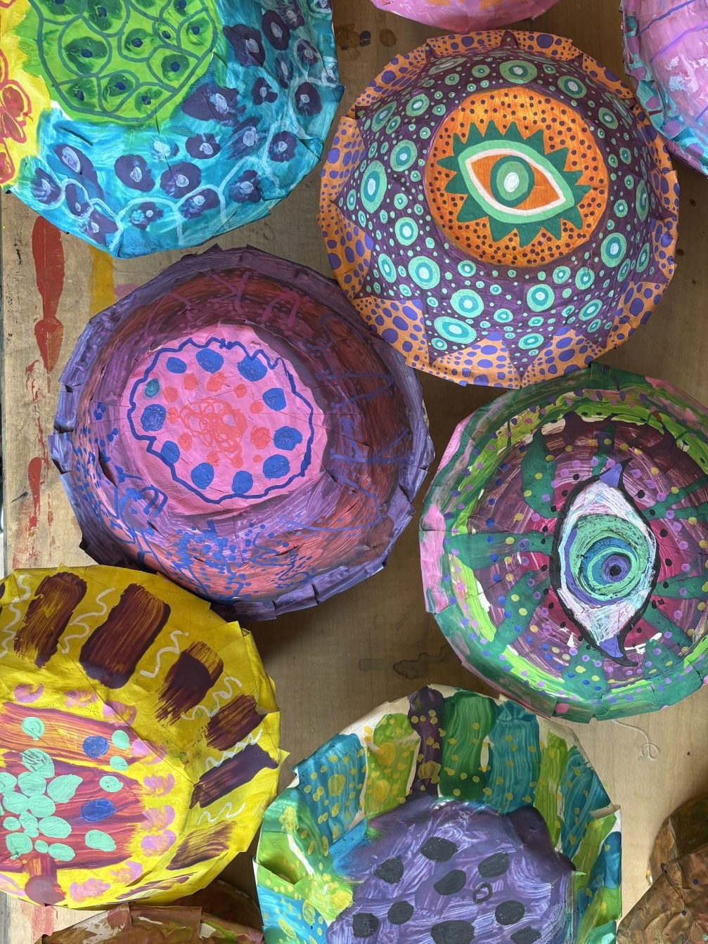 The lower elementary students drew inspiration from Yayoi’s series of mushroom paintings. They constructed their mushrooms using paper cups or water bottles, packaging paper and paper bowls. They covered everything in paper mache and painted their mushrooms in their favorite colors. We looked at all the different kinds of patterns that Yayoi created for her work, and the students used paint pens to recreate some of those patterns on their mushrooms. These bright, whimsical mushrooms are as unique as the child that made them!