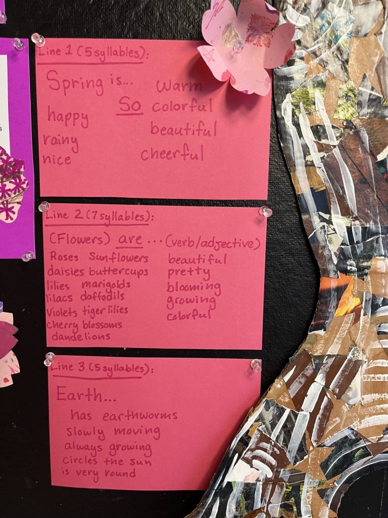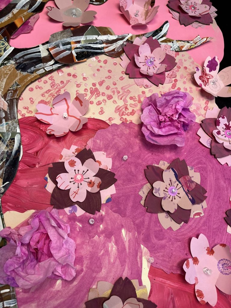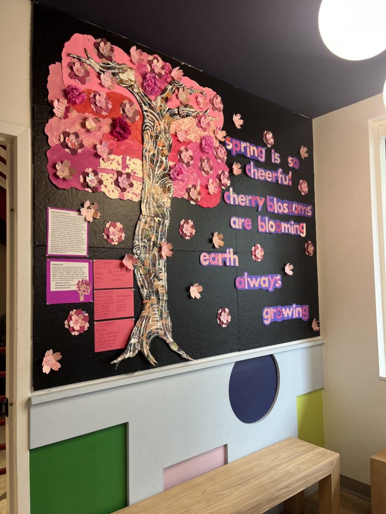 And now spring is in full swing! All around Philadelphia and beyond blossoms have been blooming and decorating our sidewalks in shades of pink. To celebrate the season and honor Earth Day students worked together to create a recycled display, emphasizing the importance of collaboration, community, and repurposing the resources we already have at hand. Some aspects of this project come from past projects that have been reused and repurposed while others were made by some Lower Elementary students and our Kindergartners in their World Around Us classes. We discussed Hanami 花見, the custom of flower viewing in Japan, and places where cherry blossom festivals are held worldwide such as the one in Fairmount Park at Shofuso. Kindergartners explored books and pictures of sakura and printed fabric with the same motif and used that as inspiration for their own blossoms, piecing them together from recycled materials. They also used recycled scraps of magazines and past projects to collage the bark of the sakura tree. Children then worked together as a group to create a haiku. We discussed the structure of these poems (5 syllables, 7 syllables, 5 syllables) and together the students came up with multiple possible choices to put into our haiku template.  Out of the many word associations students came up with these led to our eventual completed haiku: