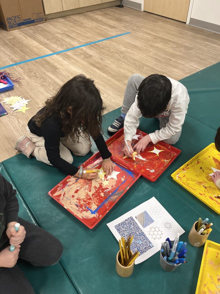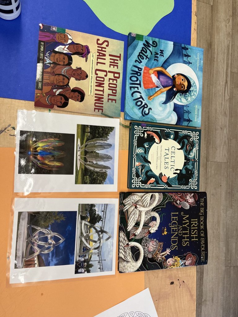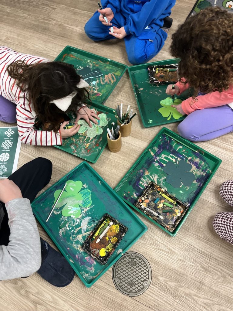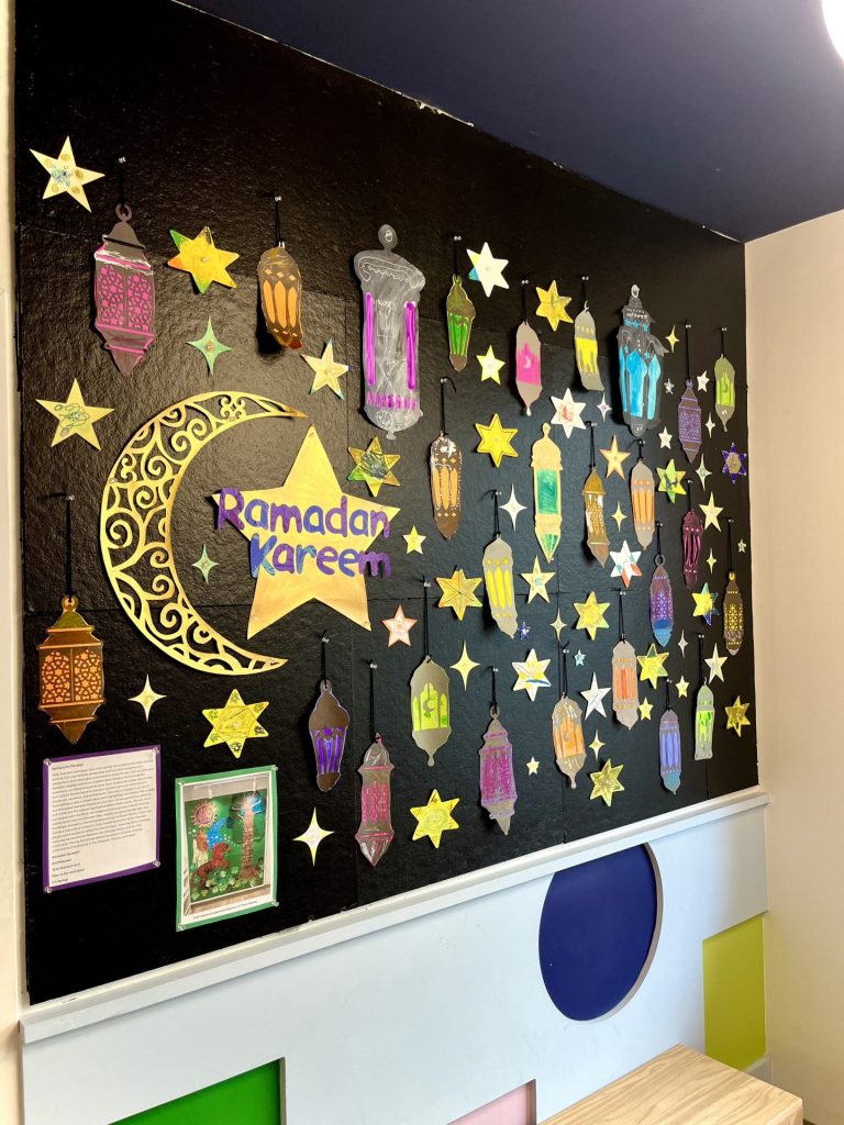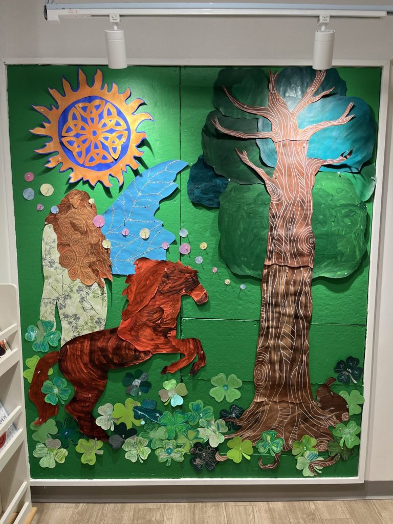 We’ve been moving steadily along through our school year here at Greene Towne. Last month to kick off the start of the spring season students discussed Ramadan, Eid al-Fitr, St. Patrick’s day, Passover, and more. We continued our conversations from the fall on indigenous communities around the world, specifically linking our studies on communities in North America and talking about folklore and legends on a more global scale. Children explored books from our Diversity Library collection, and we discussed how the Choctaw tribe, despite just going through their own hardships, showed care and community to the people of Ireland during the Great Famine. Students also observed examples of Islamic art and Celtic art, taking note of the geometrical patterns, motifs, and the cultural significance behind these works. To reflect these themes students were invited to decorate fanous (lanterns), stars, and shamrocks inspired by the decorative patterns and intricate illustrations. This created a colorful Ramadan display for our first floor lobby along with a communal folklore inspired display for the school’s second floor hallway featuring a transforming faerie queen, a large Sessile Oak (the national tree of Ireland), and an Irish hare (often associated with faerie folk in legend). Themes of transformation and transition loom large in folklore the world over and serve as a means for discussing the transition of seasons, especially the coming of spring. Tà an tEarrach linn! It’s Spring!