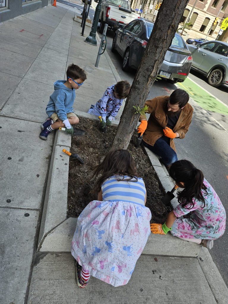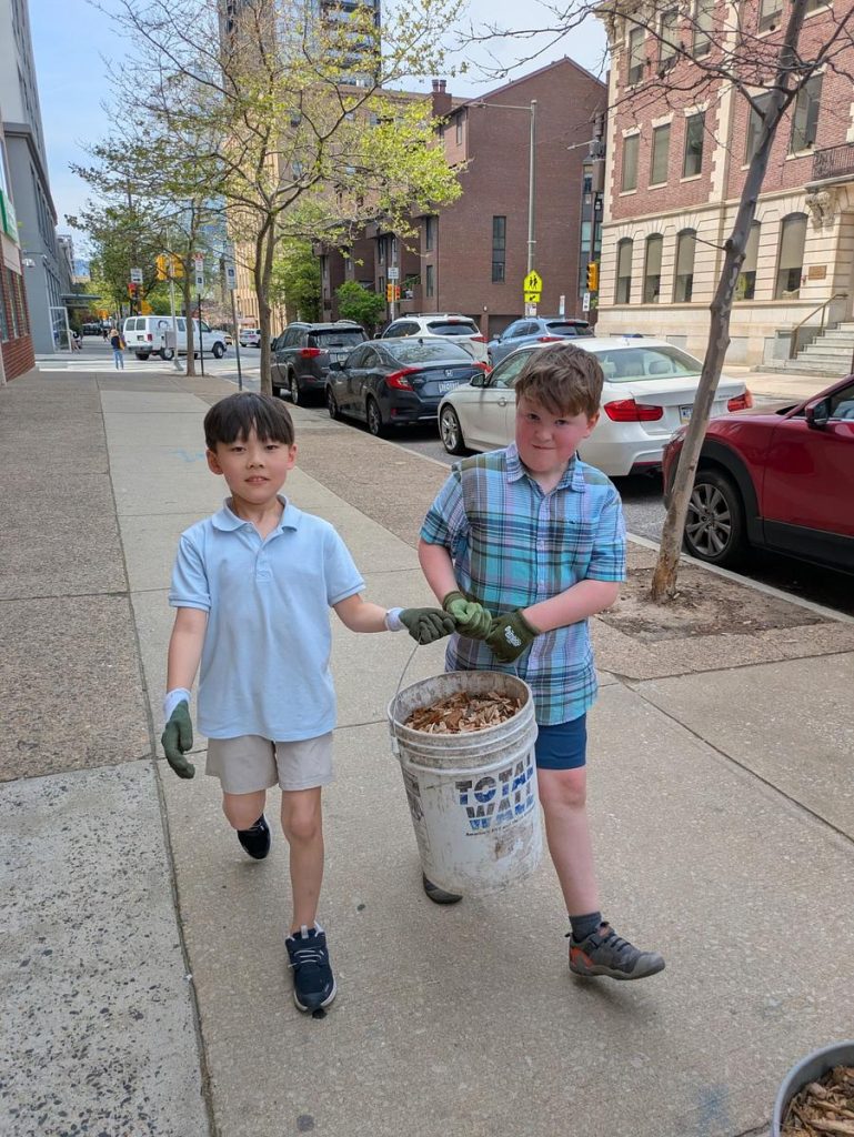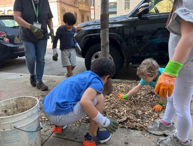 Kindergartners extended their Earth Week learning by sharing what they know about trees, talking about what trees need to live, and caring for the street trees around our school. With help from parent volunteers and faculty, each kindergarten group trekked out with gloves and trowels in hand to loosen the soil around nearby trees so that rain water can reach the roots. Once the soil in the tree pits was loosened, they laid down mulch to keep the trees’ roots cool throughout the summer.