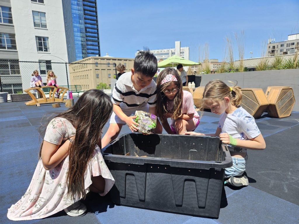 Lower Elementary students also cared for street trees and sorted our worms from finished compost. Expanding on their Earth Week studies, after hearing the Native American story about the three sisters, the 1st graders planted a three sisters garden of corn, beans, and squash. These plant crops work together symbiotically, supporting each other as they grow. We’re all looking forward to harvesting the fruits of their labors through the summer and into the fall.