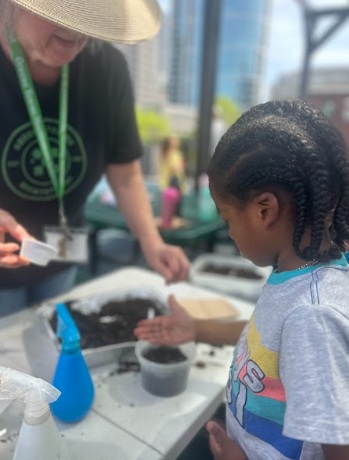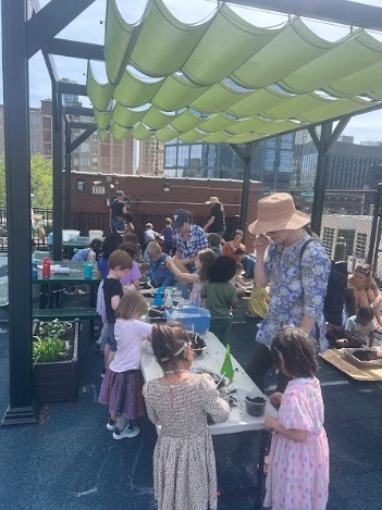Seeing life return to the playdeck and our neighborhood in the spring is such a wonderful opportunity for vocabulary enrichment, plant and animal identification, and nature appreciation. As the seeds sprout and leaf out and flowers bloom, the roofdeck becomes an oasis for our human community as well as the birds and insects.