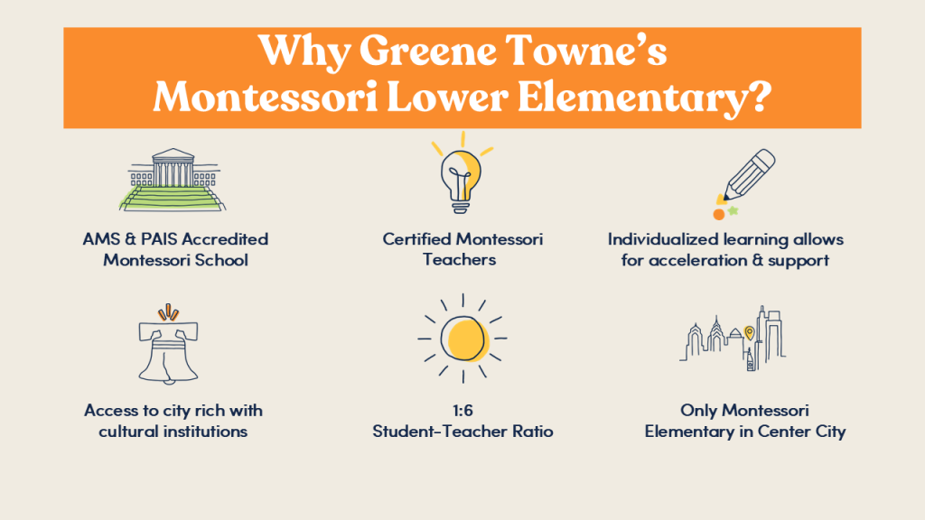 Greene Towne Montessori introduced Lower Elementary (1st – 3rd grades) in Fall of 2023, the first of its kind in Center City Philadelphia and in the school’s history! We are pleased to offer this to current Greene Towne families as well as families coming from other Montessori Primary programs.