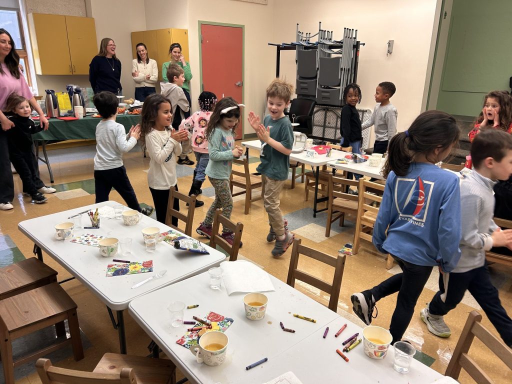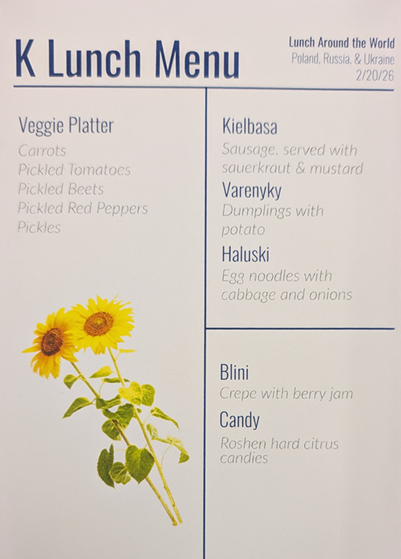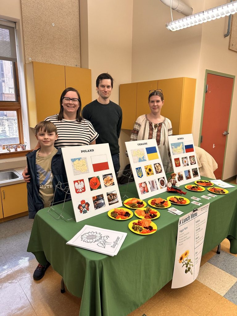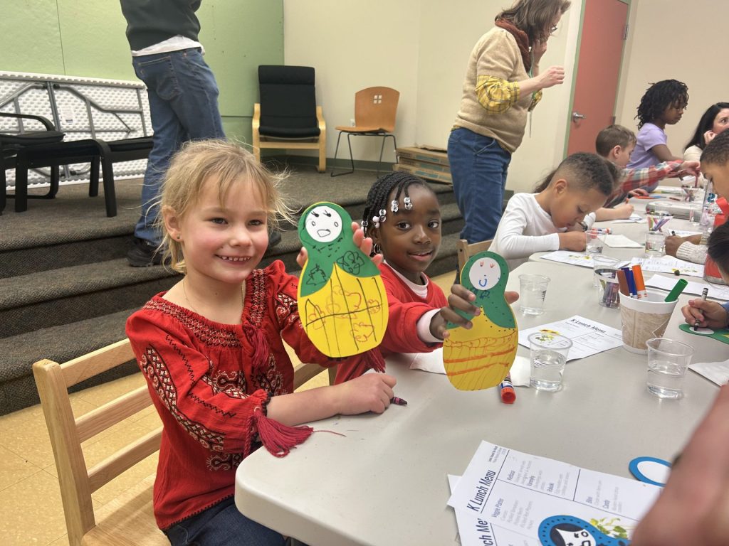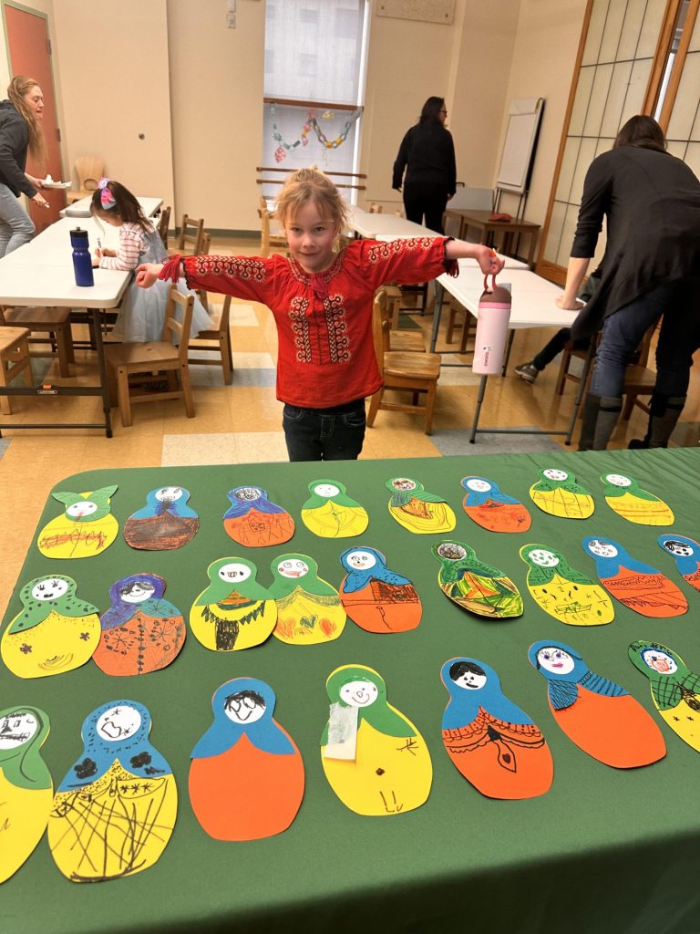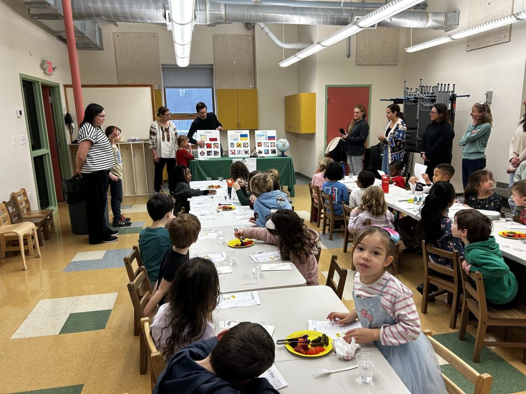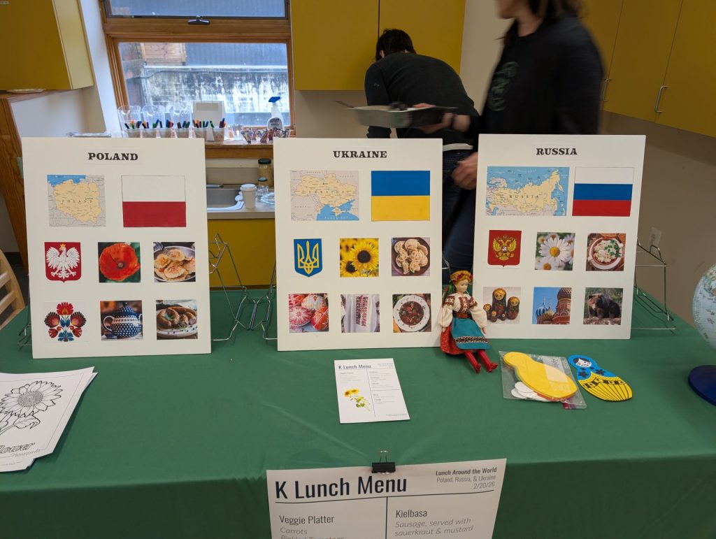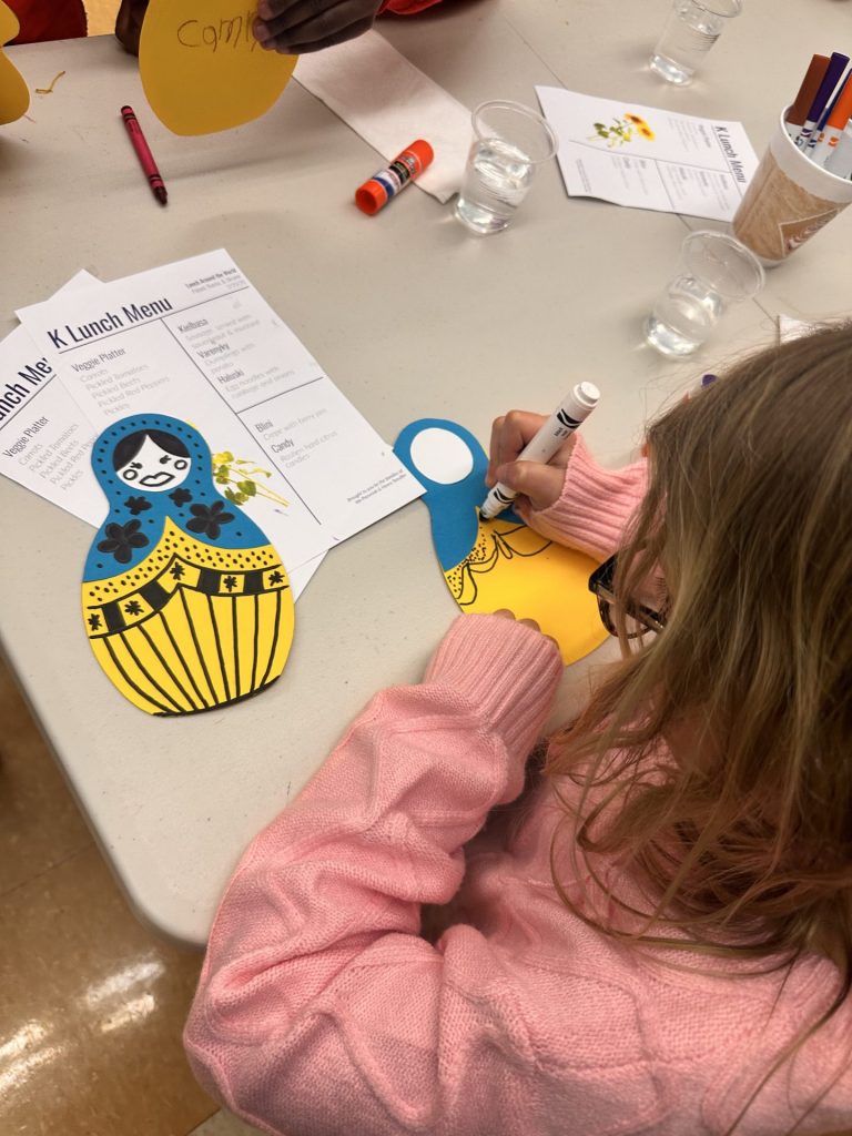 February’s Lunch Around the World brought the Kindergartners together for a shared experience hosted by the Stouffer (Polish) and Pazuniak (Ukrainian/Russian) families. Beautiful posters highlighting Poland, Ukraine and Russia showcased some of the customs for each country. A thoughtfully curated menu was designed representing traditional dishes from each country. After lunch, children decorated nesting dolls and sunflowers.