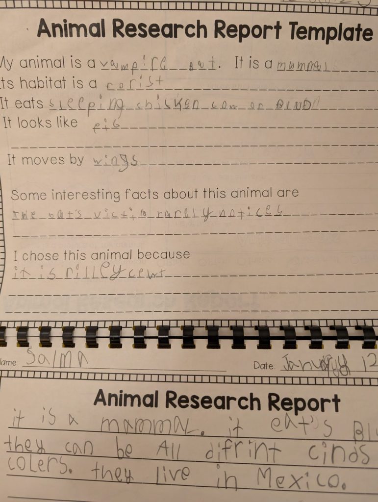 “I am researching a vampire bat in class and asked Teacher Tobey if there was a vampire bat, and she showed me one. It was bigger then I expected.” – First Grader