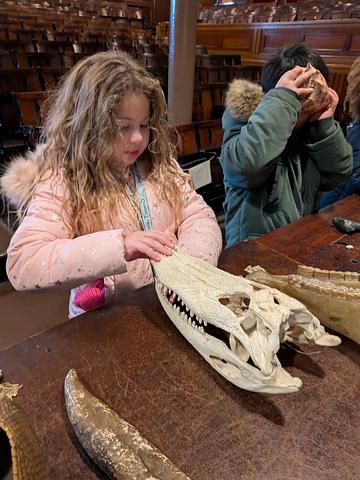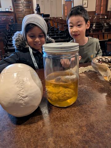 The docent, Tobey, showed a variety of items and shared facts about them. Students had up close access to a wide range of fossils, gems, insects, and so much more. Many of the children noted listening to a shell that sounded like an elephant, touching an alligators mouth and spikey animals, and seeing a brain. Other highlights were seeing a Golden Eagle, dinosaur bones, puffer fish, and snowy owl – a favorite of a third grader who enjoys Harry Potter books.