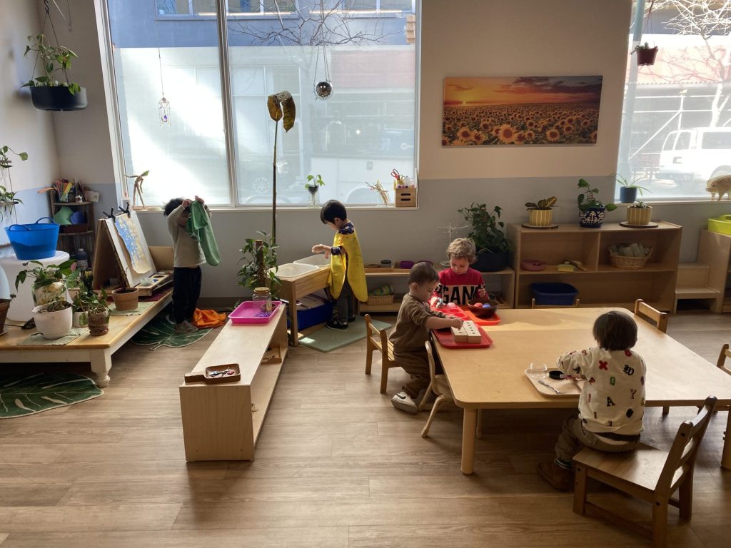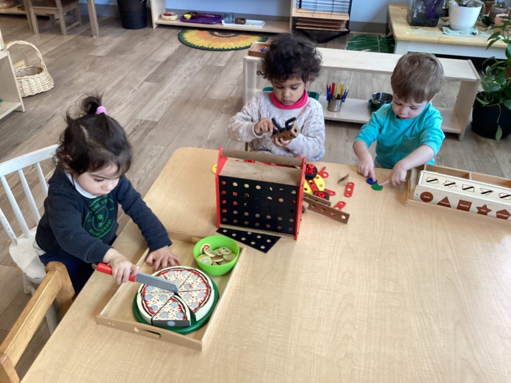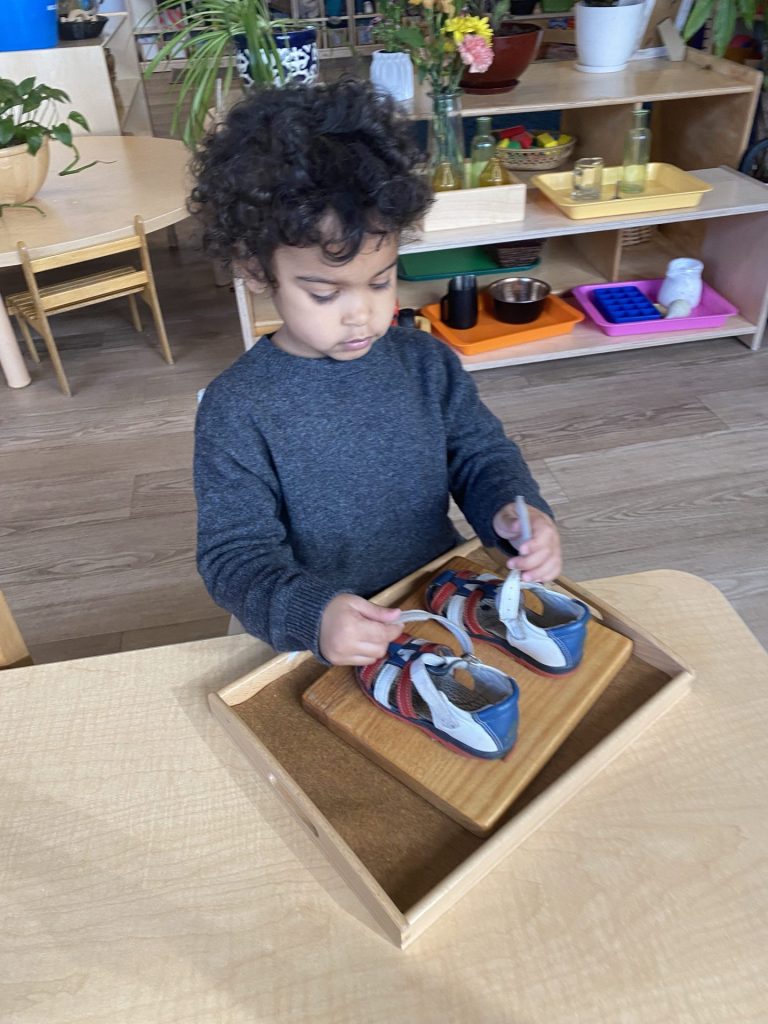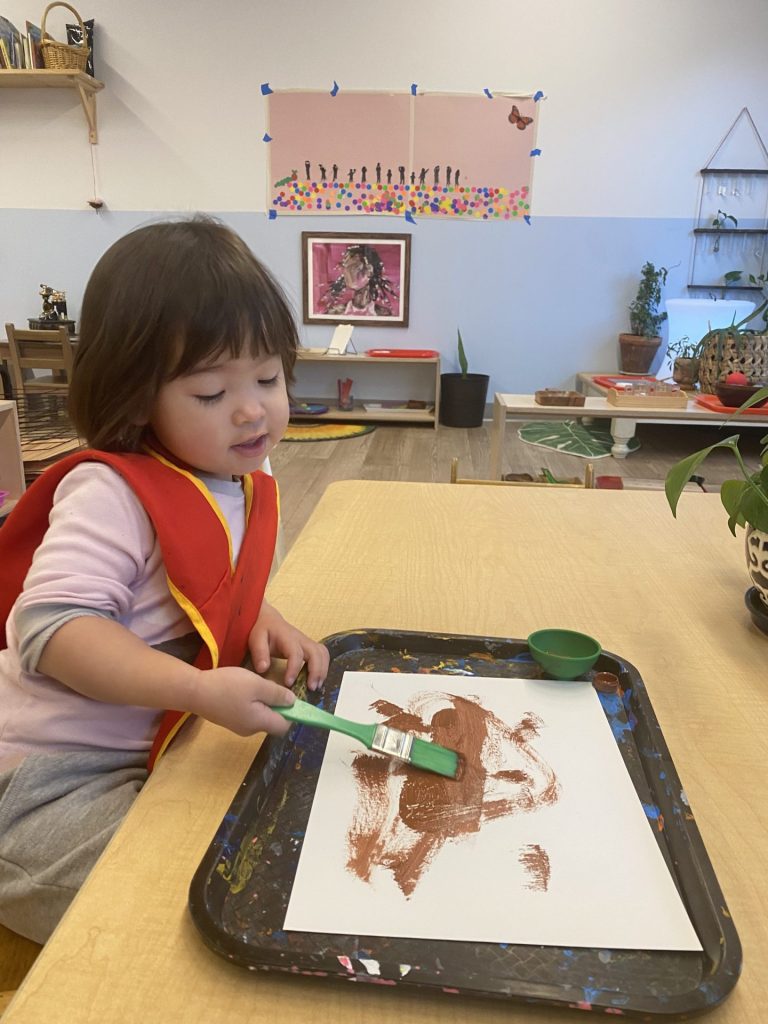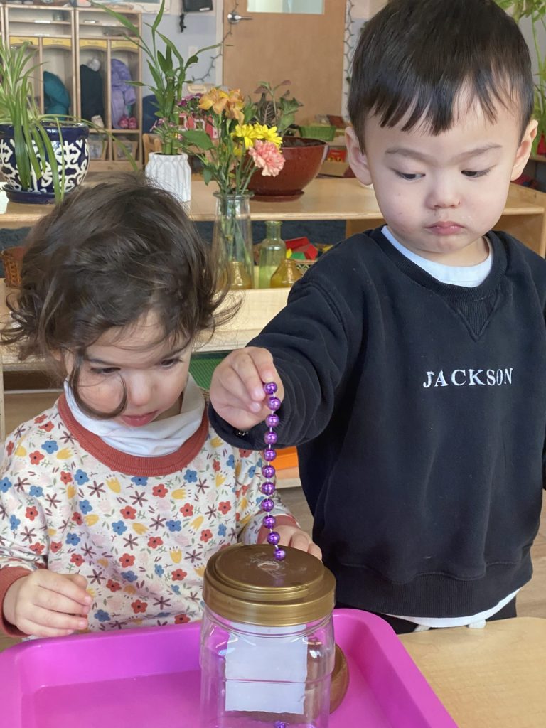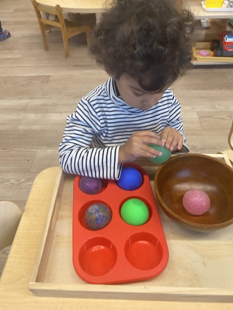 There is the freedom to move within the environment, but more importantly, movement is embedded in the curriculum. Each material requires muscular movement that sends signals to the brain, which builds neurotransmitter connections, leading to a more orderly, disciplined, and regulated child. The children are constantly in motion during their day, whether it is carrying a tray to a table, pushing in a chair, rolling a rug, walking to get a towel, painting at the easel, mixing ingredients, transferring objects via tongs, building with the magnetic tiles, walking to get water, switching their shoes, cutting an apple, sweeping up crumbs, scrubbing the table, etc. Fine movements are just as crucial. The children are feeling how a sound is shaped, manipulating a variety of utensils, twisting off lids, unzipping their jacket and lunch bag, pouring with glass pitchers, building contraptions that require precise movements, hammering nails, cutting with scissors, practicing how to spin a dreidel, etc. They are always moving and therefore always refining and strengthening their skills. As their skills strengthen, so does their independence.