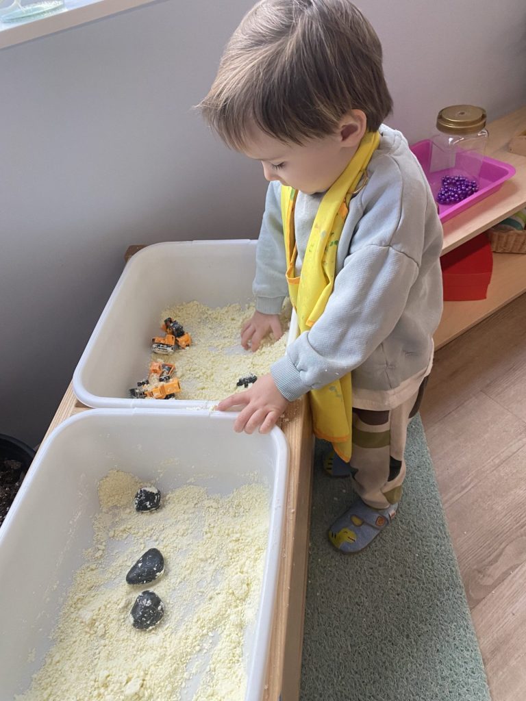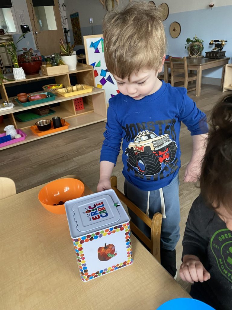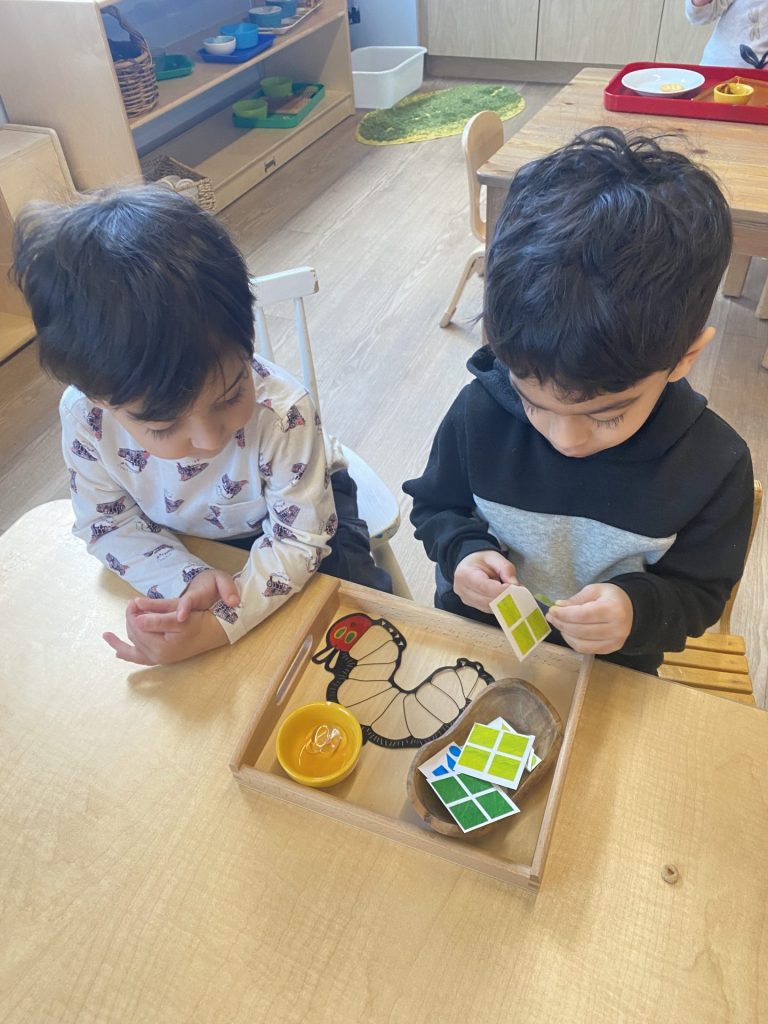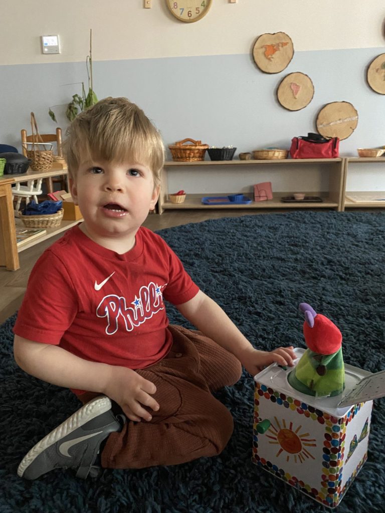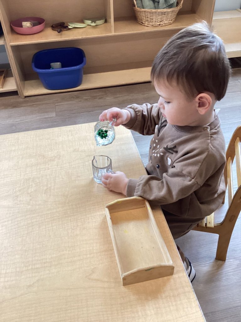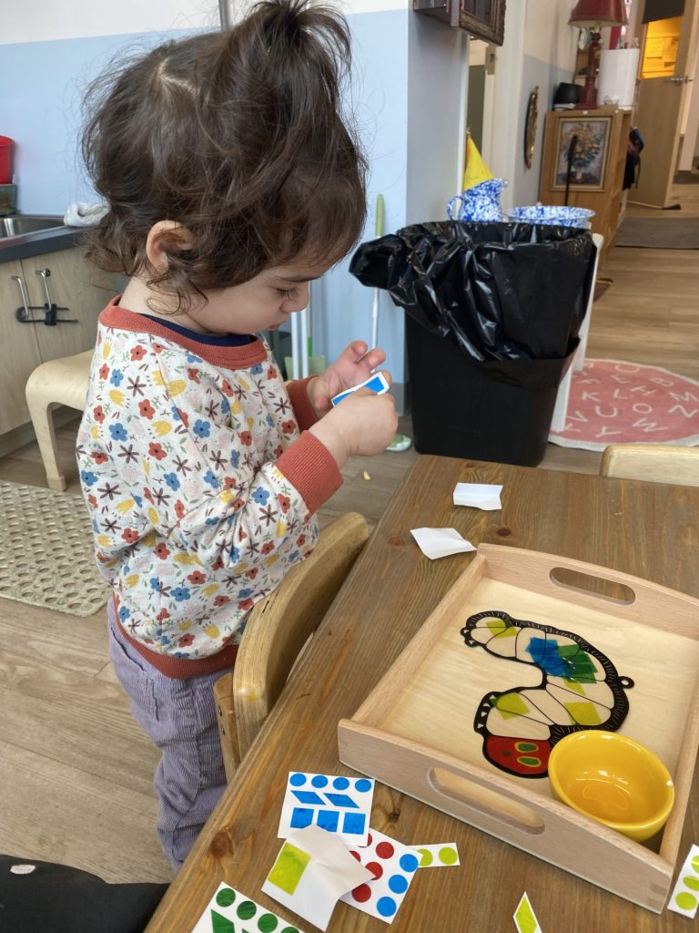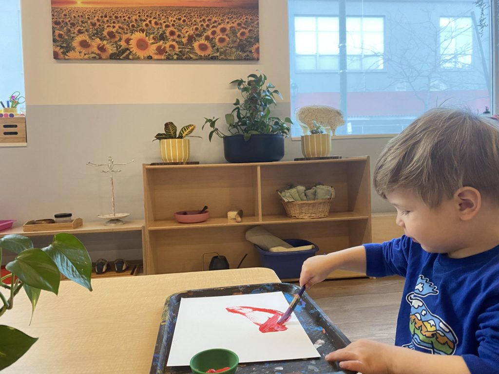 There is the freedom to move within the environment, but more importantly, movement is embedded in the curriculum. Each material requires muscular movement that sends signals to the brain, which builds neurotransmitter connections, leading to a more orderly, disciplined, and regulated child. The children are constantly in motion during their day, whether it is carrying a tray to a table, pushing in a chair, rolling a rug, walking to get a towel, painting at the easel, mixing ingredients, transferring objects via tongs, building with the magnetic tiles, walking to get water, switching their shoes, cutting an apple, sweeping up crumbs, scrubbing the table, etc. Fine movements are just as crucial. The children are feeling how a sound is shaped, manipulating a variety of utensils, twisting off lids, unzipping their jacket and lunch bag, pouring with glass pitchers, building contraptions that require precise movements, hammering nails, cutting with scissors, practicing how to spin a dreidel, etc. They are always moving and therefore always refining and strengthening their skills. As their skills strengthen, so does their independence.