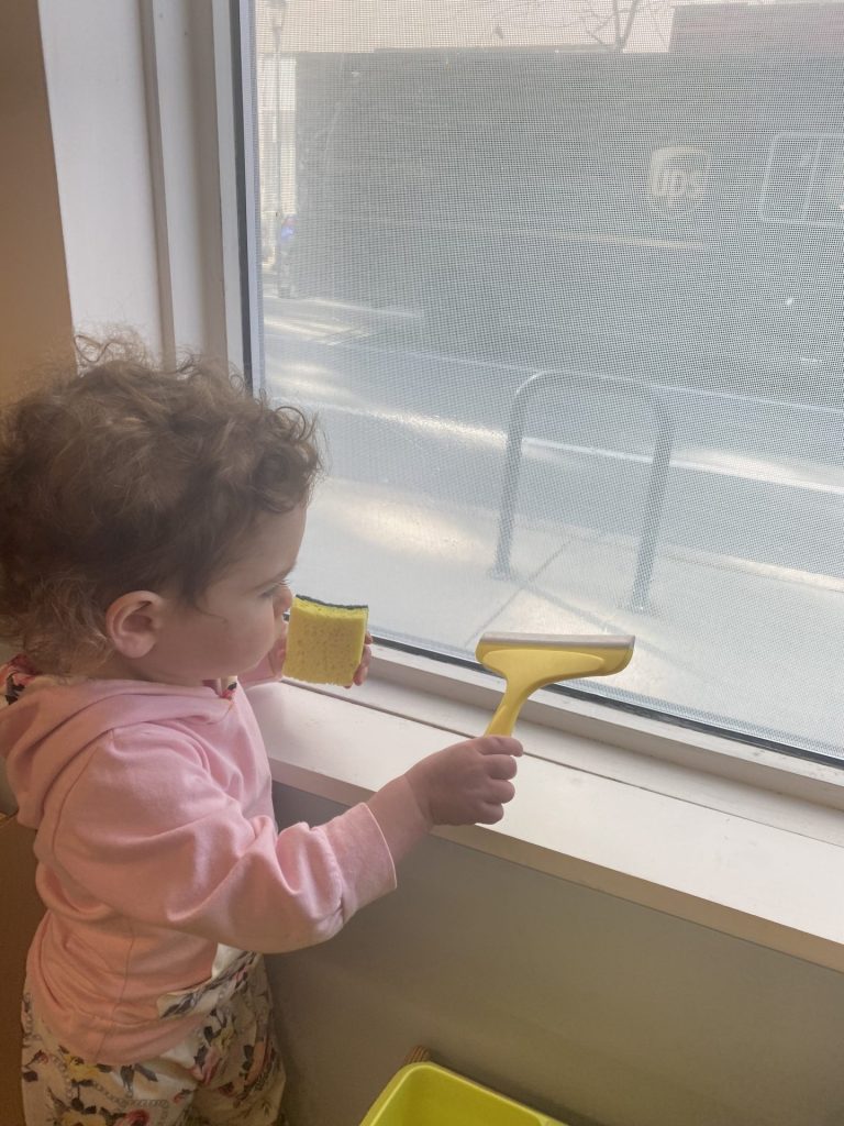 All people, especially toddlers, will show signs of a weak core at some point. It is when they are showing consistent signs that we should partner together to be more intentional with the work in the classroom and play time at home. In the classroom, I will present work like a Lego wall or magnetic stand that promote pushing and pulling while standing. This is the same for a child-sized carpet sweeper, swiffer, and broom. The chalkboard walls in the movement room and on the Playdeck allow children to move their bodies vertically and horizontally, and cleaning chalk off of the walls promotes muscle strengthening as well. This is the same for window washing and table scrubbing.