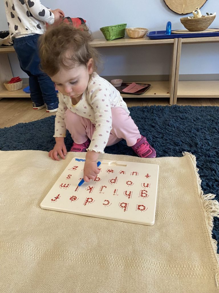 Years ago, I had a toddler with a predilection for letterwork. They were enamored with the sounds and sandpaper letters, and before leaving my environment, began piecing together 3 lettered words. In the Primary environment, this child struggled with letter work and focus. After some discussions and observations, the adults noticed this child was exhibiting signs of a weak core and, with the help of an occupational therapist, guided the child in stabilizing their body while sitting in a chair by wrapping their feet around the legs of the chair. After this minute change, the child was able to focus and continued their love for letter work with ease.