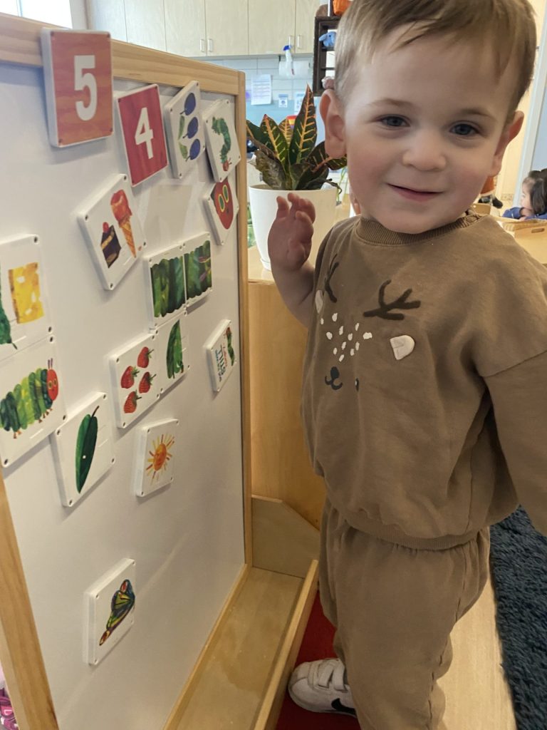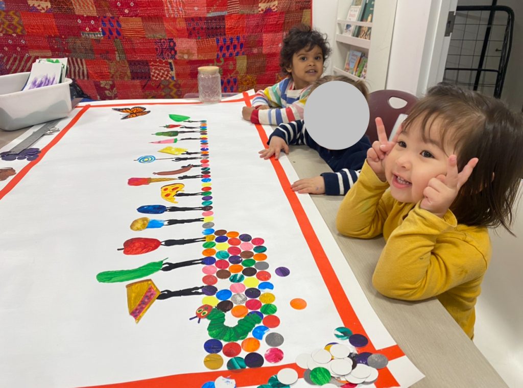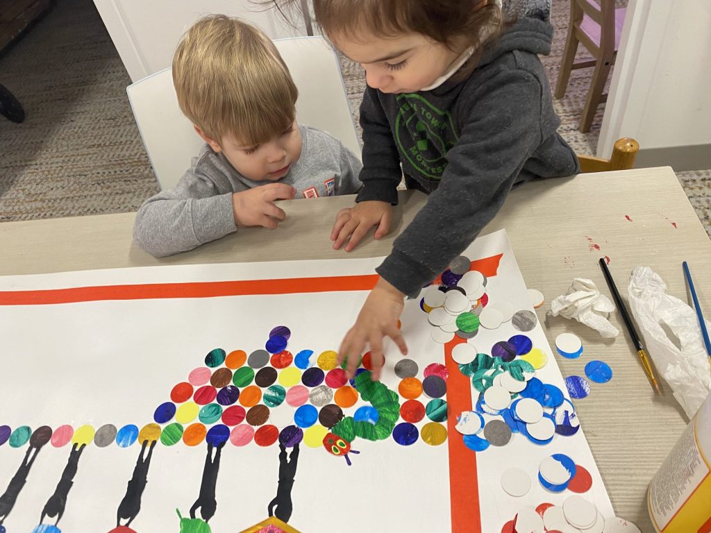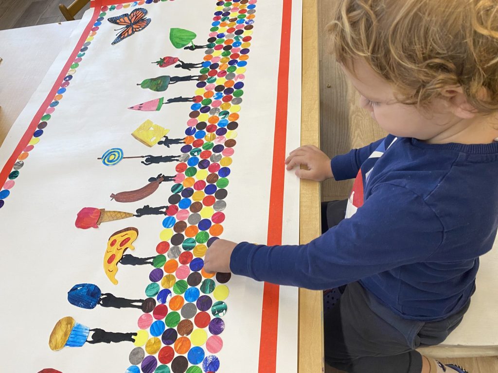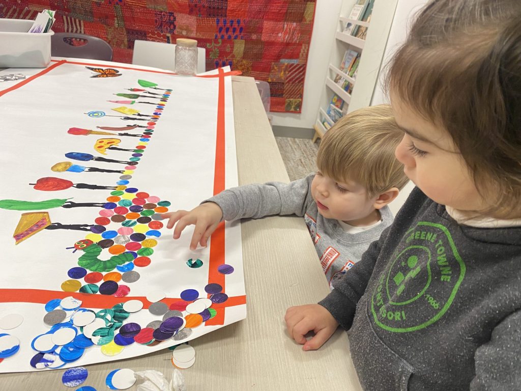 The children have been busy painting for our auction project and helping glue on the dots! They (to be honest, we) have been so excited about creating our project that The Very Hungry Caterpillar has crept into our classroom in various ways.