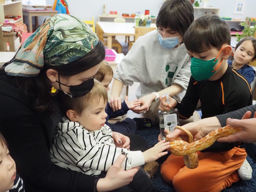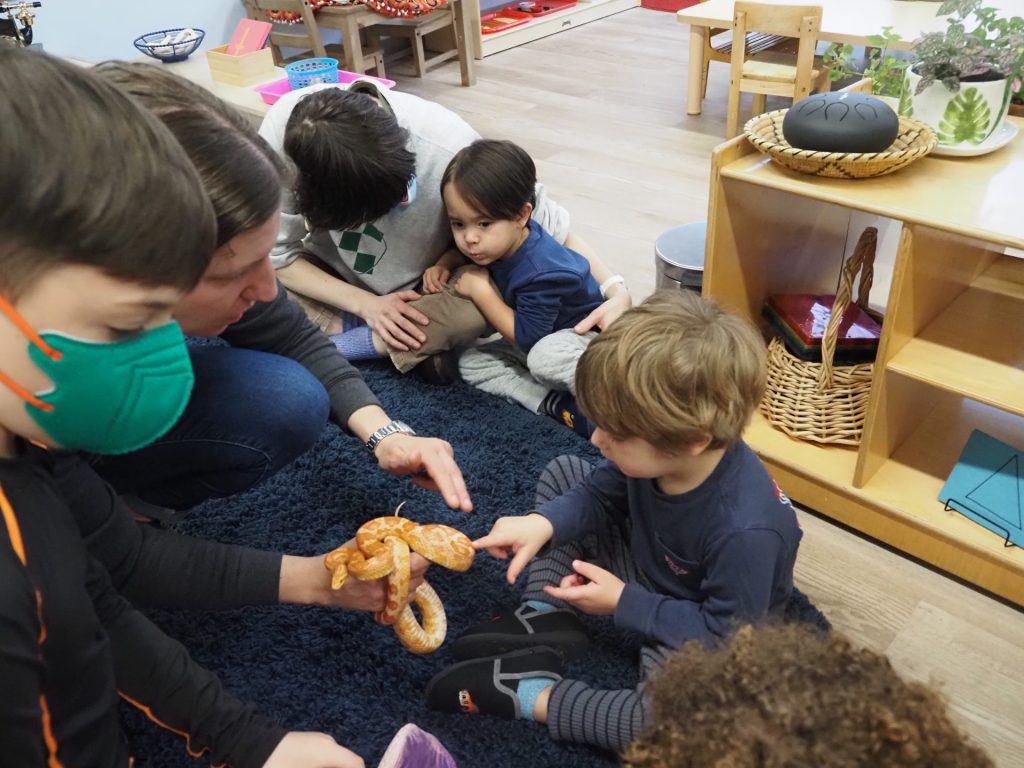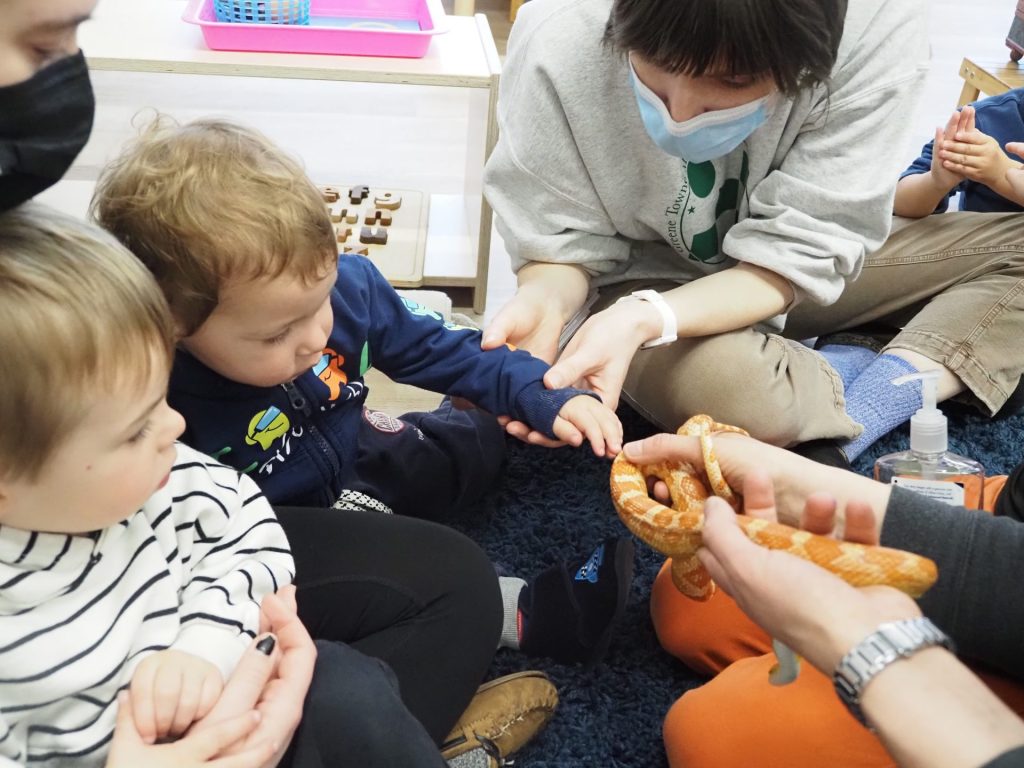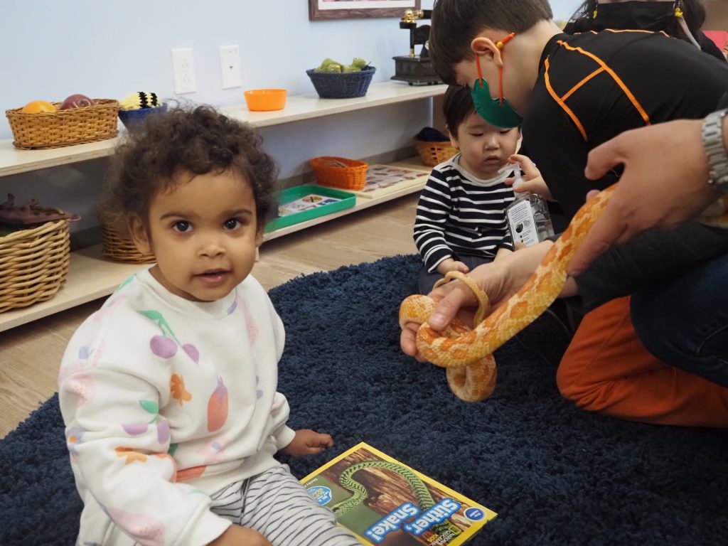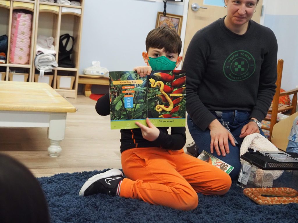Another highlight from this past month was inviting Ms. Shelby’s snake, Hoagie, who resides in Mr. Patrick’s room, into our classroom. The children listened as two friends read books about snakes like they use their tongues to breathe. Then the children were able to pet Hoagie and some were interested in holding Hoagie… and some were not, and that is ok too.