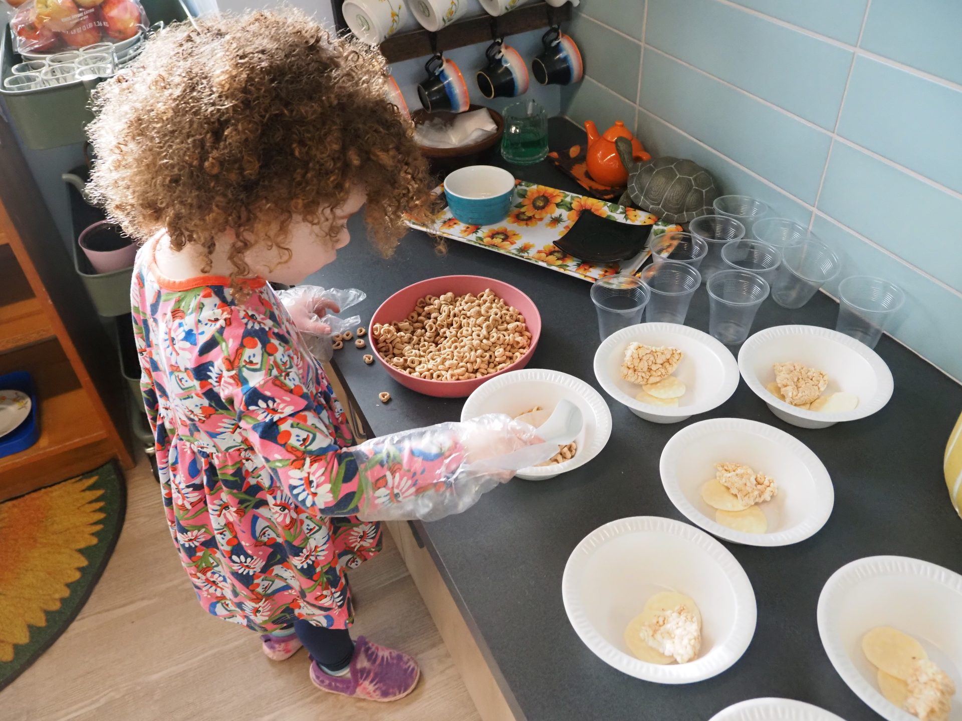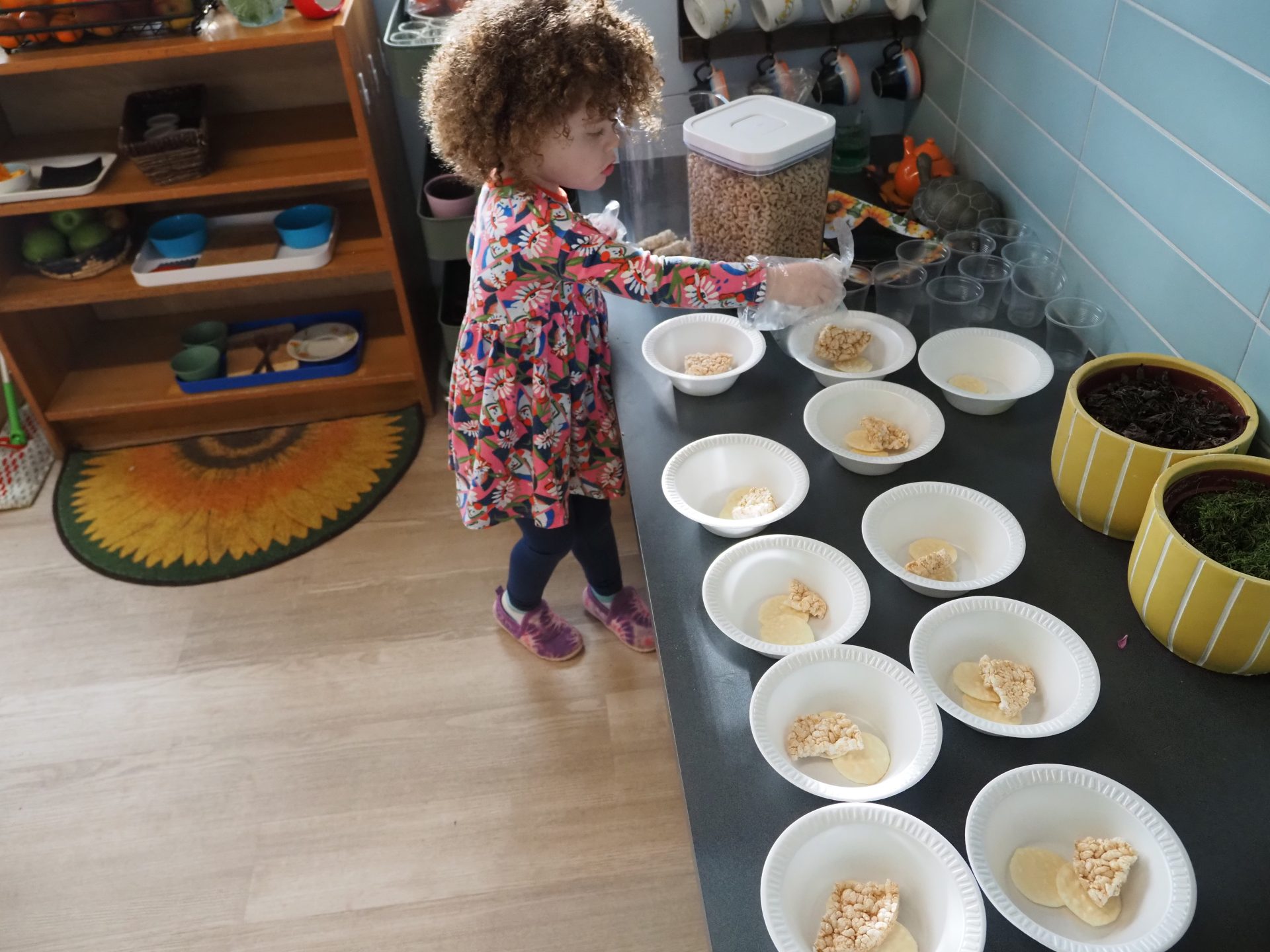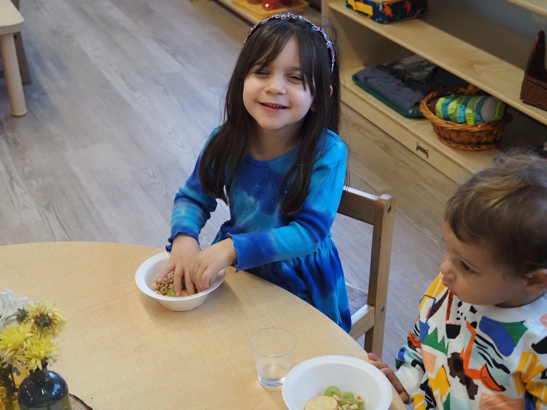 October 2022: This month’s blog highlights the food preparation work in our classroom, allergen-safe treats for birthday celebrations, ingredients and instructions for independent baking work, and how children can practice “up & over” which is how we show them to put jackets on without any assistance.