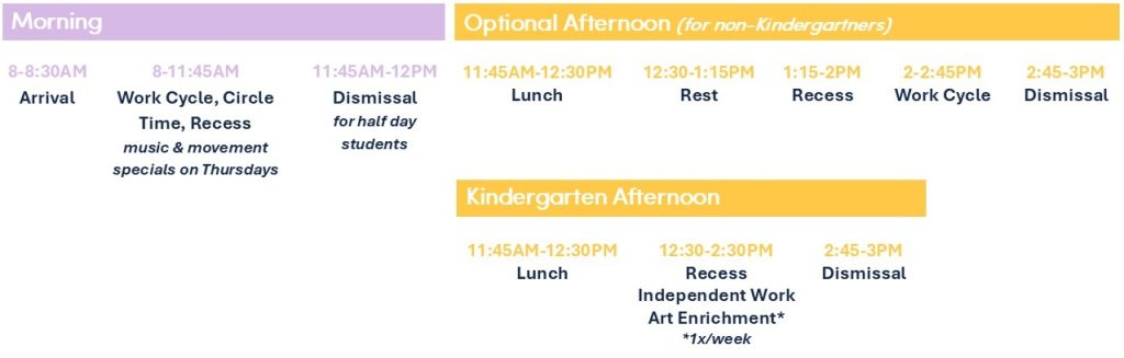 All children attend five mornings a week with the option to add early afternoons. Kindergartners attend from 8 a.m. – 3 p.m.
