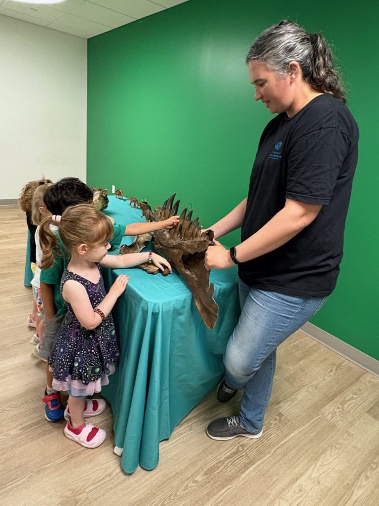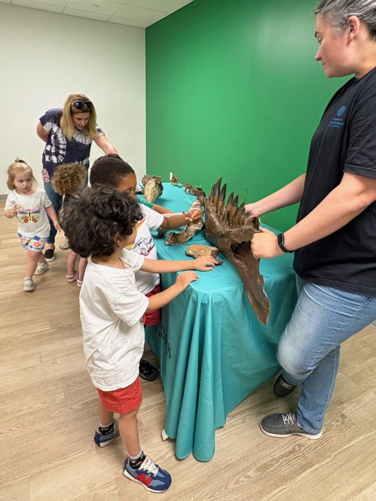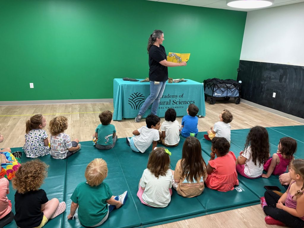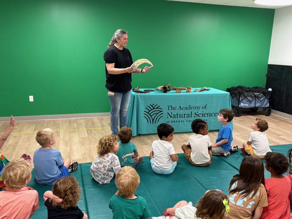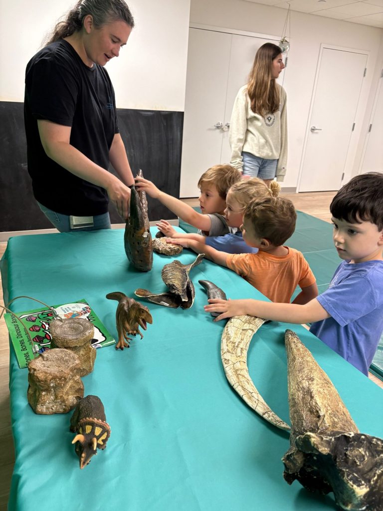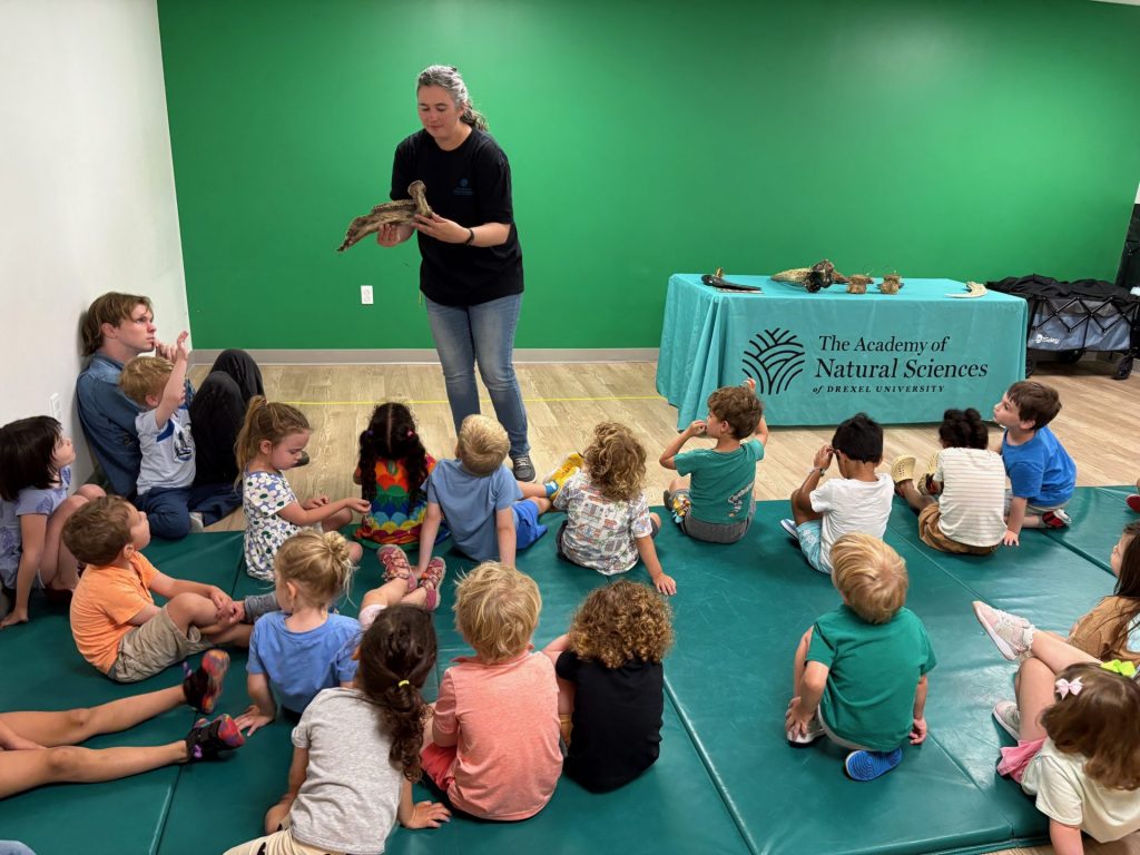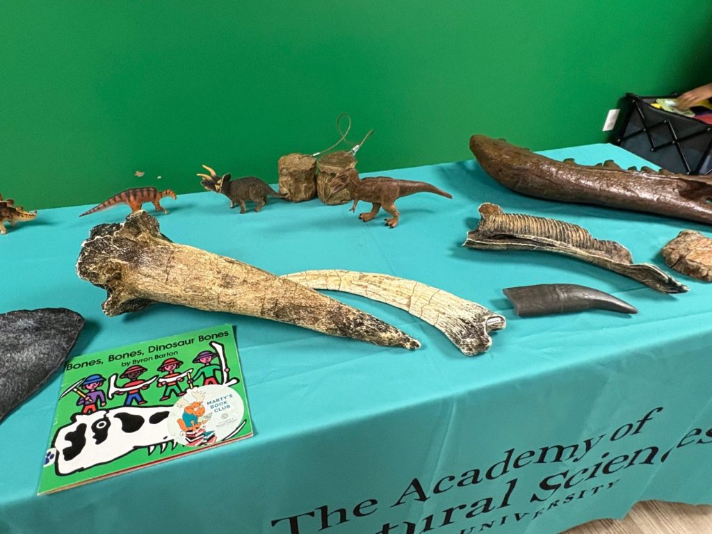 The Academy of Natural Sciences presented a “Discovering Dinosaurs” workshop. The scientist, Kaitlyn started off by reading Bones, Bones, Dinosaur Bones by Byron Barton.