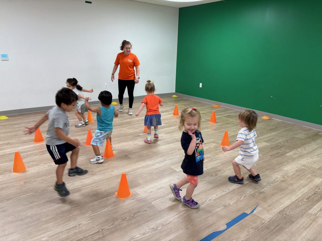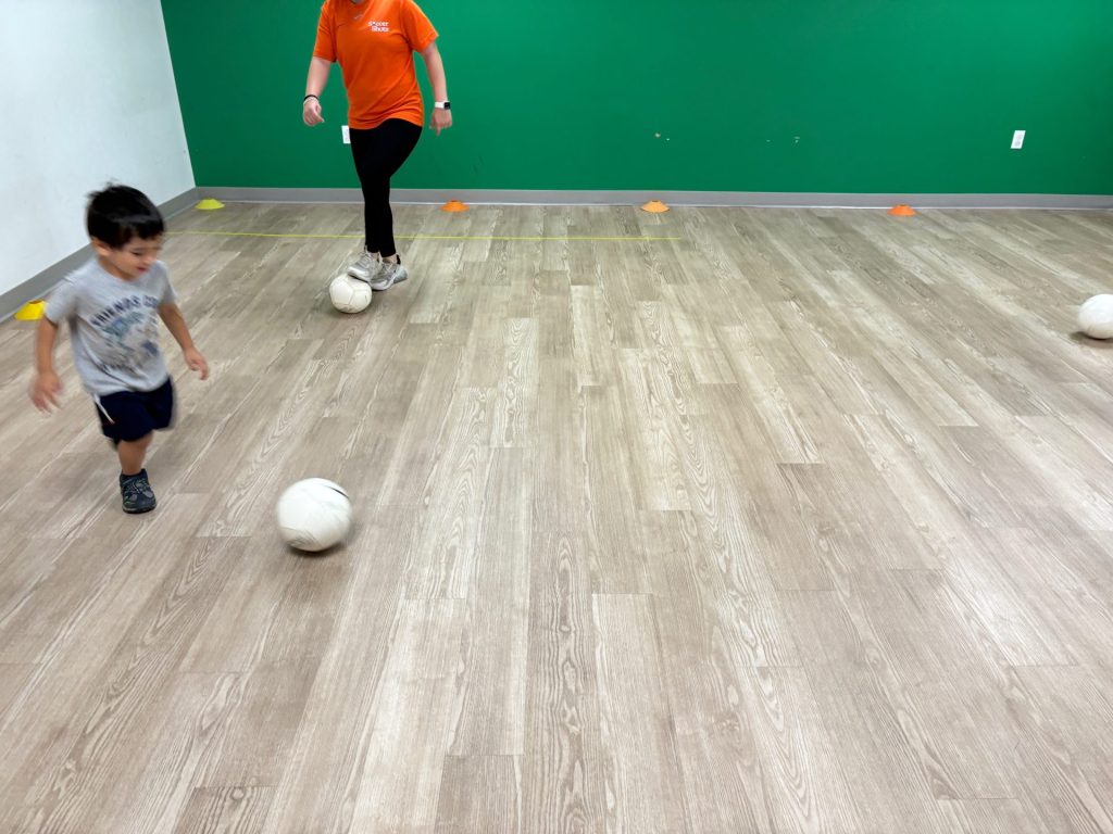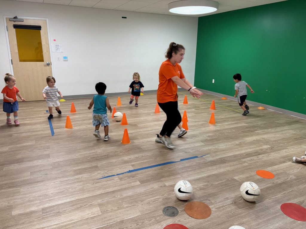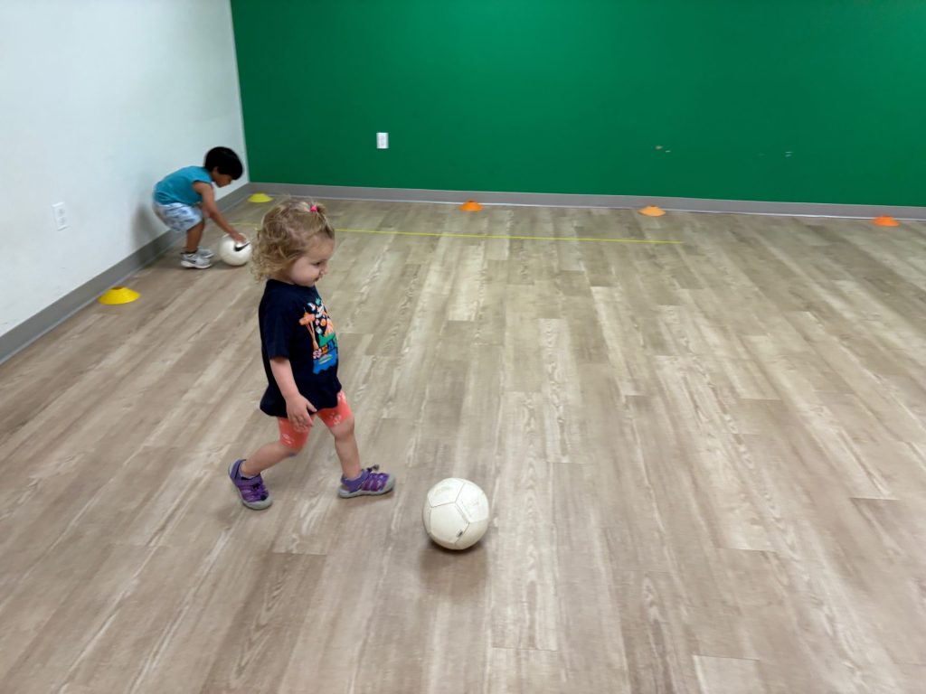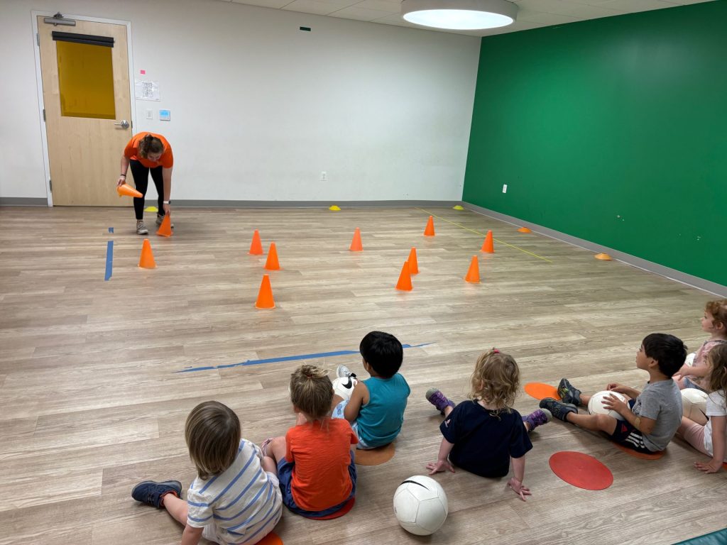 The children have been reinforcing skills they have learned so far this summer. These include the pull back, control, big kicks and the step over. They begin their session warming up, mimicking animal movements and navigating around traffic cones.