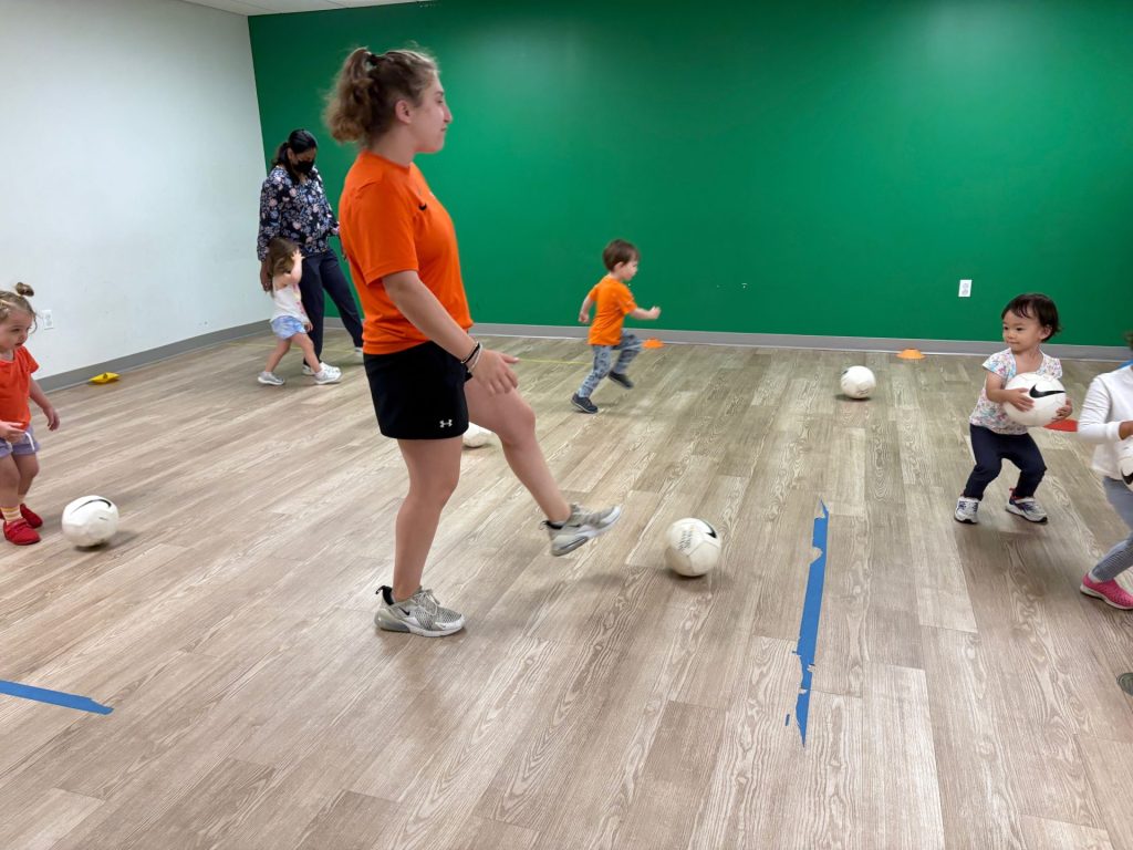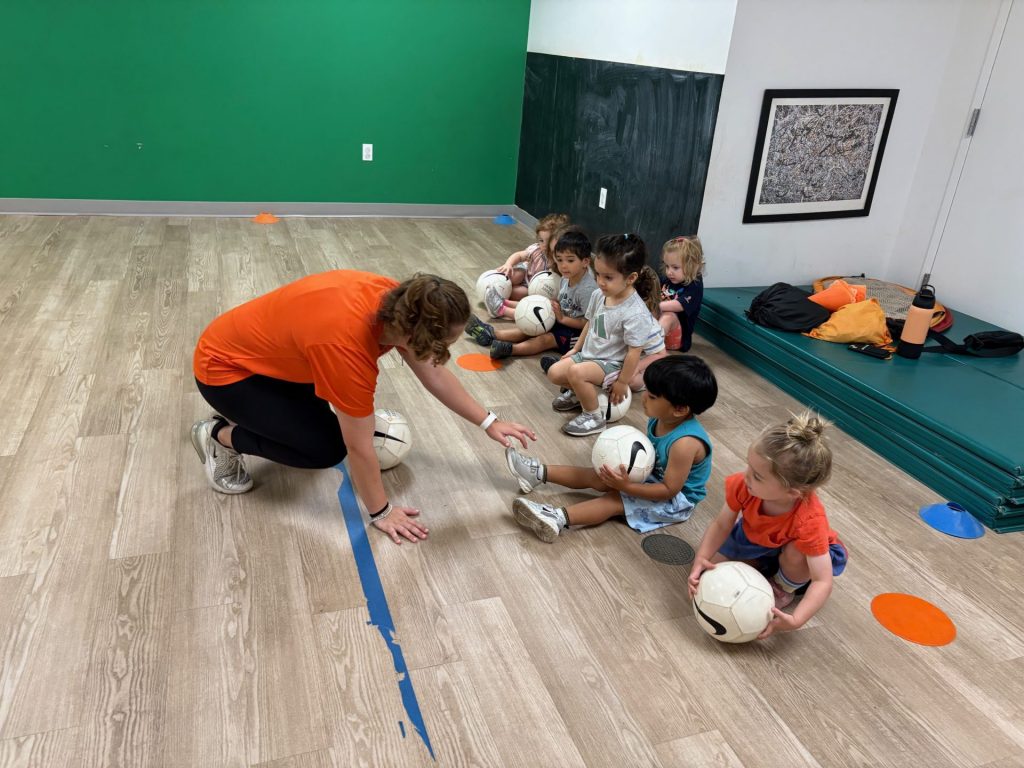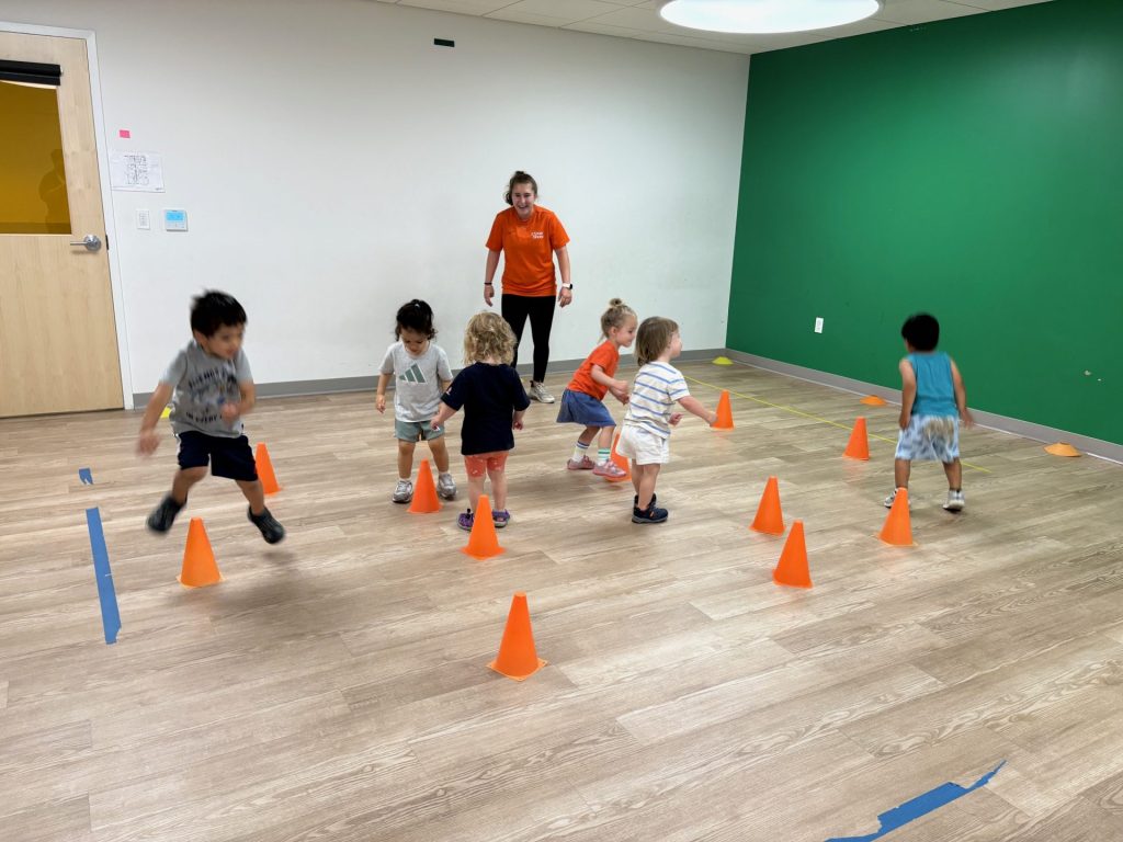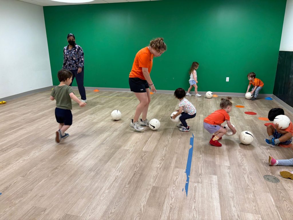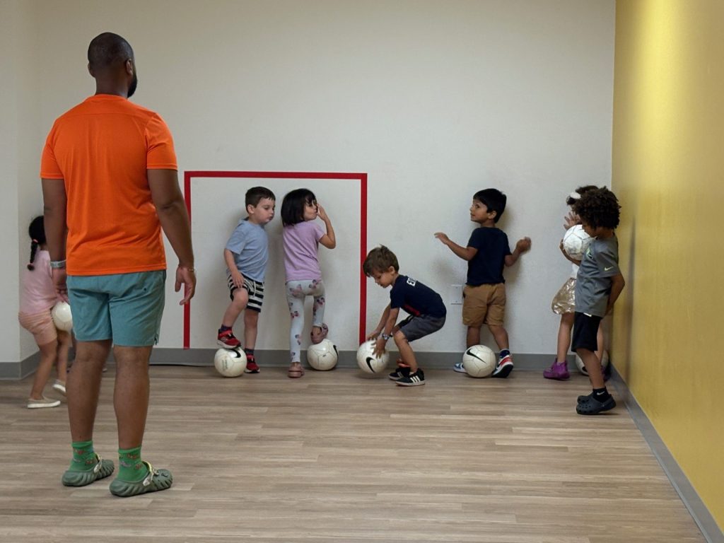 The children have been reinforcing skills they have learned so far this summer. These include the pull back, control, big kicks and the step over. They begin their session warming up, mimicking animal movements and navigating around traffic cones.